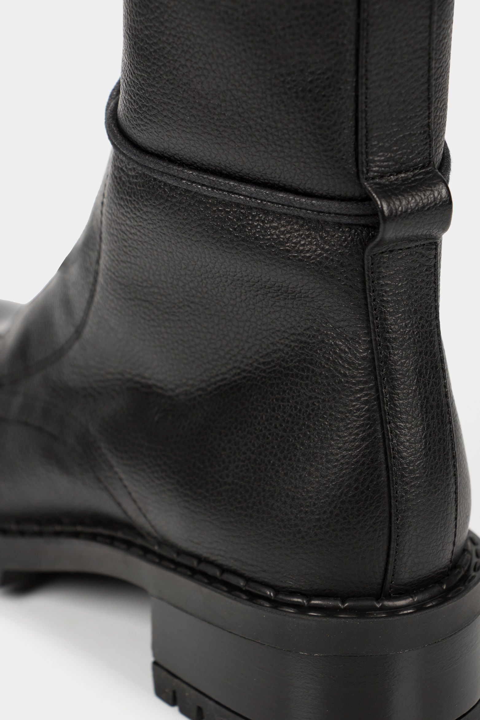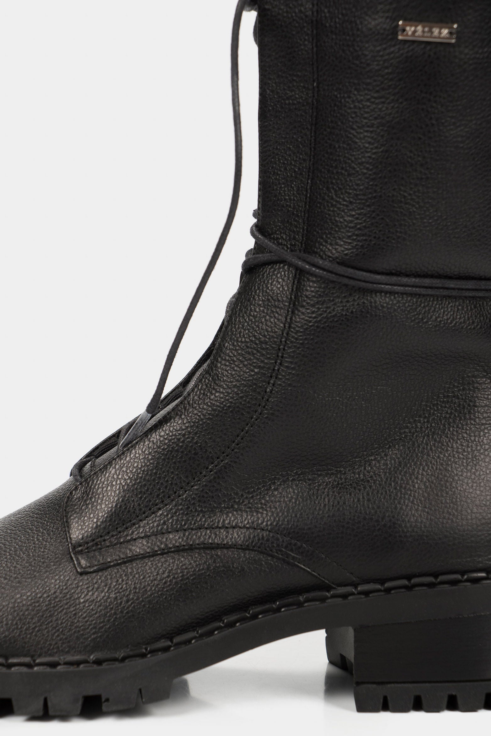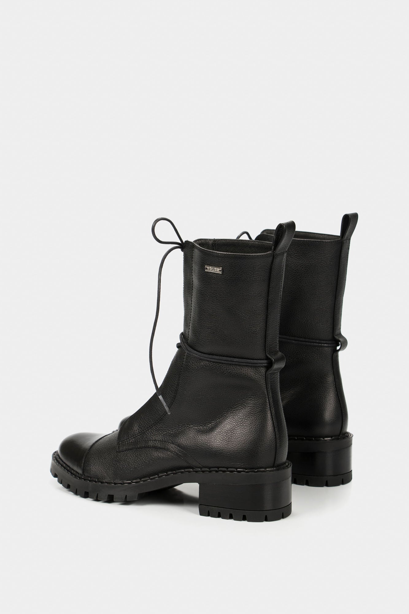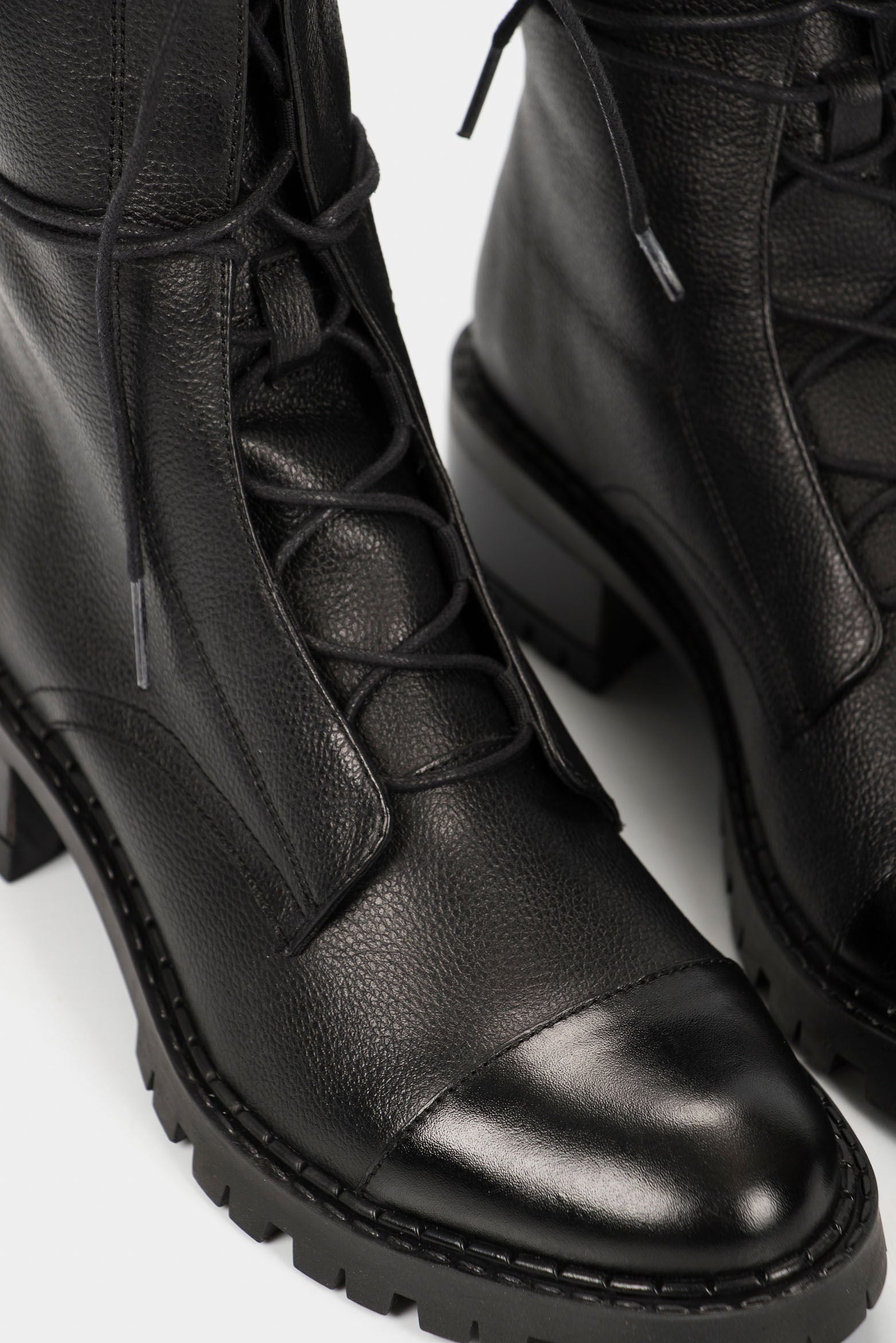 Crafted in textured leather with a smooth cap toe, these military-inspired boots are made for the bold, trend-forward woman. Effortless to style with skirts, jeans, or trousers for casual looks, they feature a sturdy, durable lug sole for confident wear. The laces can be wrapped around the collar or worn traditionally, adding a versatile touch to every ensemble.