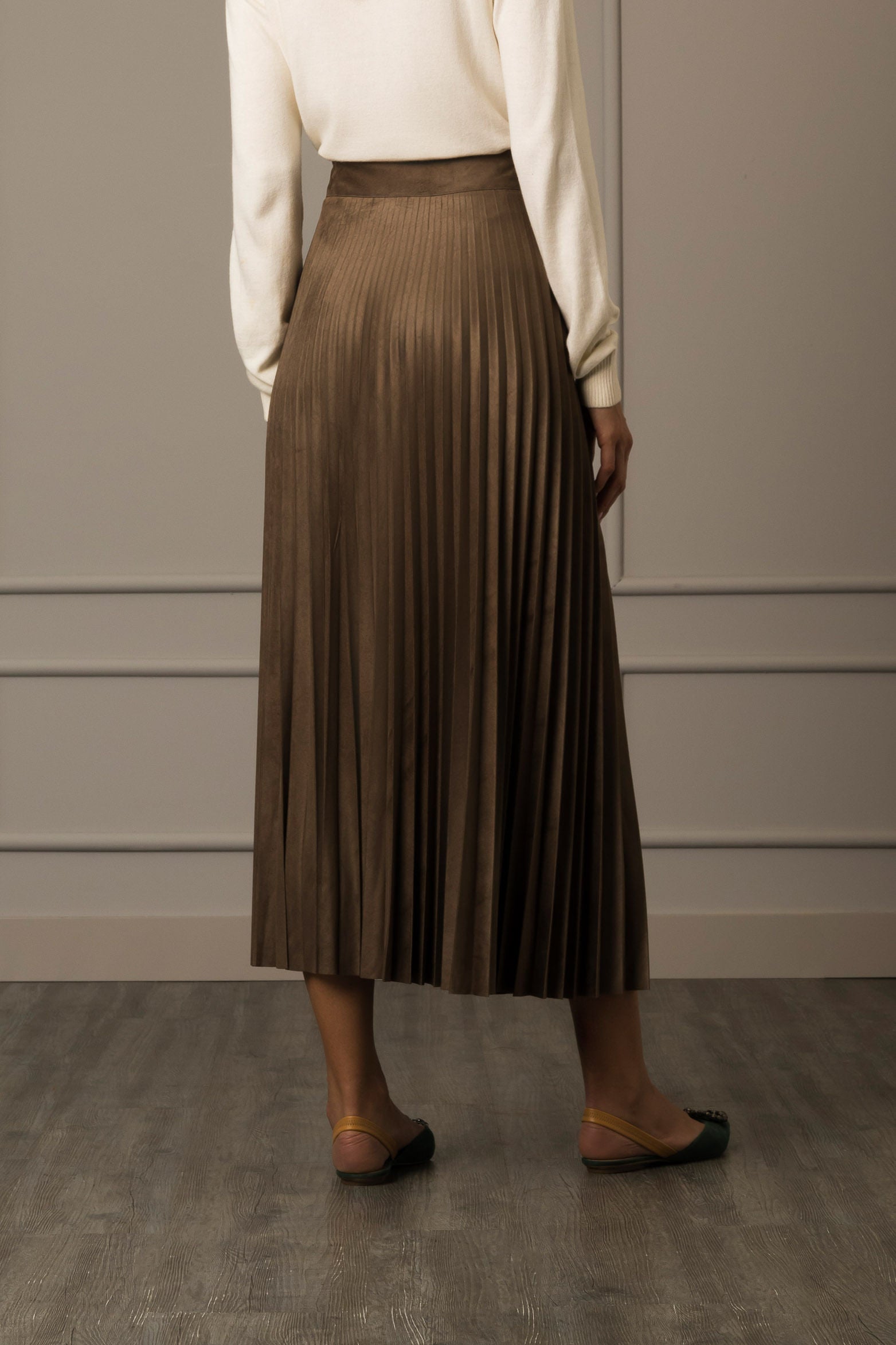 Our iconic pleated skirt in faux suede has been updated in this collection with an ankle length, making it a fashion must-have to suit multiple occasions. With a 2 inch waistband, concealed closure for adjustability and asymmetric hem, it’s perfect for creating casual looks. Pair it with sneakers and a T-shirt for a fresh and practical look, or with cowboy boots and a leather jacket for sophisticated, cold- and mild-weather looks.
