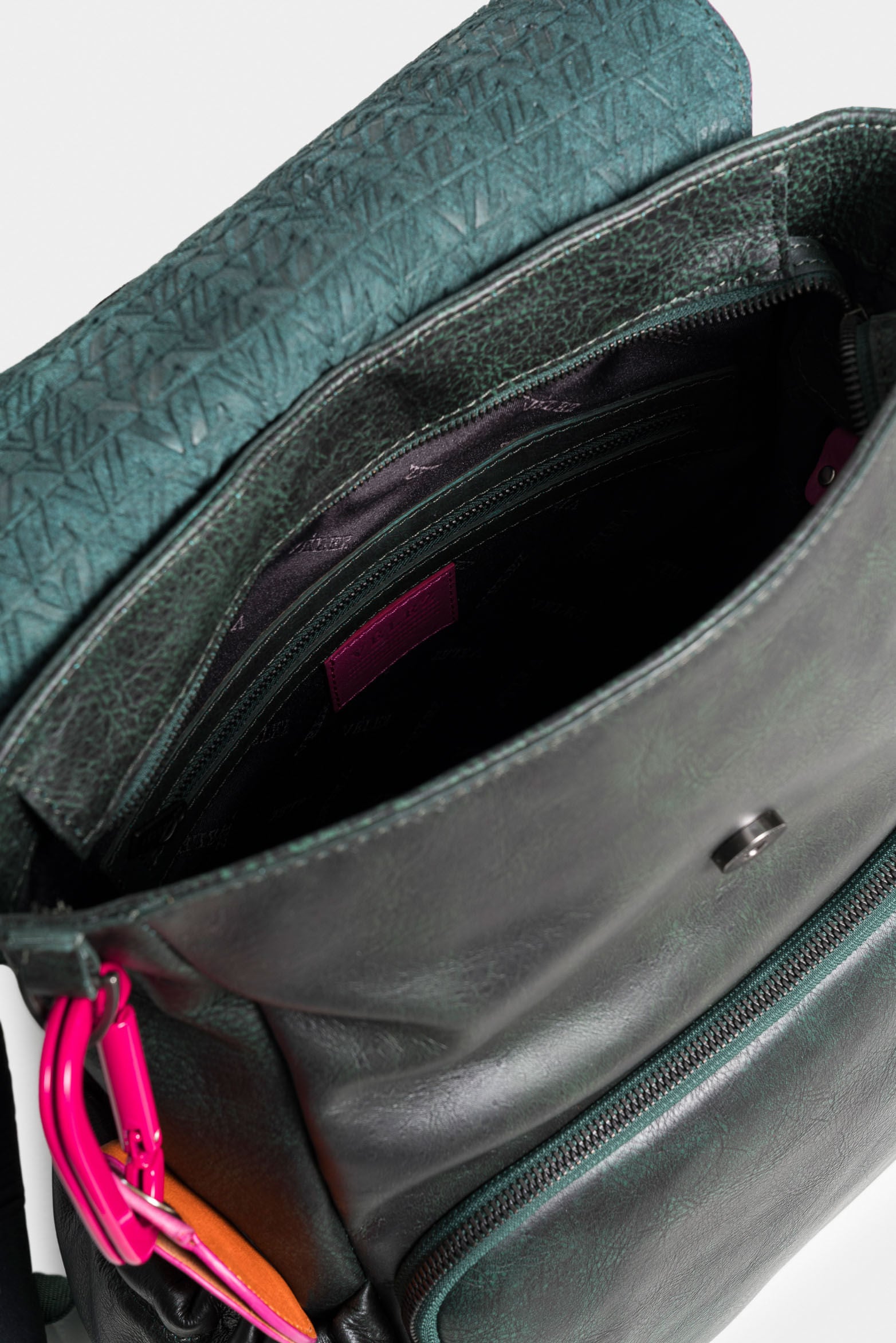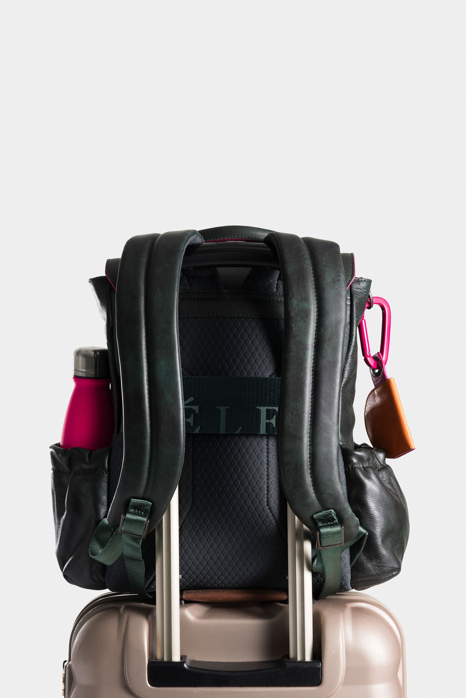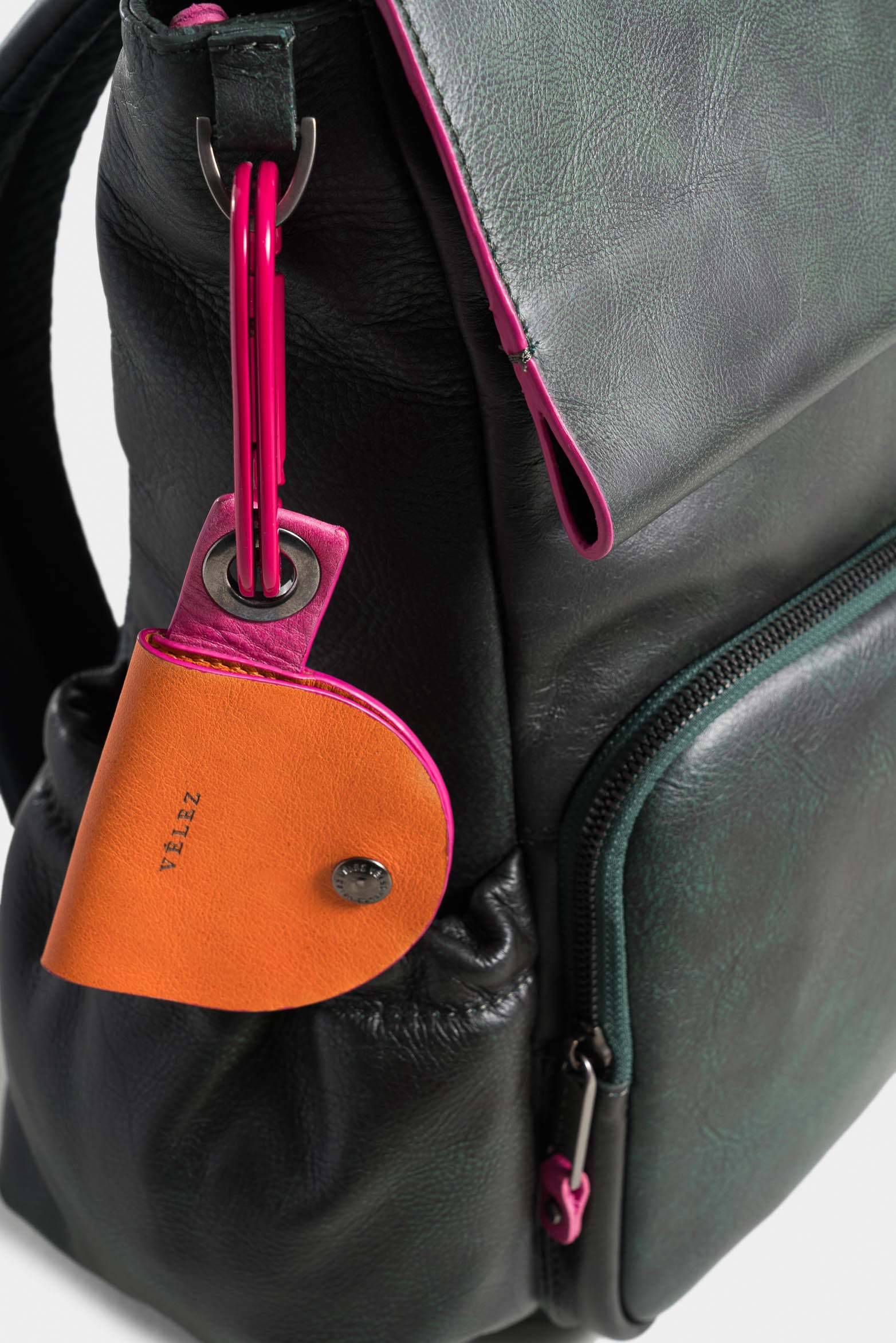 Leather backpack with handcrafted finish featuring a snap-closure flap. This design features a front pocket with metal zipper closure and a main compartment with internal pockets. On the sides, it has elastic pockets and comes with a thermos and a removable coin purse attached with a carabiner, making it an everyday accessory that adapts to the needs of today’s avant-garde woman. It also features contrast dye and zipper pulls, and its straps are adjustable and padded, ideal for an urban explorer look. Pair it with cargo pants, ankle boots, a top and a cap to accessorize.
