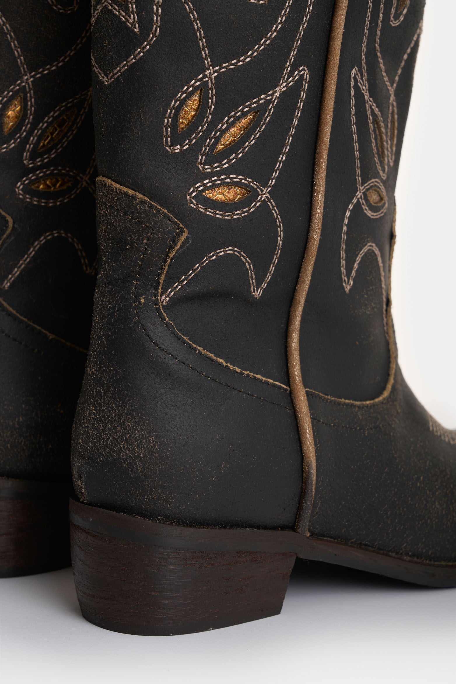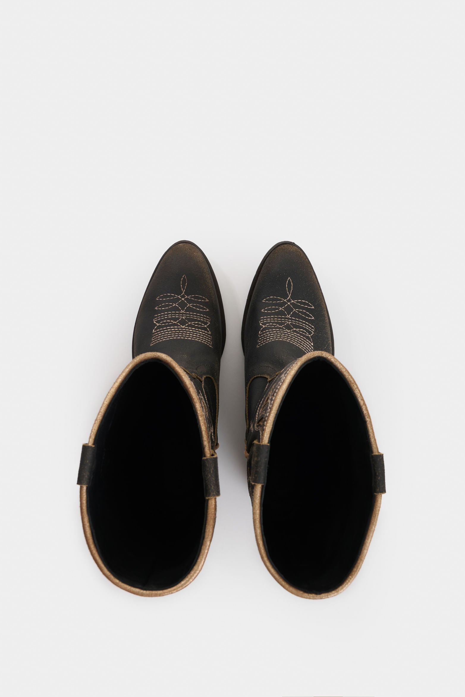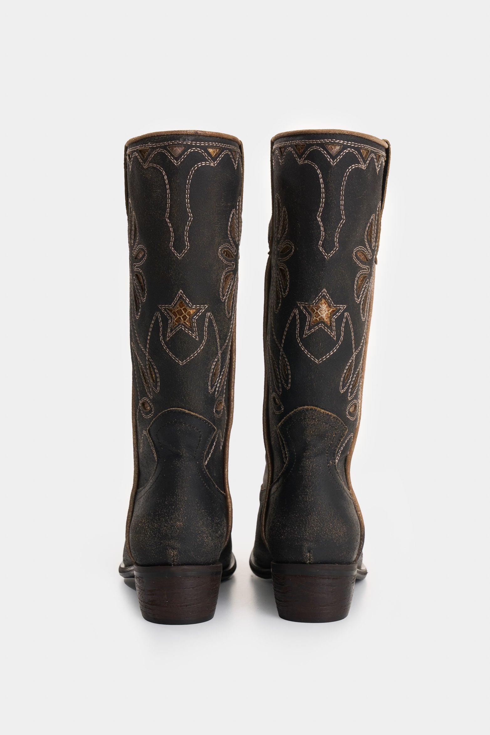With textures that complement each other to create a unique visual richness, these high-leg boots combine rustic charm with a modern edge. Crafted in smooth, vintage-look leather with folia appliqués, they highlight the value of handcrafted work and the durability of leather. Their aged wooden heel and contrast stitching add bohemian touches. Timeless and versatile, they are ideal for wearing with shorts, maxi dresses, or your favorite outfits.