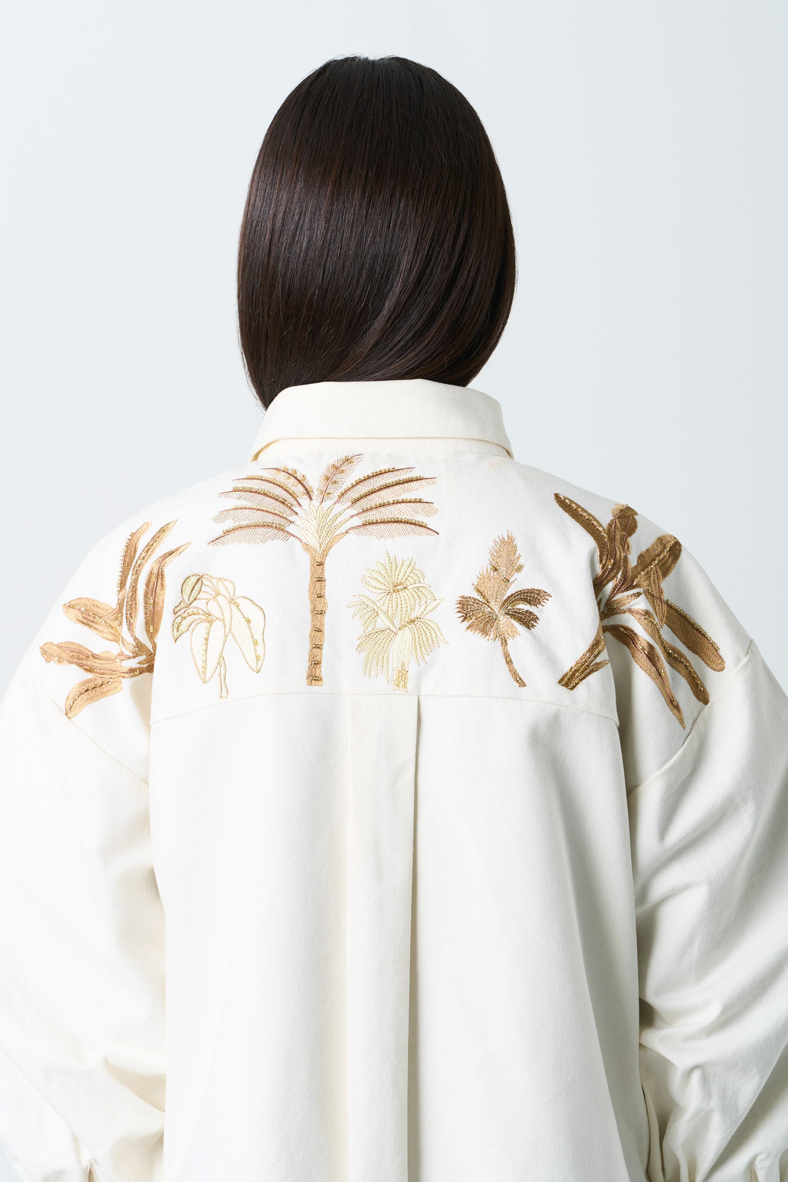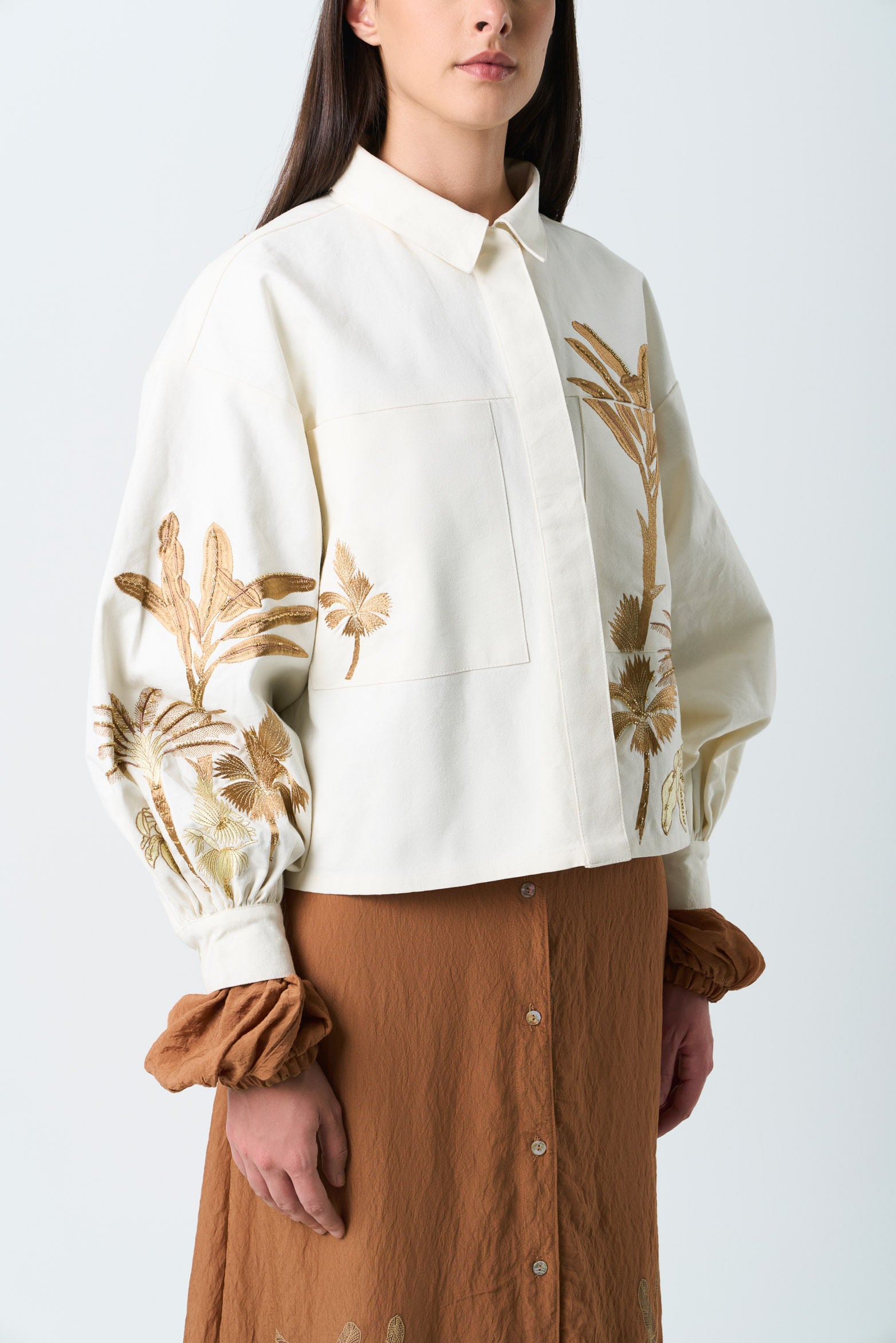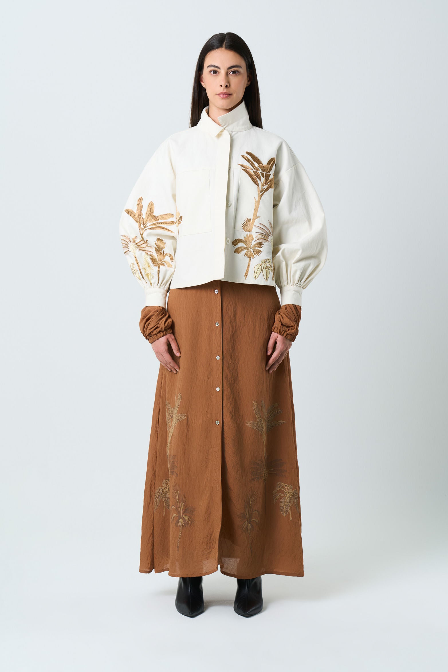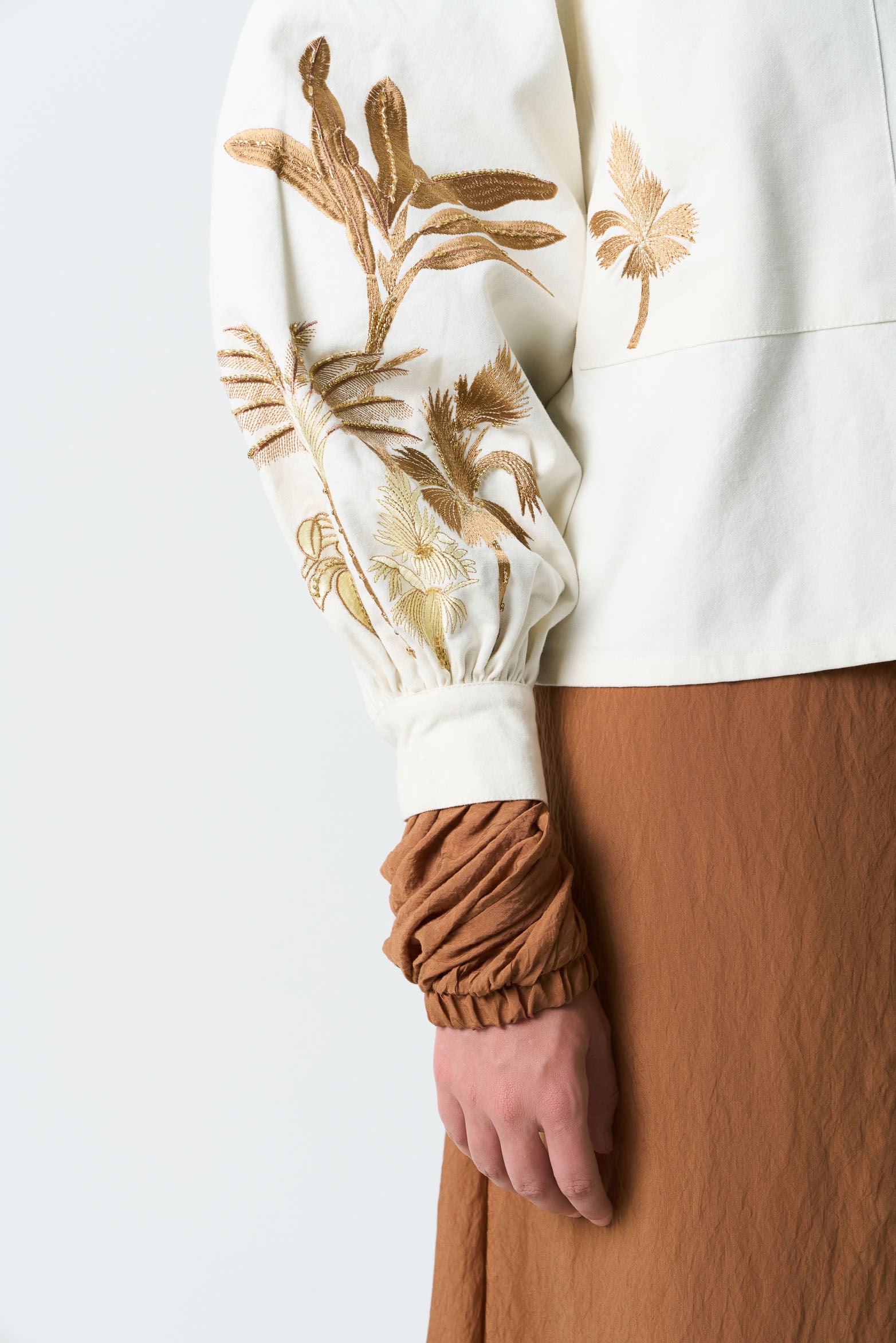 With an oversized silhouette and a design inspired by the natural charm of the mangrove, this jacket is a work of art that complements your total look with elegance. Hand-embroidered details in golden threads enhance its structure, while puffed sleeves and a shirt collar add an elevated touch. Perfect for wearing with maxi skirts or jeans, its artisanal essence and stylized volumes bring a unique and sophisticated character.