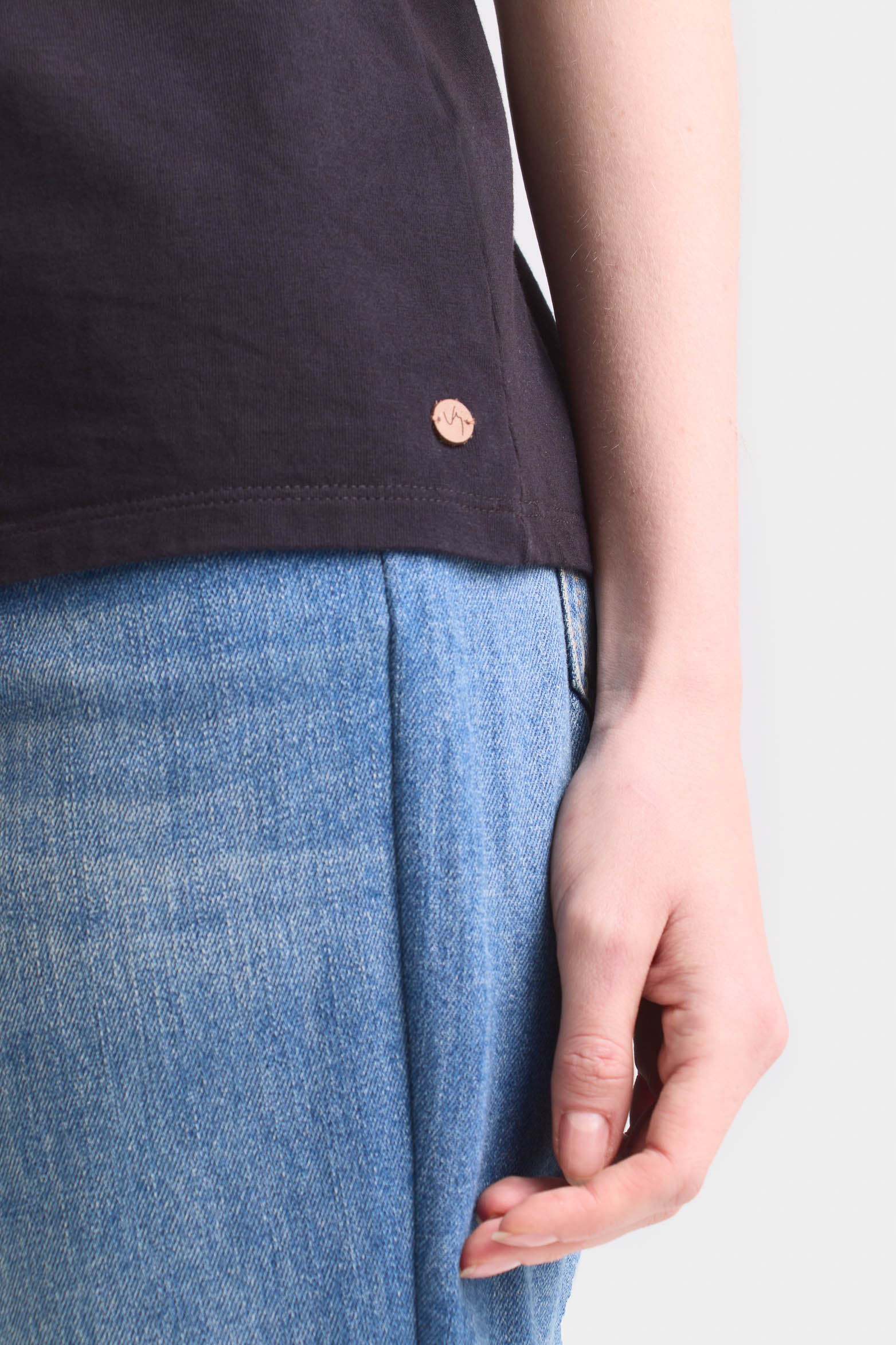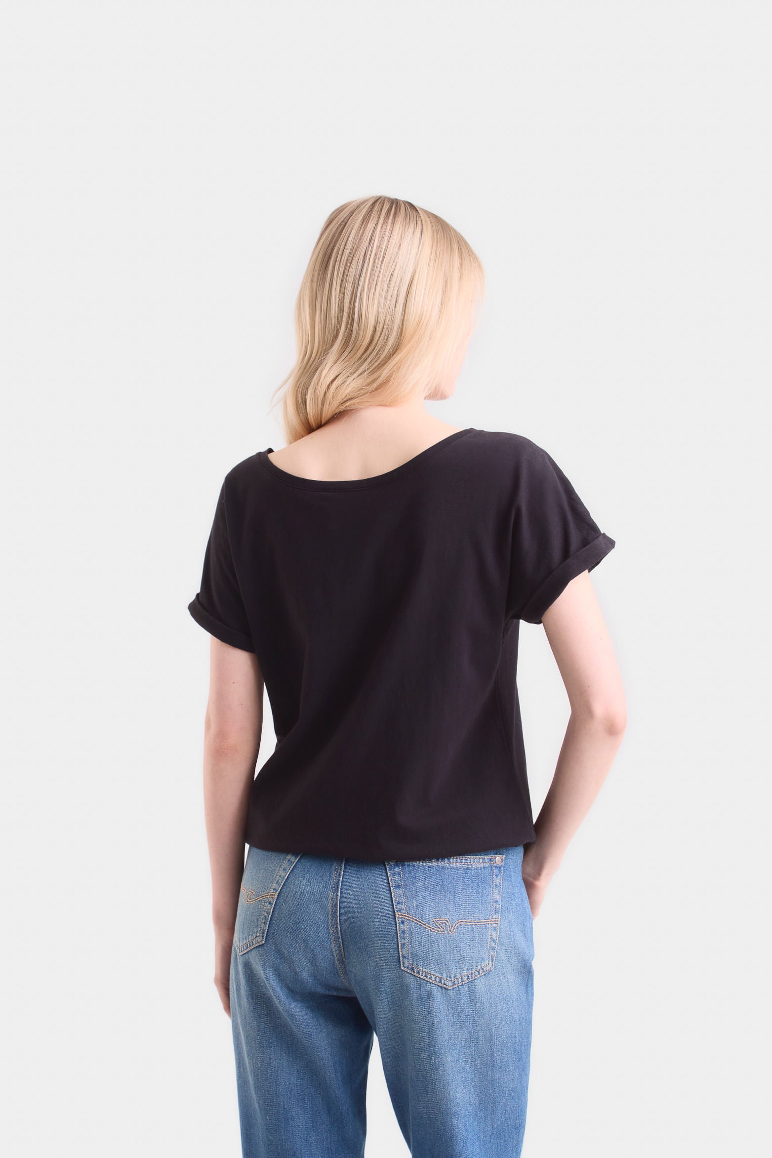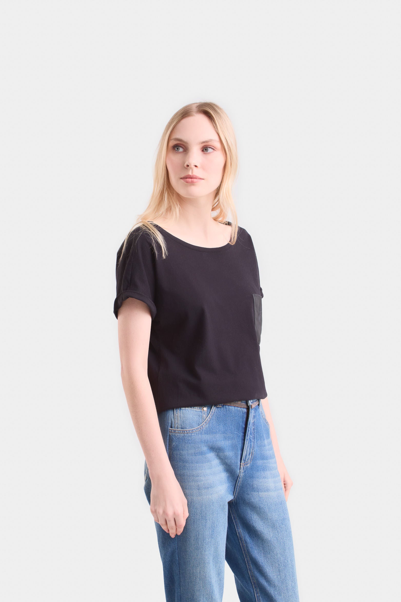 This short-sleeve blouse brings modernity to basic silhouettes, designed to offer a renewed look. Made from smooth fabric, it's comfortable and versatile, with the leather pocket detail on the front adding a stylish touch.