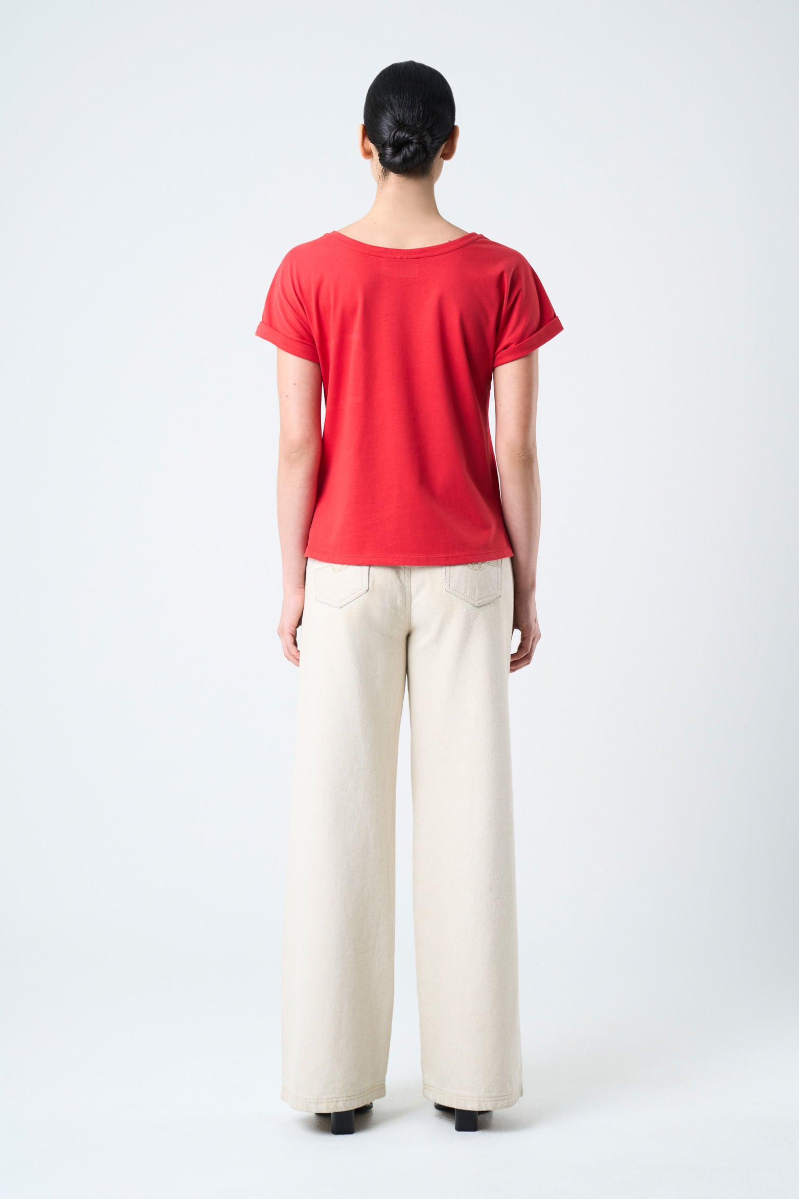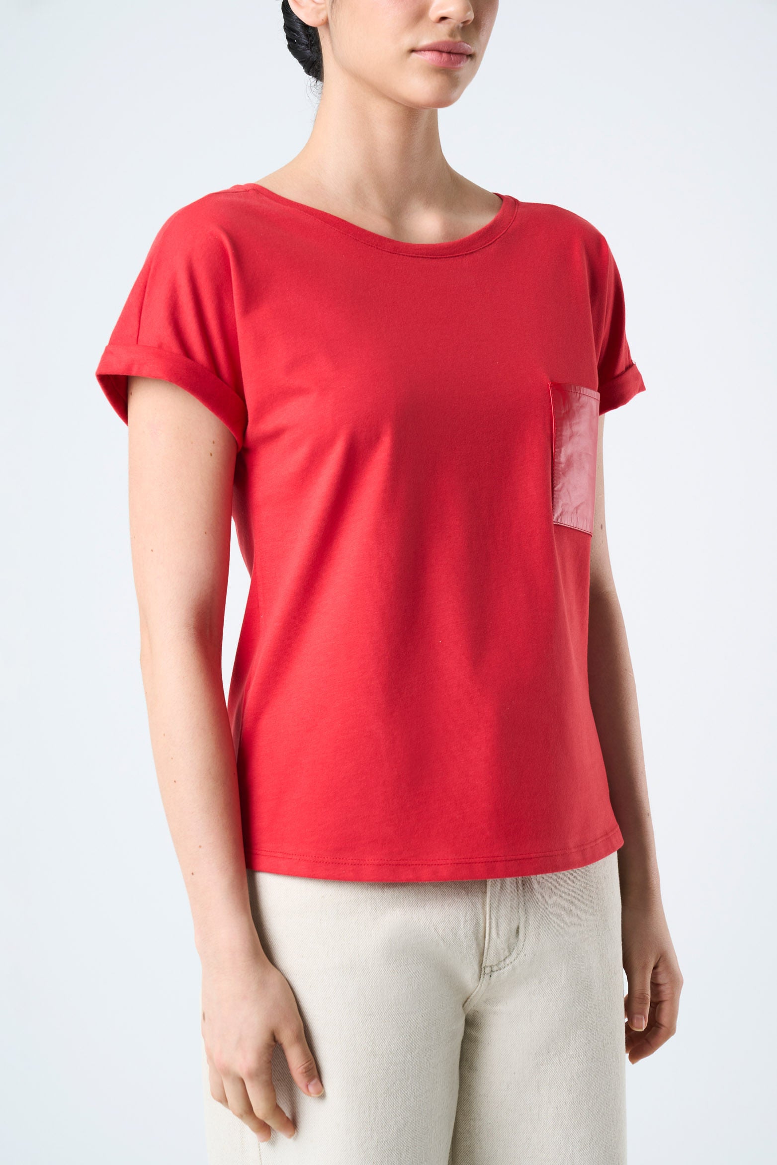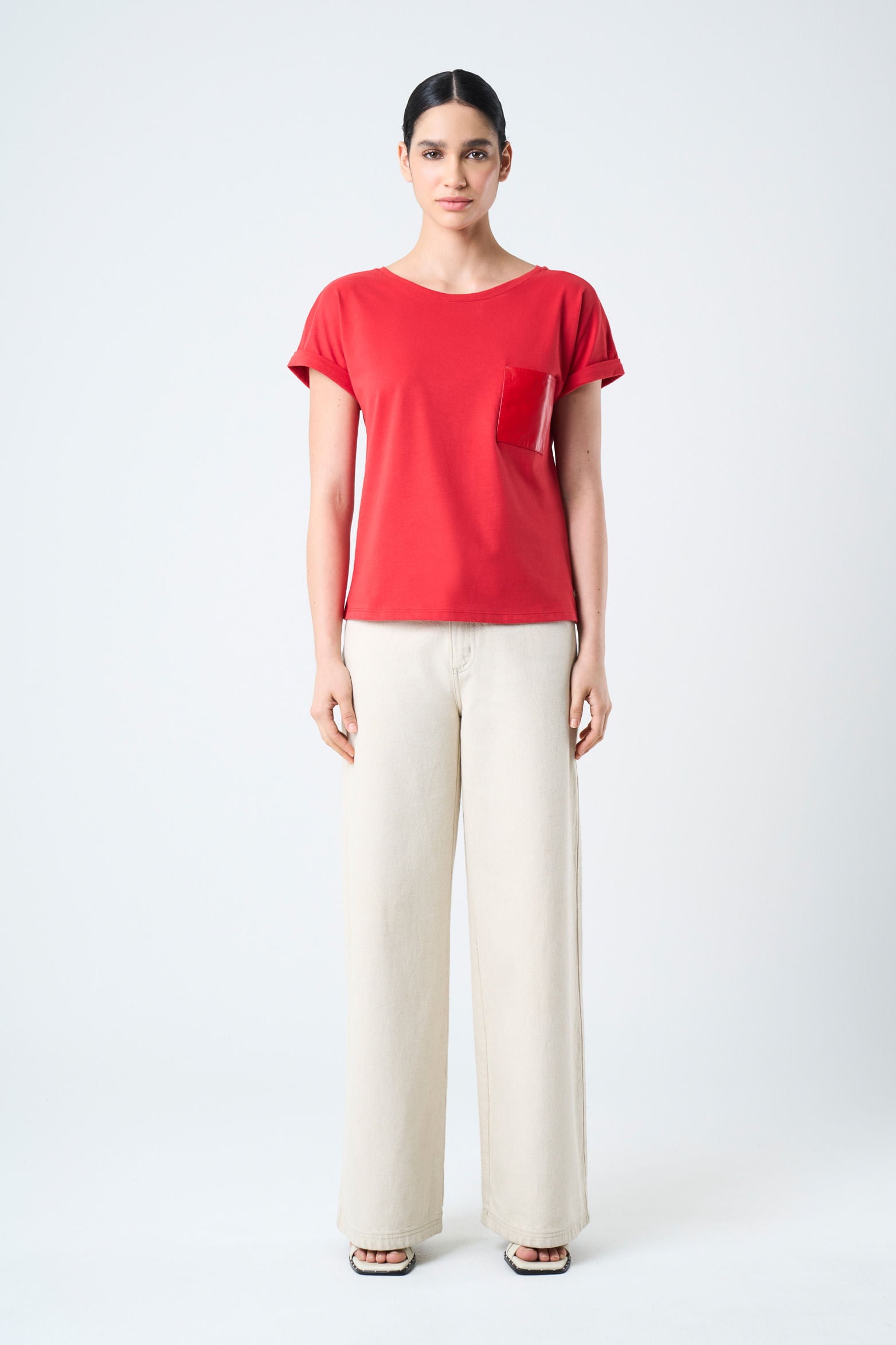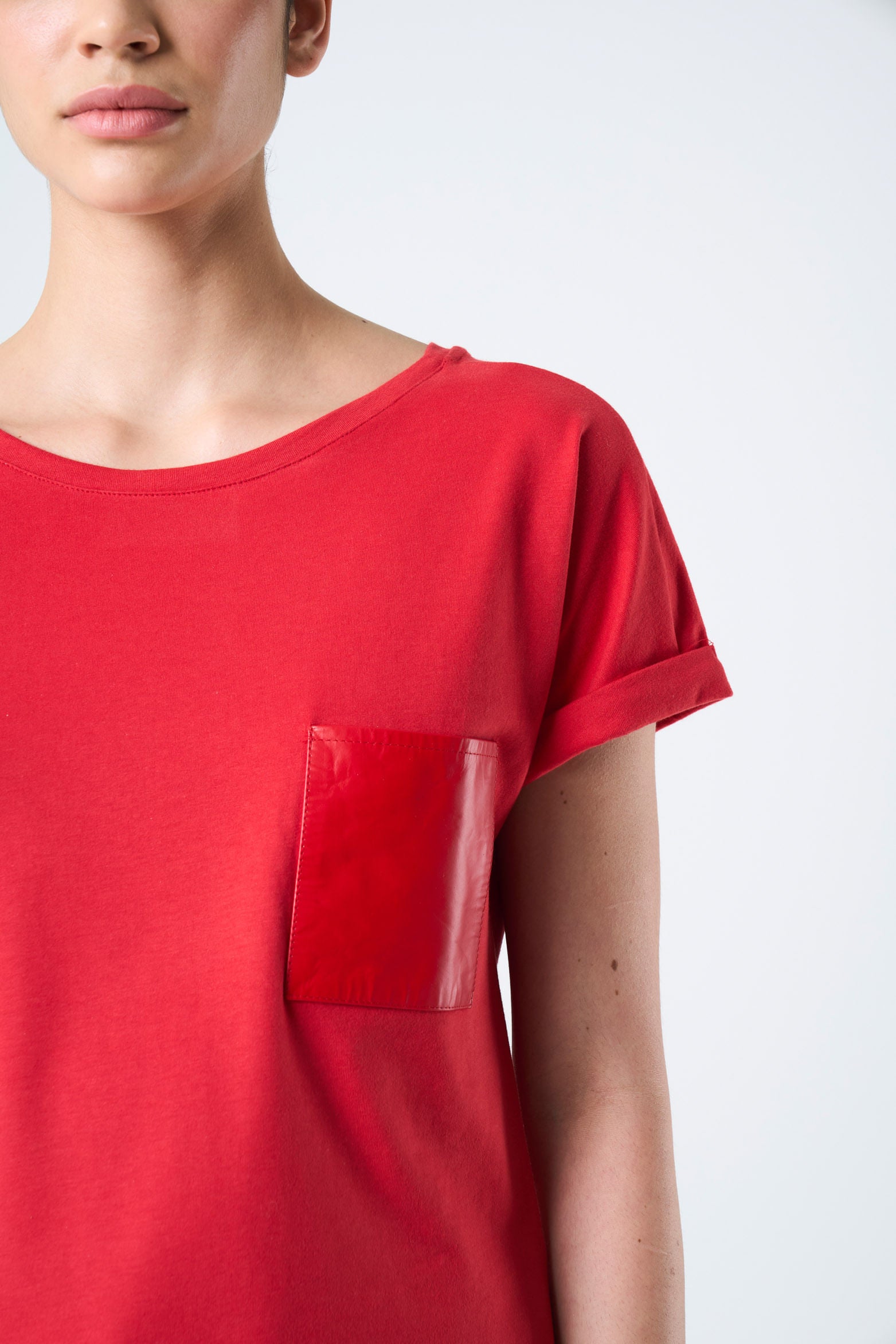 The epitome of comfort resides in the simplicity of basic silhouettes made anew. Our t-shirt in punto liso knit fabric renews the everyday through the detail of a leather pocket on the chest. Its short sleeve design is versatile and comfortable, an essential casual piece for day-to-day wear.
