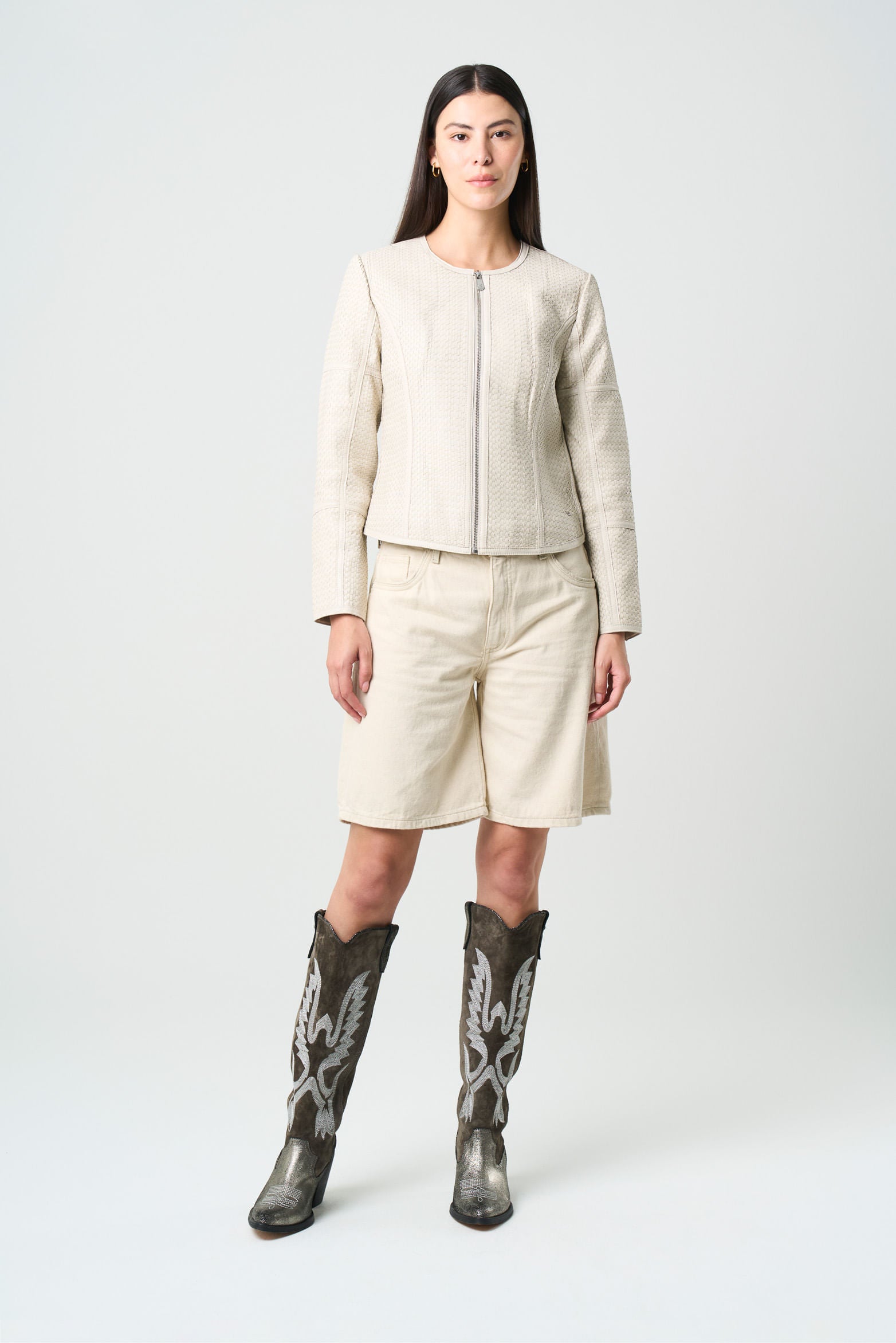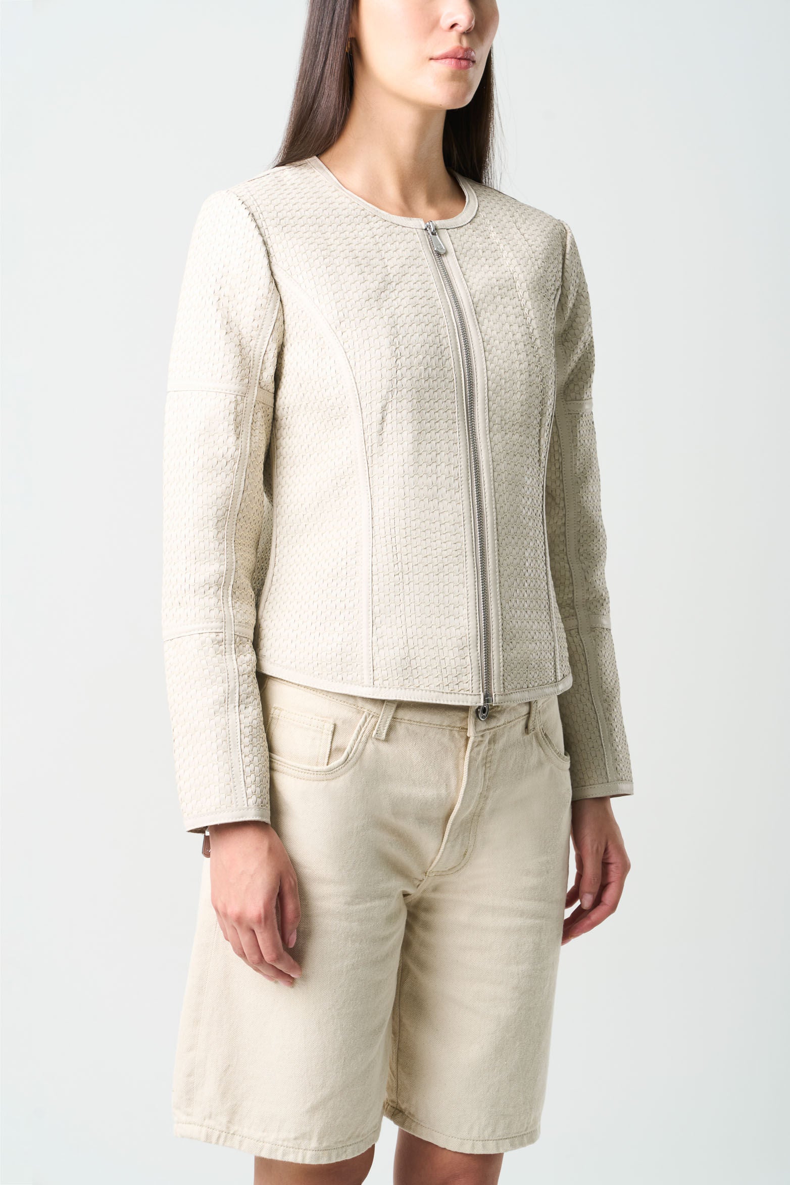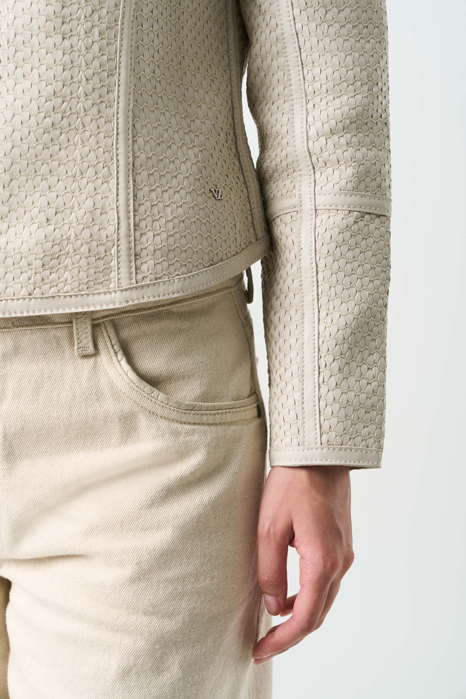 Women's Woven Leather Jacket, a design featuring handcrafted woven leather and structural cuts for a more anatomical and flexible silhouette. Imported from India and crafted from the world's finest lambskin, this piece offers an exceptional feel. A product bearing the hallmark Vélez quality, ideal for casual occasions.