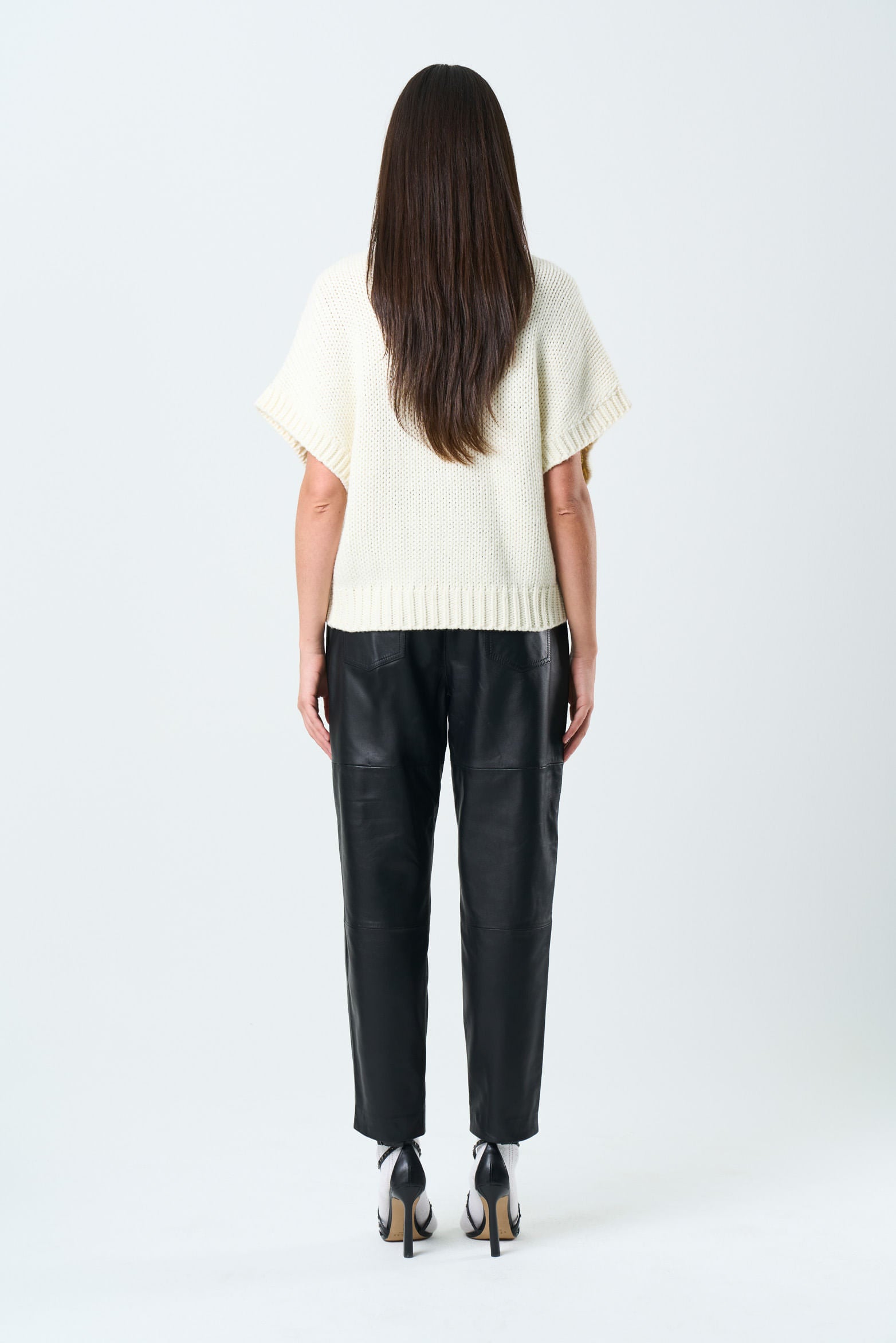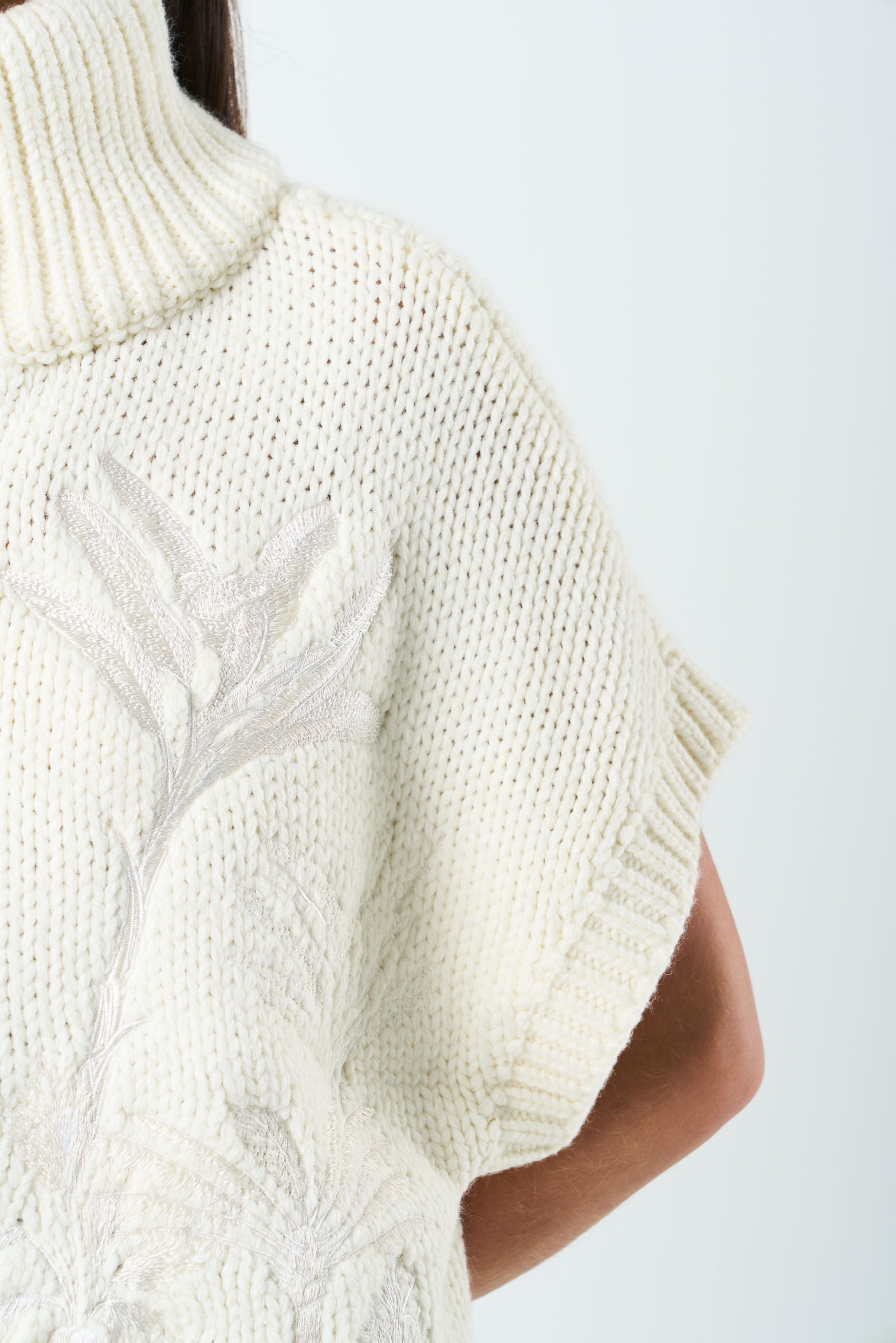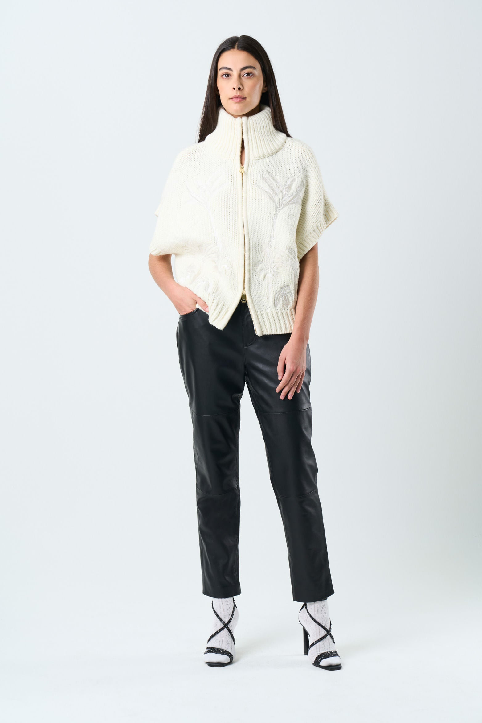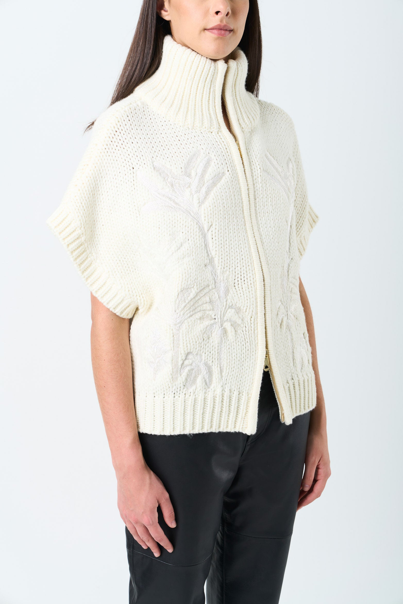 This sumptuously soft, oversized vest is a luxurious addition that elevates any outfit, from casual to semi-formal. Featuring a high neck and metallic zipper, it's highlighted with handcrafted golden embroidery. Ribbed detailing at the neck, waistband, and cuffs adds a clean, sophisticated touch, making it the perfect complement to a delicate and enchanting look.