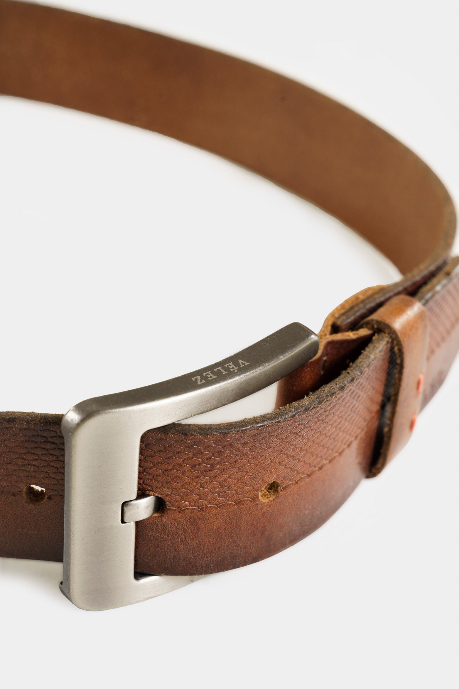 Men's leather belt crafted with texture and an antique edge finish, paired with a polished buckle for an elevated daily or casual office ensemble. Features a 40 mm black nickel buckle, ideal for various occasions, with multiple color choices.