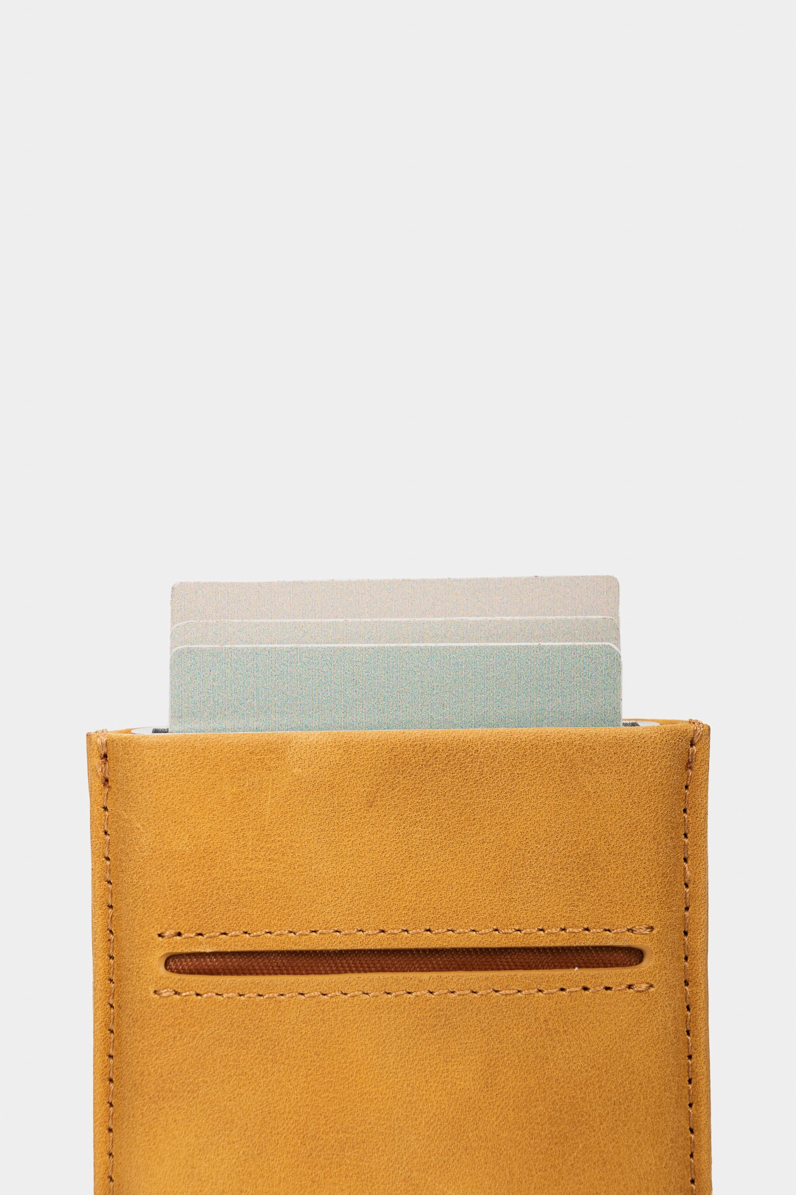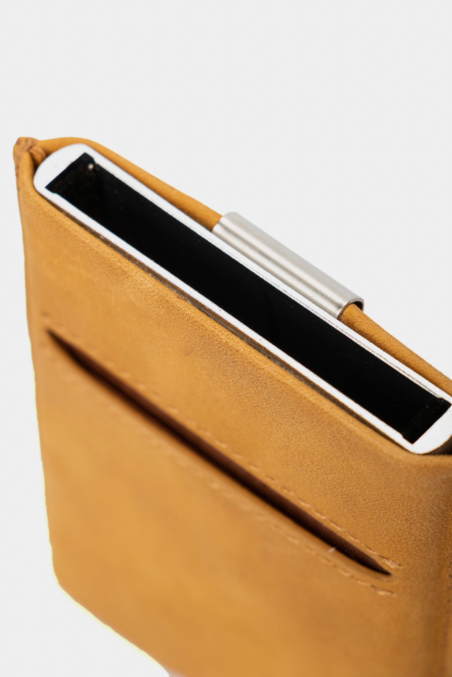 A tech-forward small leather good designed to streamline your day. Wrapped in leather, its aluminum core houses a bill compartment and multi-card holder. Ultra-light with an ergonomic magnetic closure, it features a quick-access push button for effortless card deployment.