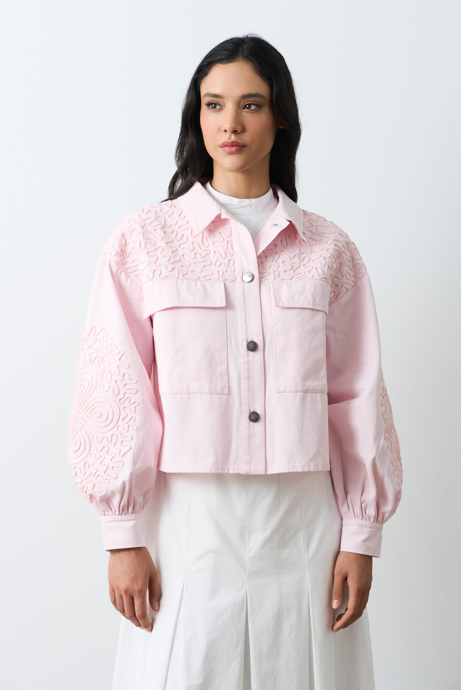 Oversized trucker jacket with balloon sleeves crafted in woven fabric. This statement piece is elevated through tone-on-tone curved embroidered shapes in suede-like fabric, creating a delicate visual effect and turning the jacket into an expression of artisanal luxury. It features a shirt collar, button placket, buttoned cuffs, and oversized patch pockets with flaps. Ideal for stylish looks in mild weather—wear it with a fitted top and high-rise pants.