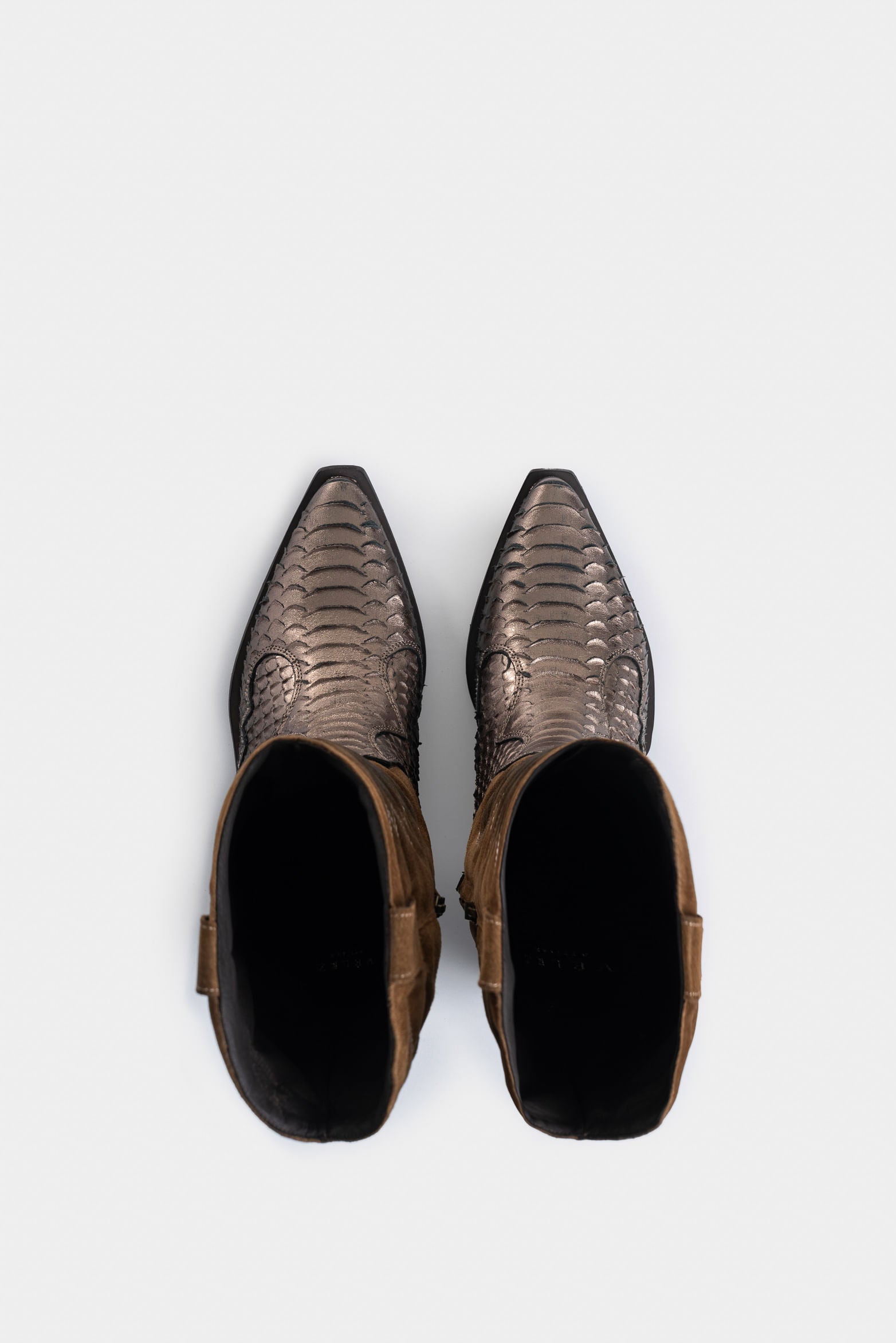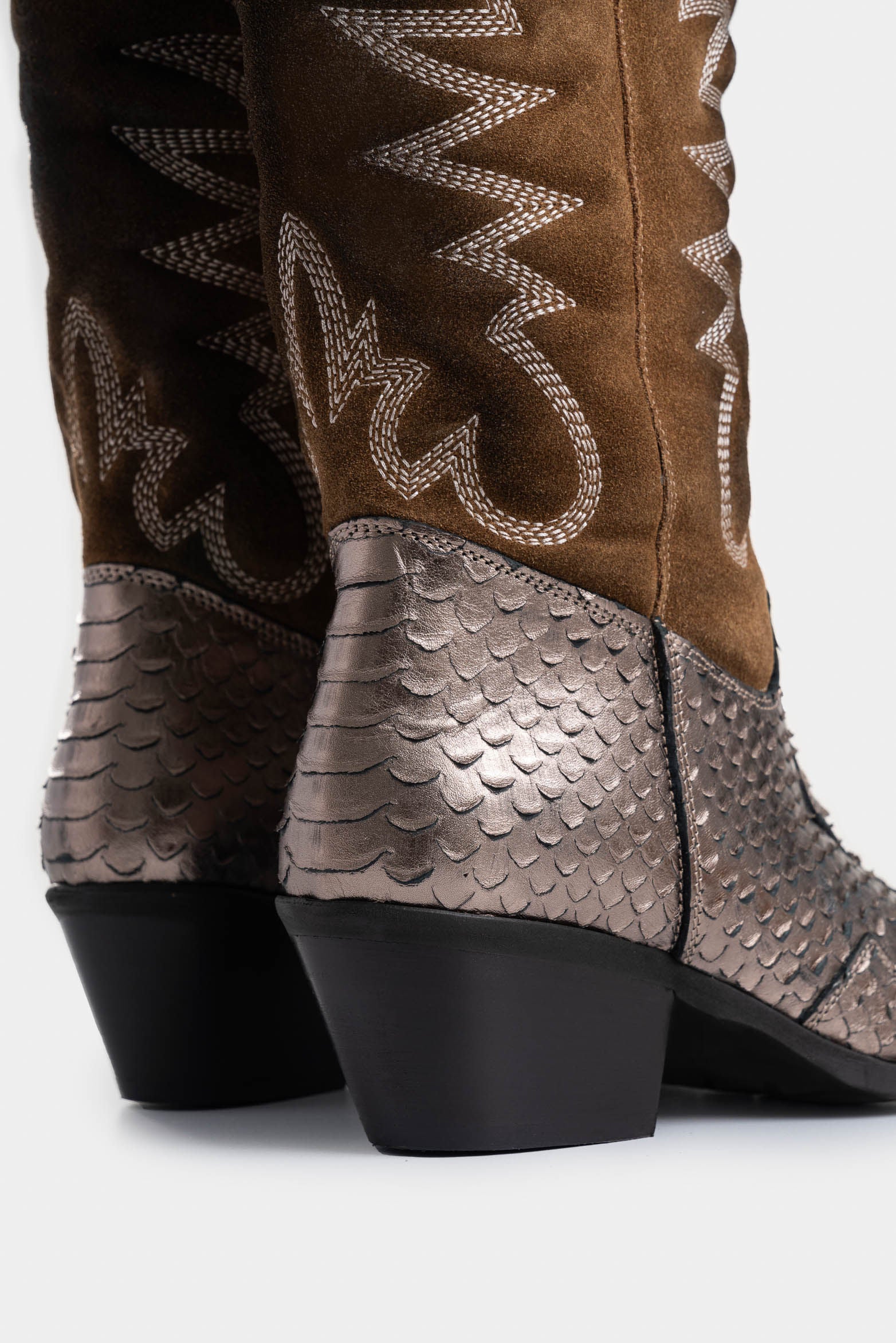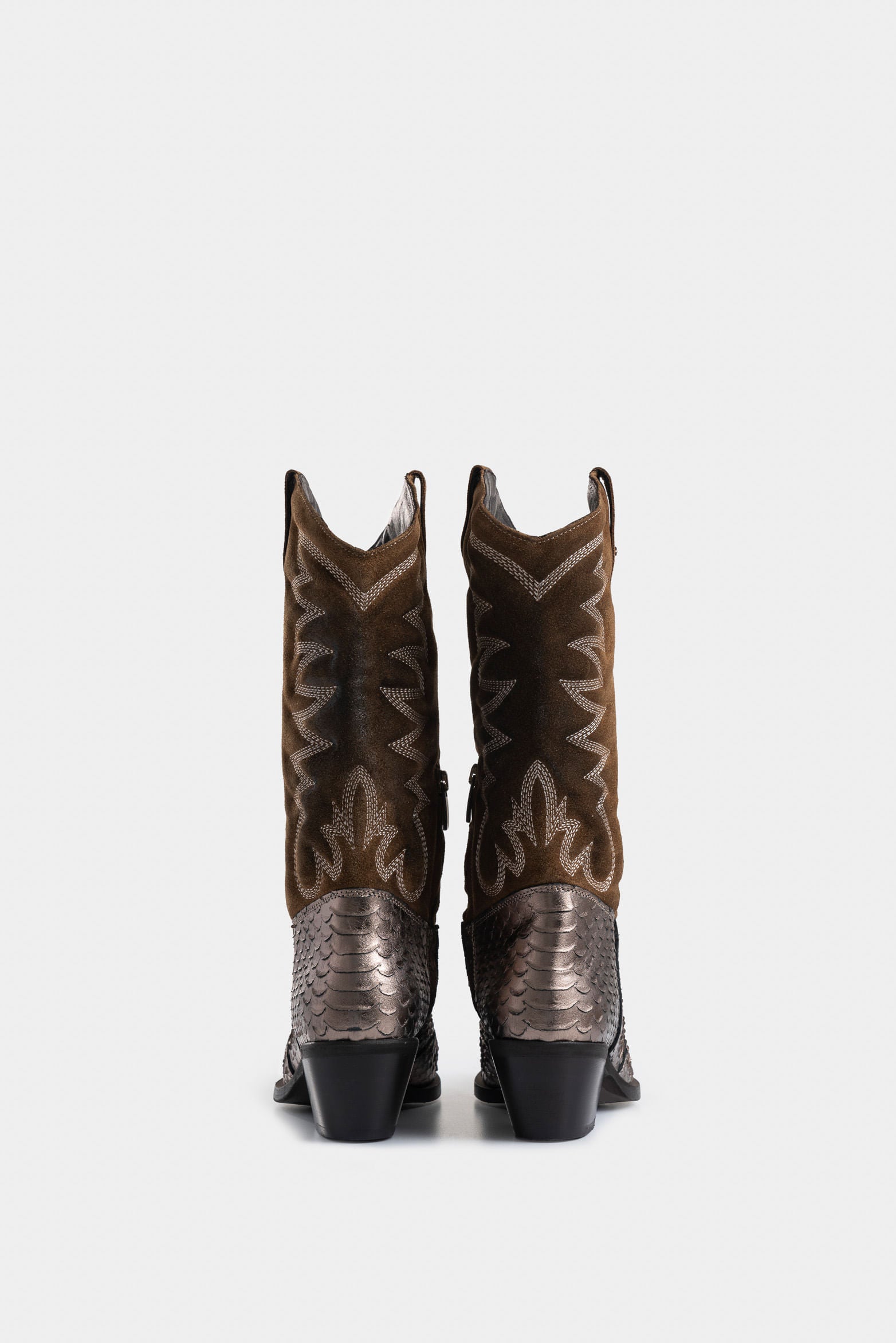 Crafted in leather with a waxed suede scale plate, these Western-style boots stand out for their individual expression and unique style. Perfect for enhancing elevated and sophisticated outfits, they blend a retro and avant-garde touch with luxurious artisanal details. The internal side zipper and decorative stitching on the shaft add functionality and charm. With a rustic-looking sole and leather lining, this handmade design transforms any look with distinction and character.