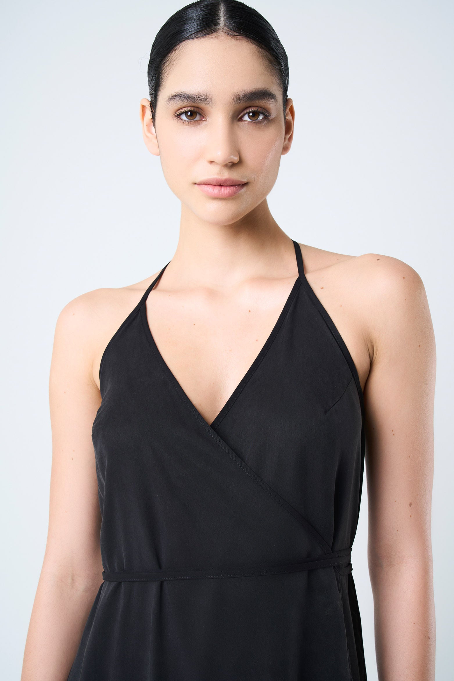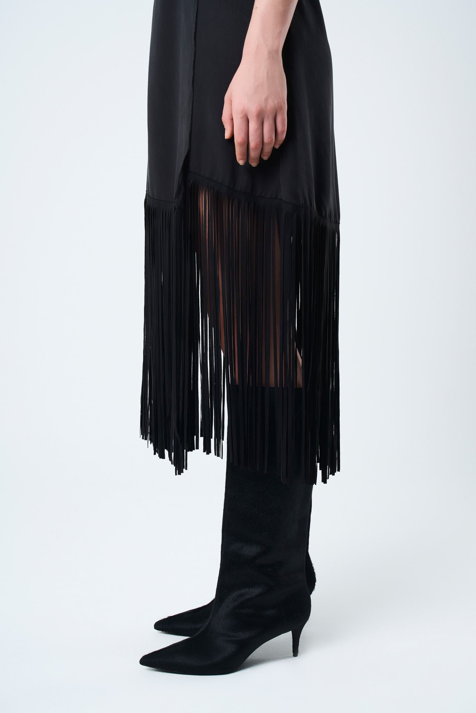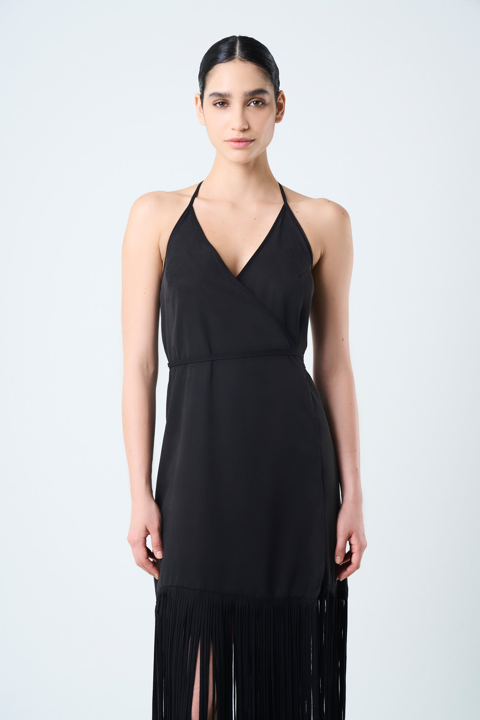 Style and delicacy define this strap dress, crafted from flat fabric with a V-neckline and wrap silhouette. The fringed hems made of suede-like fabric add a soft touch that enhances the silhouette. Perfect for a casual look with flat sandals or sneakers, or an elegant event with Texan boots and heeled sandals. Its floor-length and tie closure make it a versatile and feminine piece.