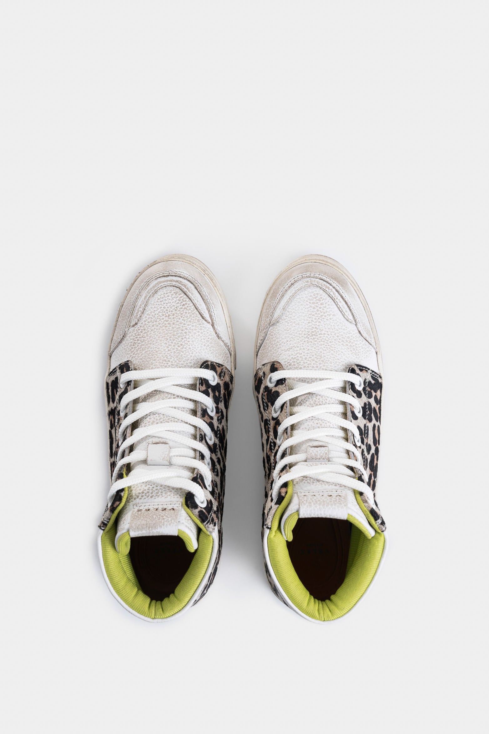 With authenticity and avant-garde as our cornerstones, our high-top tennis sneakers stand out for their distinctiveness, encapsulating an innovative vision. Made with the commitment to comfort, these boots, crafted in white and ash leather, feature an animal print graphic that evokes a cozy texture and a contemporary aesthetic. The audacity of an animal print on clean leather sublimates the freshness and creativity of this style. These sneakers are the reflection of the ADN Velez; a symbiosis of resistance, innovation, and contrast that is echoed in every element of the piece.
