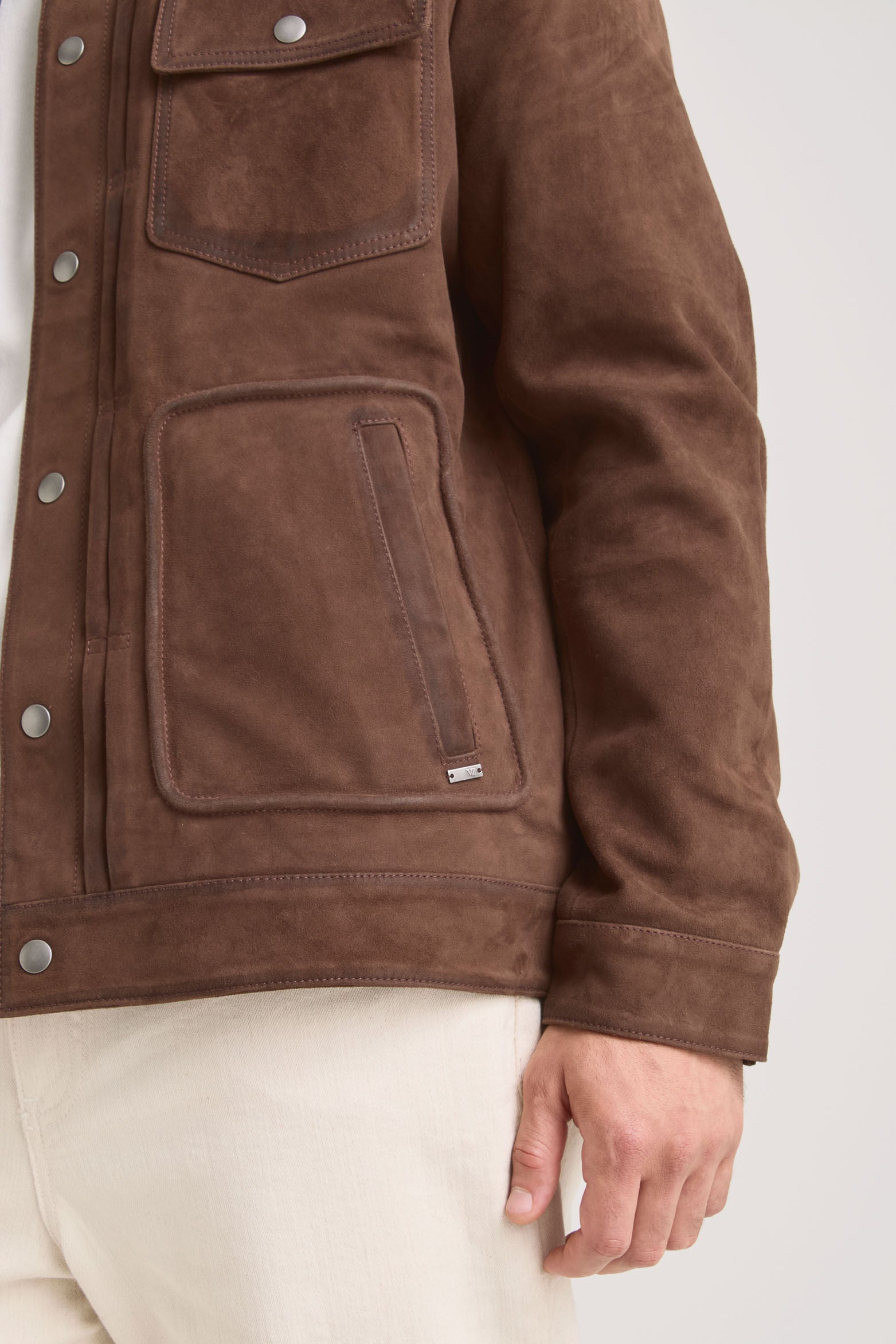 Our Aron trucker jacket in unicolor soft and light suede is a modern essential from Vélez, featuring fine finishes like a stylish leather collar and diagonal zippered front pockets, which accentuate its attractive design. This piece is a perfect blend of functionality and style, offering spacious interior pockets for your essentials and a modern touch to any look with its structured fit and meticulous craftsmanship.