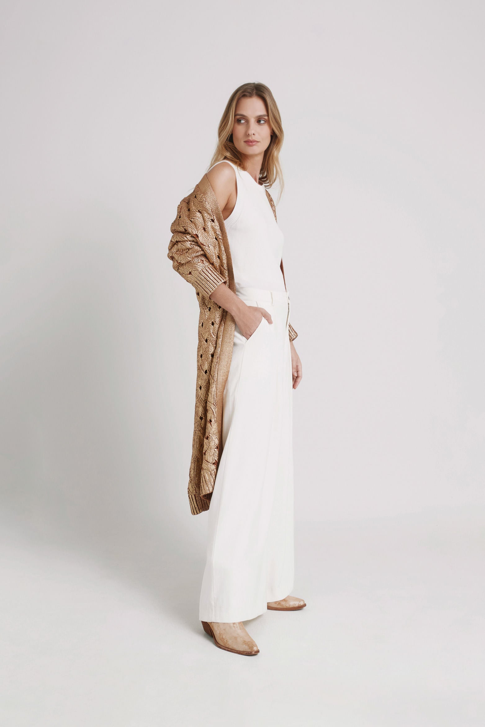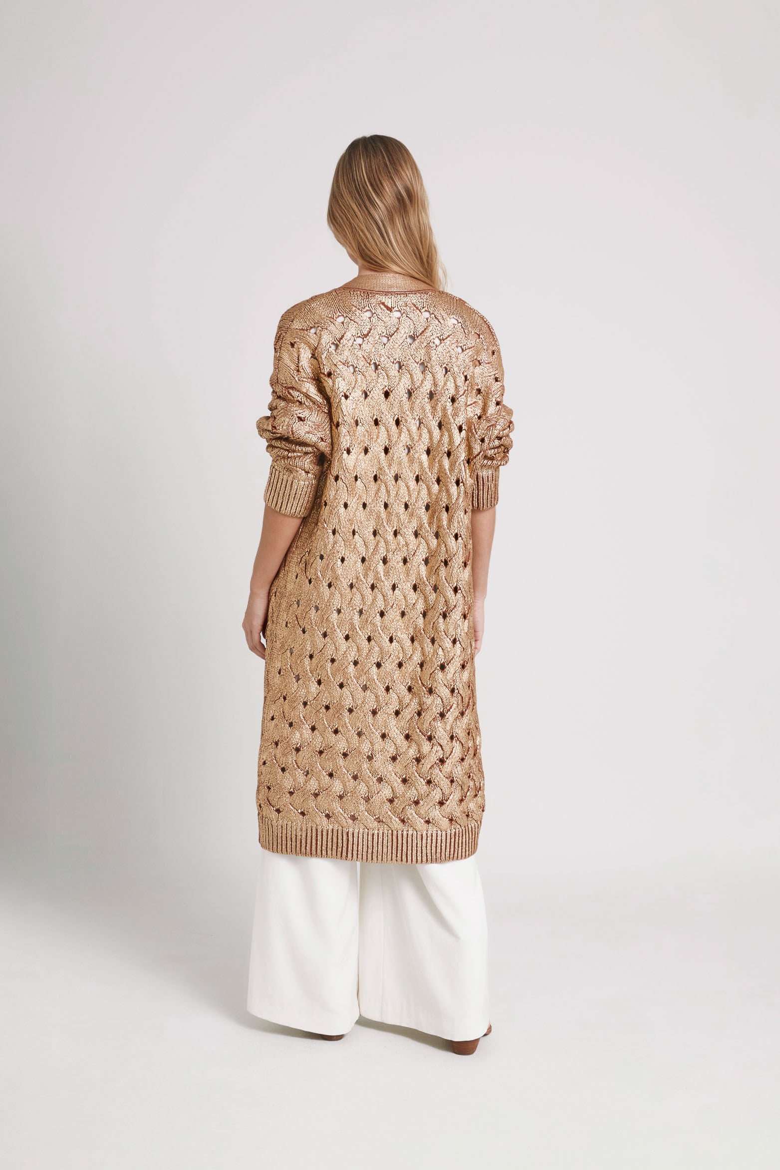 Our Aurora knit cardigan is an authentic wardrobe essential that envelops you in a sensation of coziness and comfort. Its golden tones, illuminated by the symbology of the sun and the earth, offer a metallic experience on a foil backdrop that brings a subtle brilliance and sophistication. The natural weave, fitting snugly at the shoulders and waist, and the handcrafted refinement at the cuffs, speak to Vélez's tradition of artisanal excellence in each piece. This cardigan is a natural choice, embodying elegance and personality.