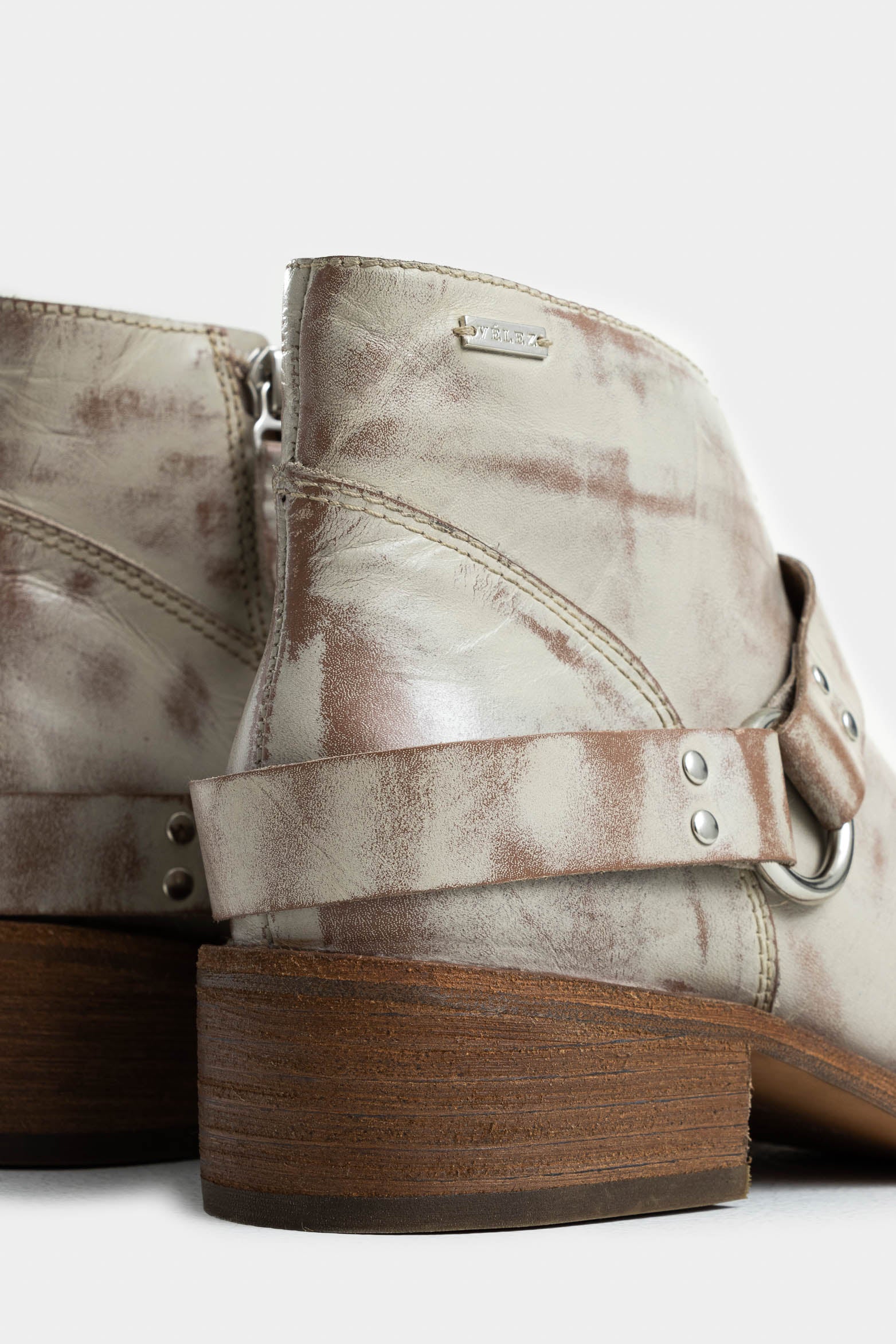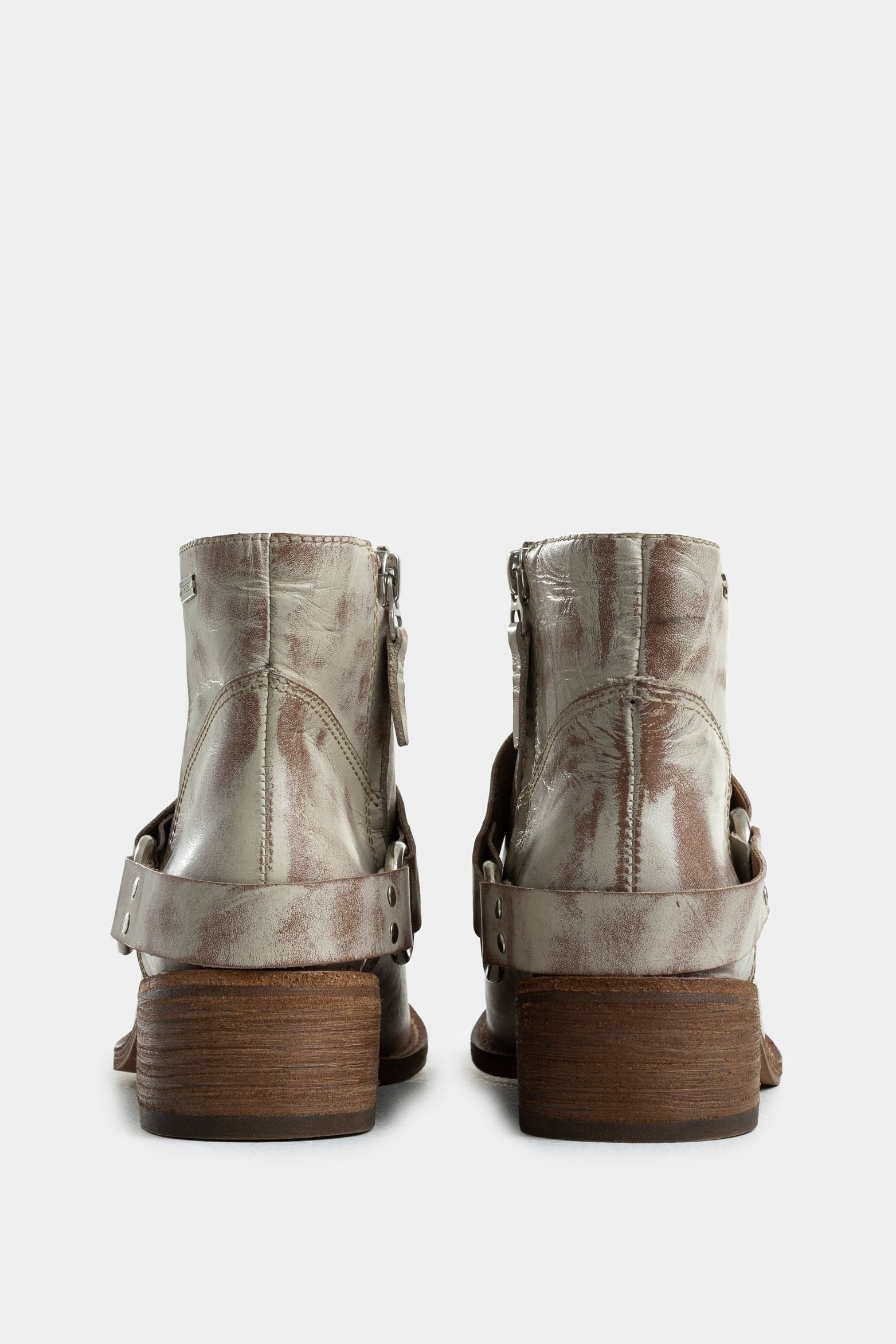 Elevate your style with our Texan booties, a key piece for a vintage revival. Each pair blends the allure of the Western trend with our artisanal tradition. Crafted from brush off leather, these booties offer a bold and audacious look. The stirrup detail with metallic appliques provides a unique, distinctive touch, while the anatomical insole ensures all-day comfort. Perfect for pairing with flowing dresses to shorts, these booties make a statement in any setting with their luxurious texture and bohemian cut.