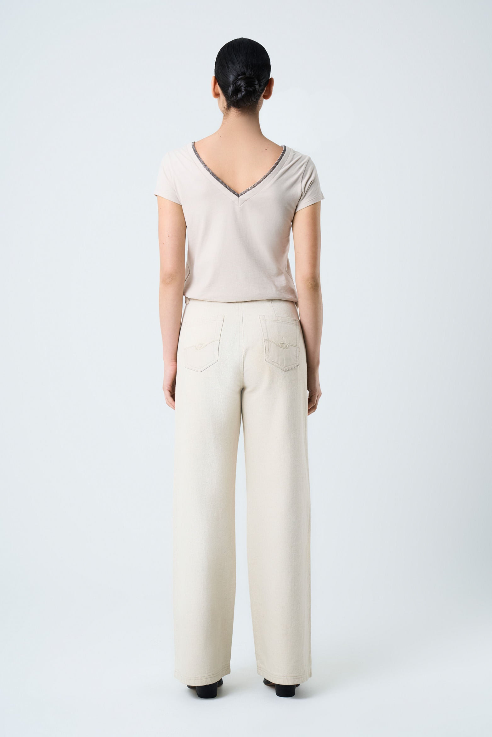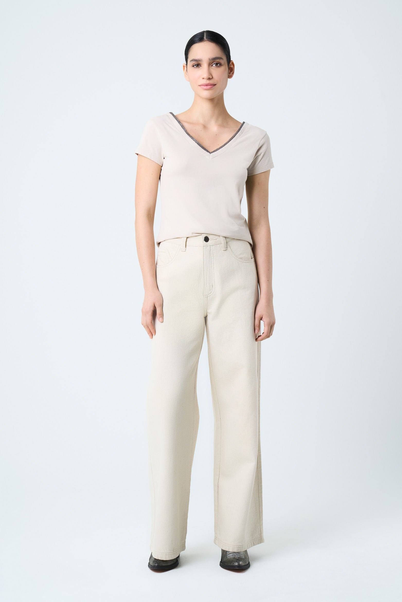 A timeless essential elevated with luxurious details—our women’s semi-loose fit t-shirt, crafted in jersey knit fabric, is a key piece in any feminine wardrobe. Its short sleeves and V-neckline create a signature Vélez style, where the metallic millaré details and high-hip length become the standout elements of your look.