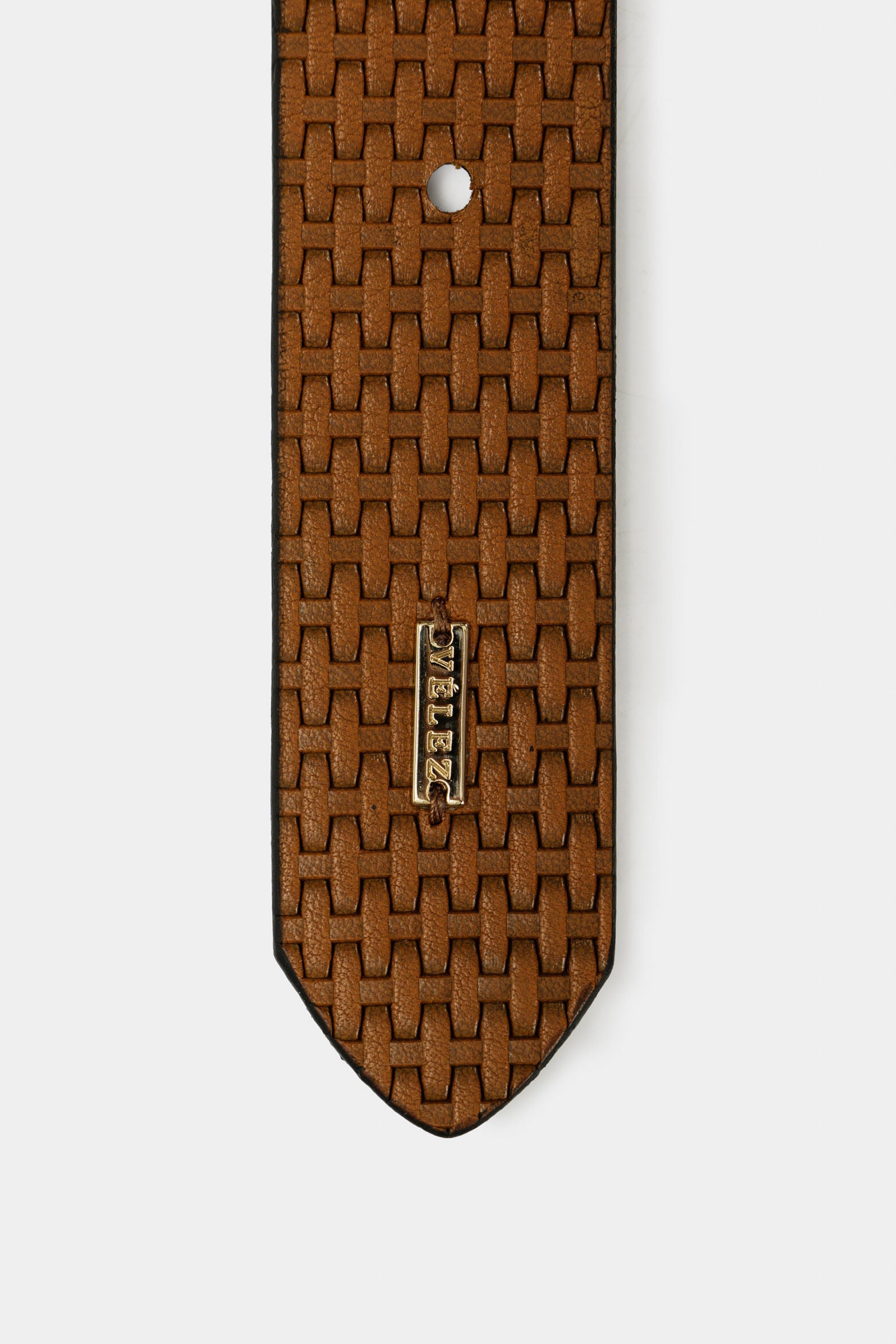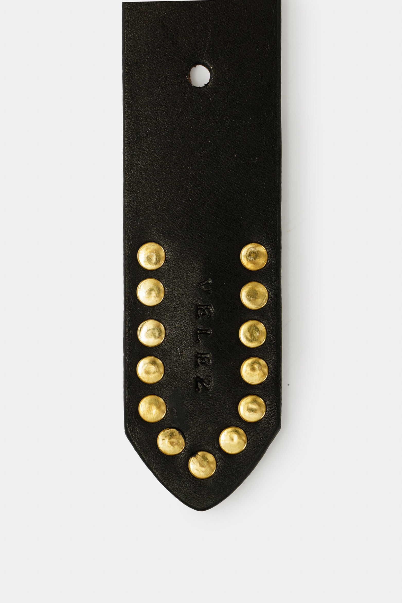 Reversible leather belt with artisanal luxury details. One side features a bold pyramid-textured leather panel, while the other showcases smooth leather with studded accents. The triangular tip with softened edges adds a refined edge. Designed with a reversible croc-effect buckle and minimalist silhouette, it pairs perfectly with casual and office looks. Can be trimmed to fit in Vélez stores.