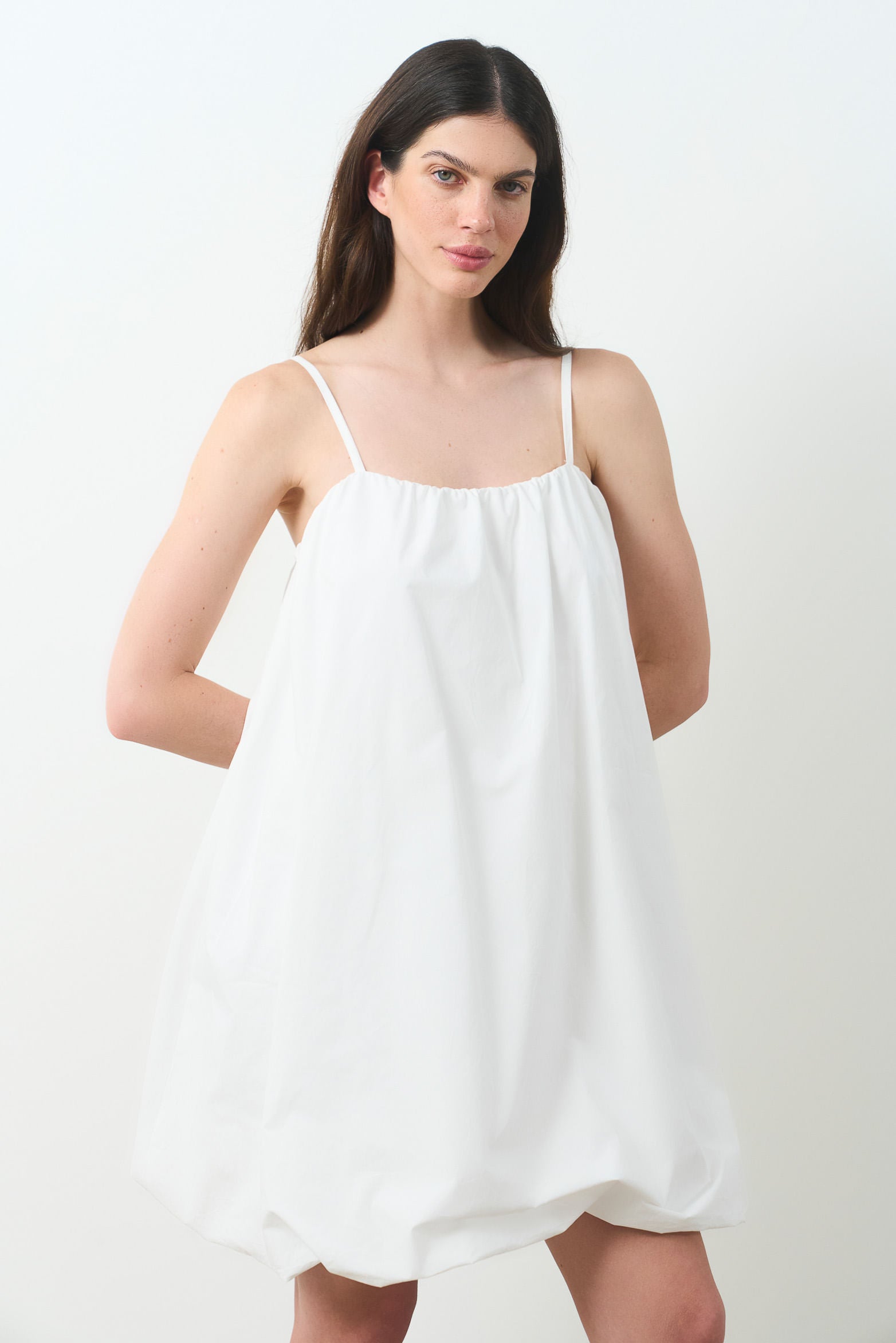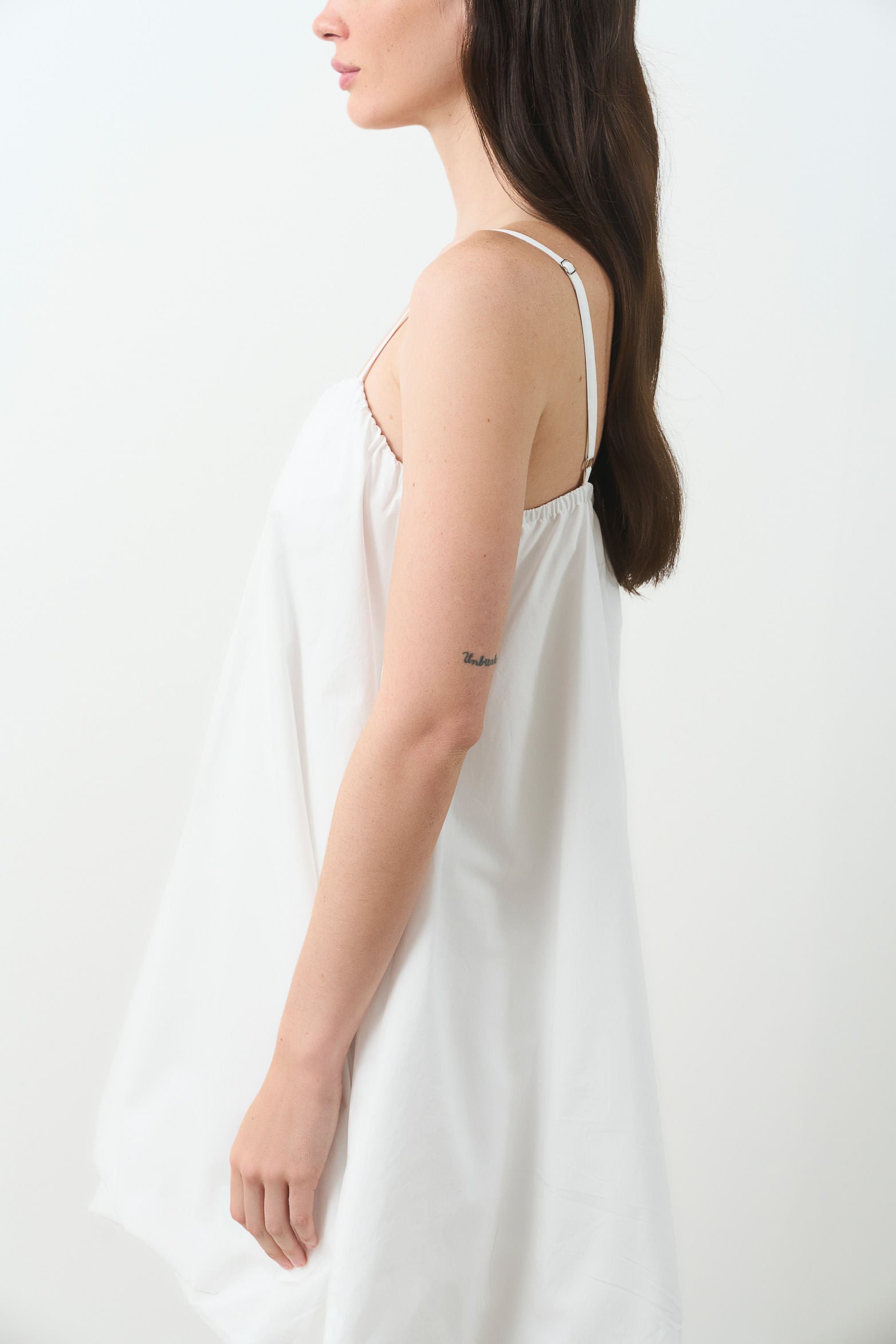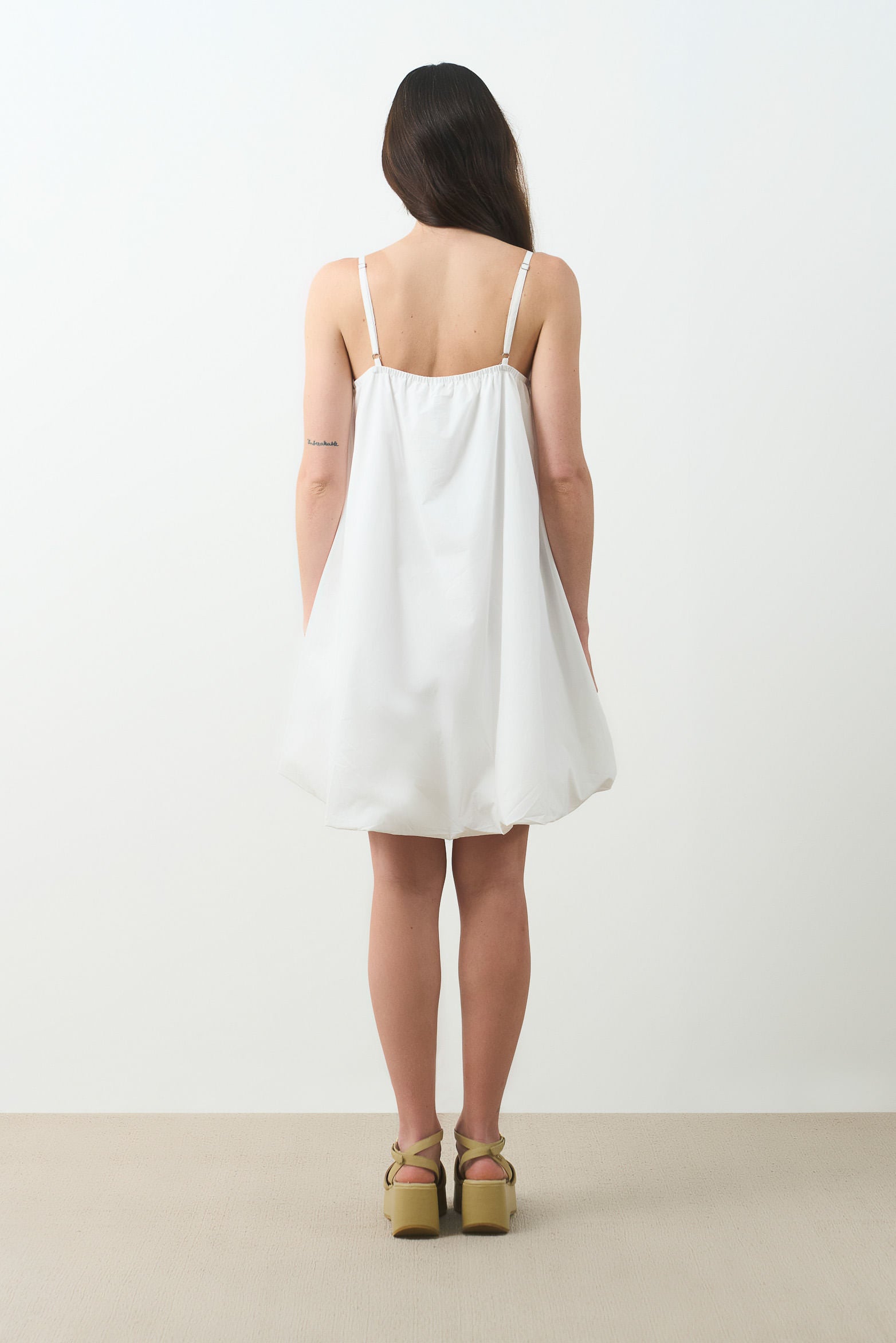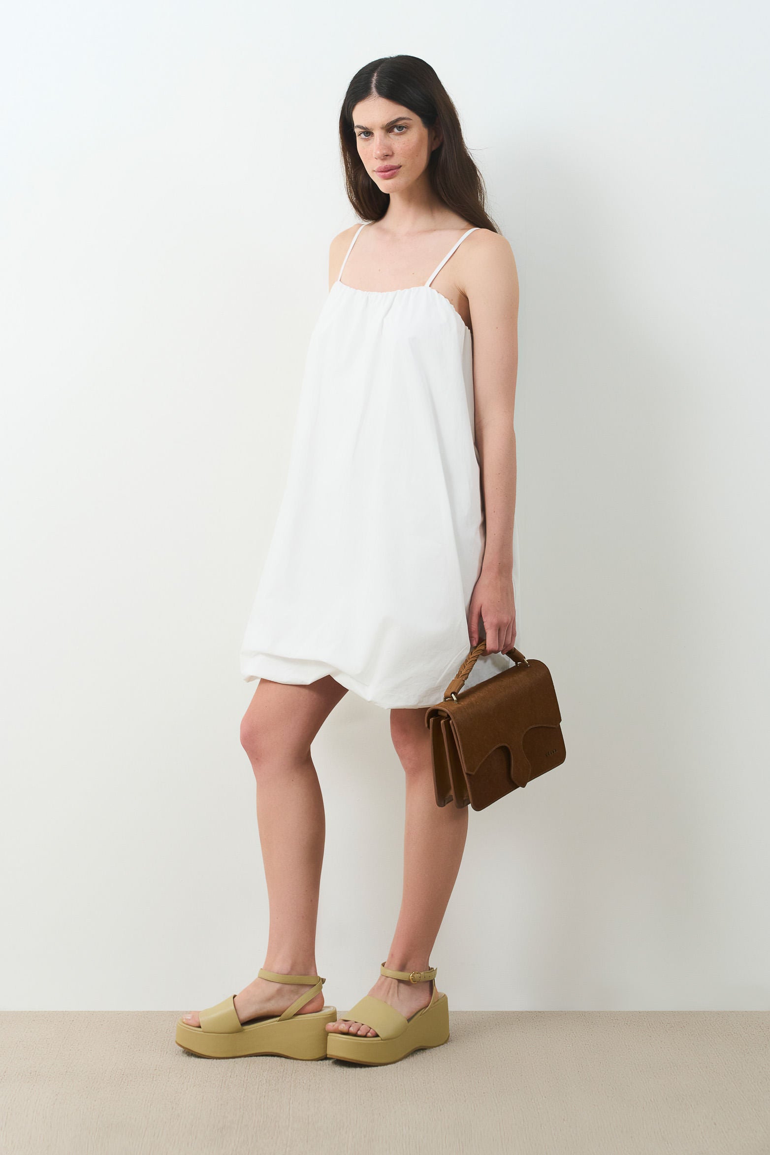 This dress moves naturally between freshness and structure. The straps and open back reveal a free-spirited silhouette, while the balloon volume adds presence without losing fluidity. A piece that accompanies the attitude with which you choose to inhabit the world: with intention, sensitivity, and beauty that feels authentic.
