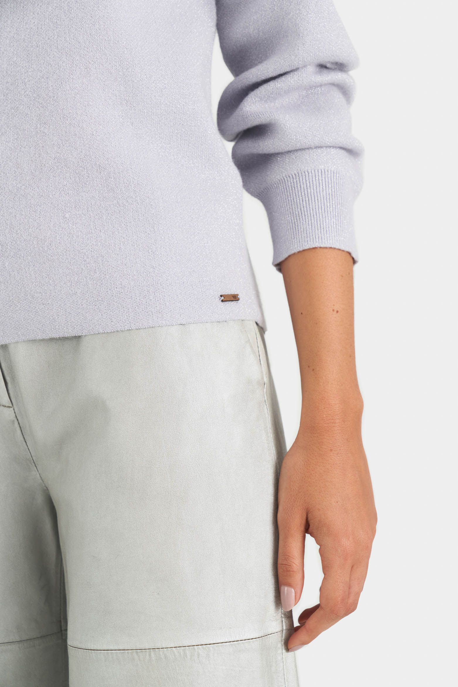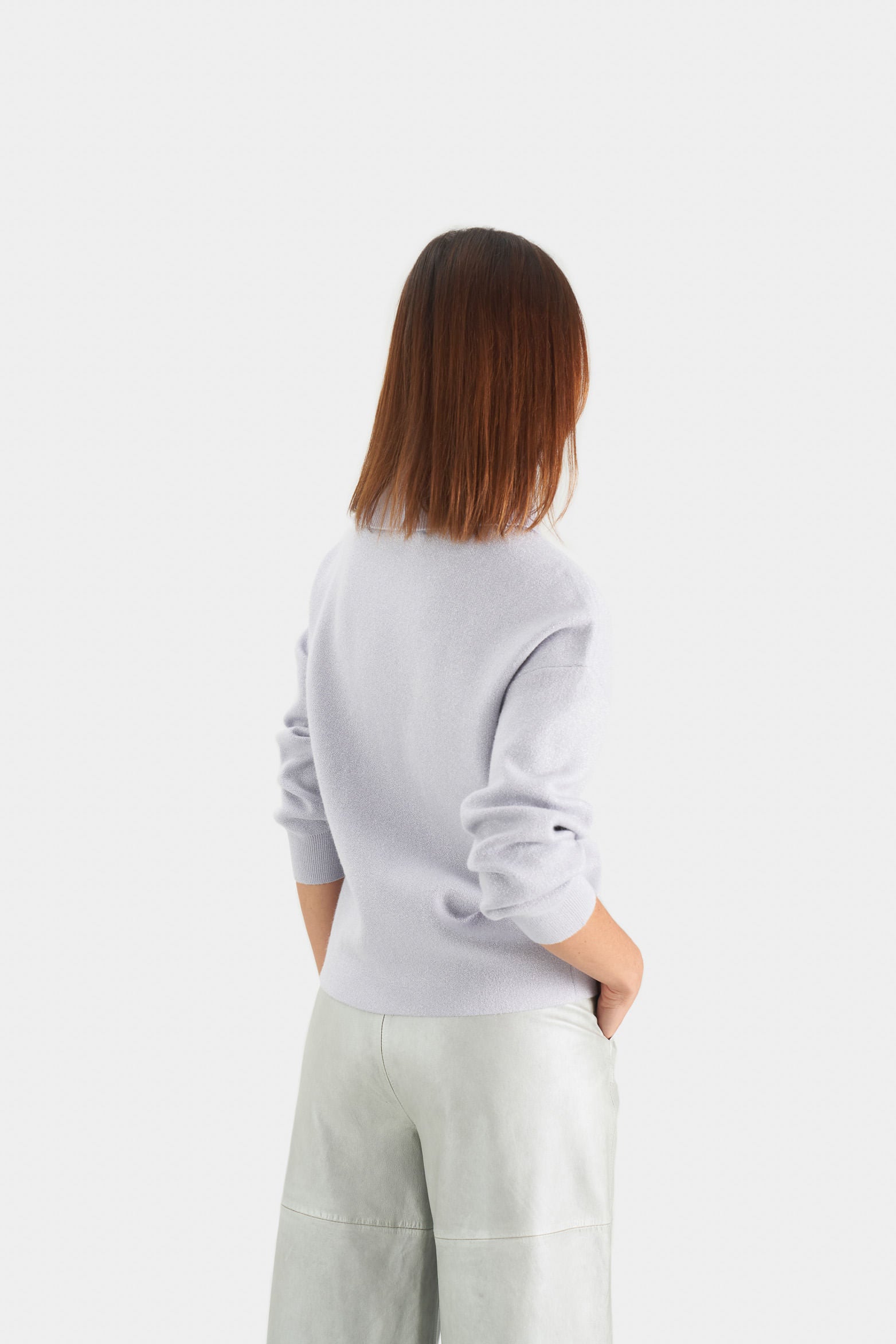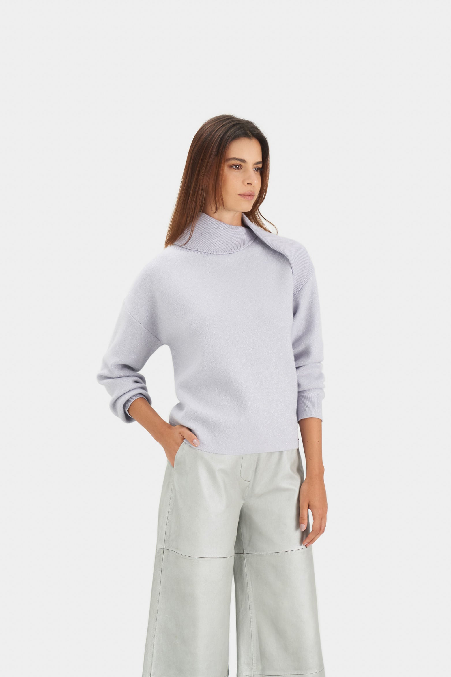 Our Calas sweater is a garment that blends style and textile mastery, made from ribbed knit fabric that plays with directional changes to enrich its texture, embellished with lustrous Lurex threads that add a sophisticated shine to the silhouette. Its design features long sleeves, a dropped shoulder, and a turtleneck with a decorative front flap, achieving a stylized draped effect. Discrete leather branding and monochromatic ribbed cuffs, collar, and waistband accentuate the piece, marrying perfection and refinement. Wear it with culottes for more formal events or with wide-leg jeans for a more urban, relaxed look.