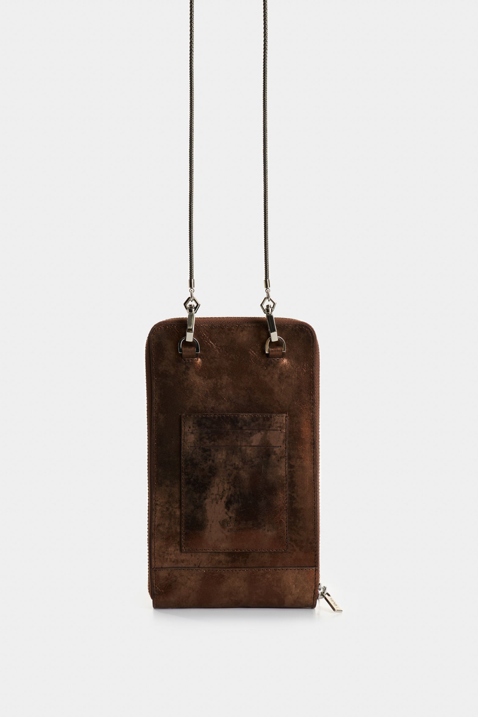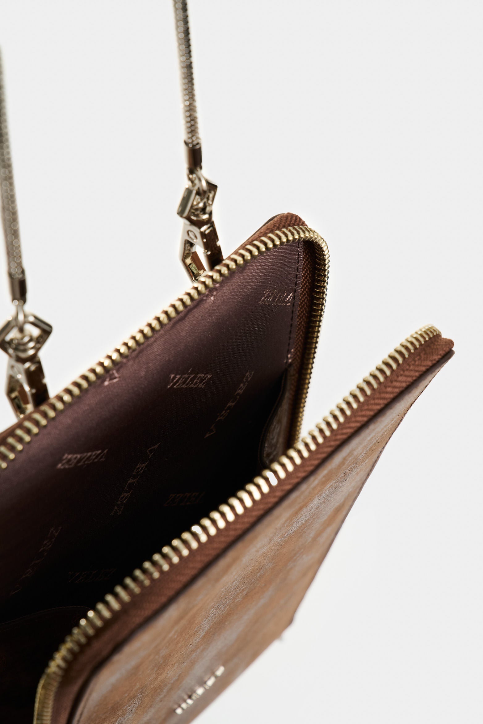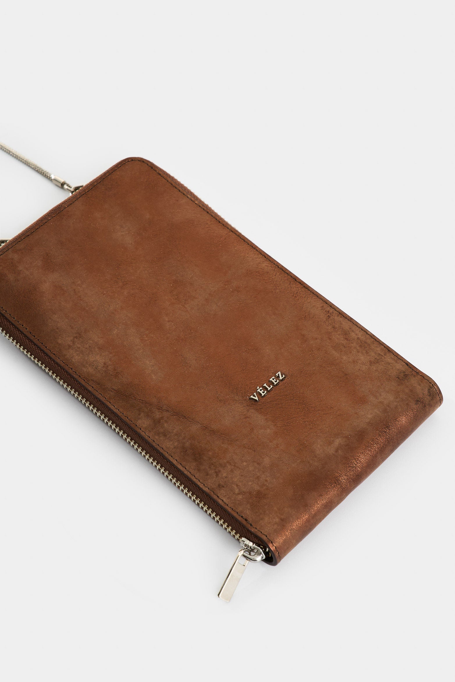 This cell phone holder reflects the heritage of artisanal work in every detail, handcrafted in leather with an organic texture and natural sheen that enhance its authenticity. Each step in its creation honors traditional techniques, bringing to life a functional and elegant piece. With card slots, a metal zipper closure, and a removable chain, its versatile design is complemented by the RFID system to secure your data. A piece that unites tradition and modernity to elevate your everyday style.