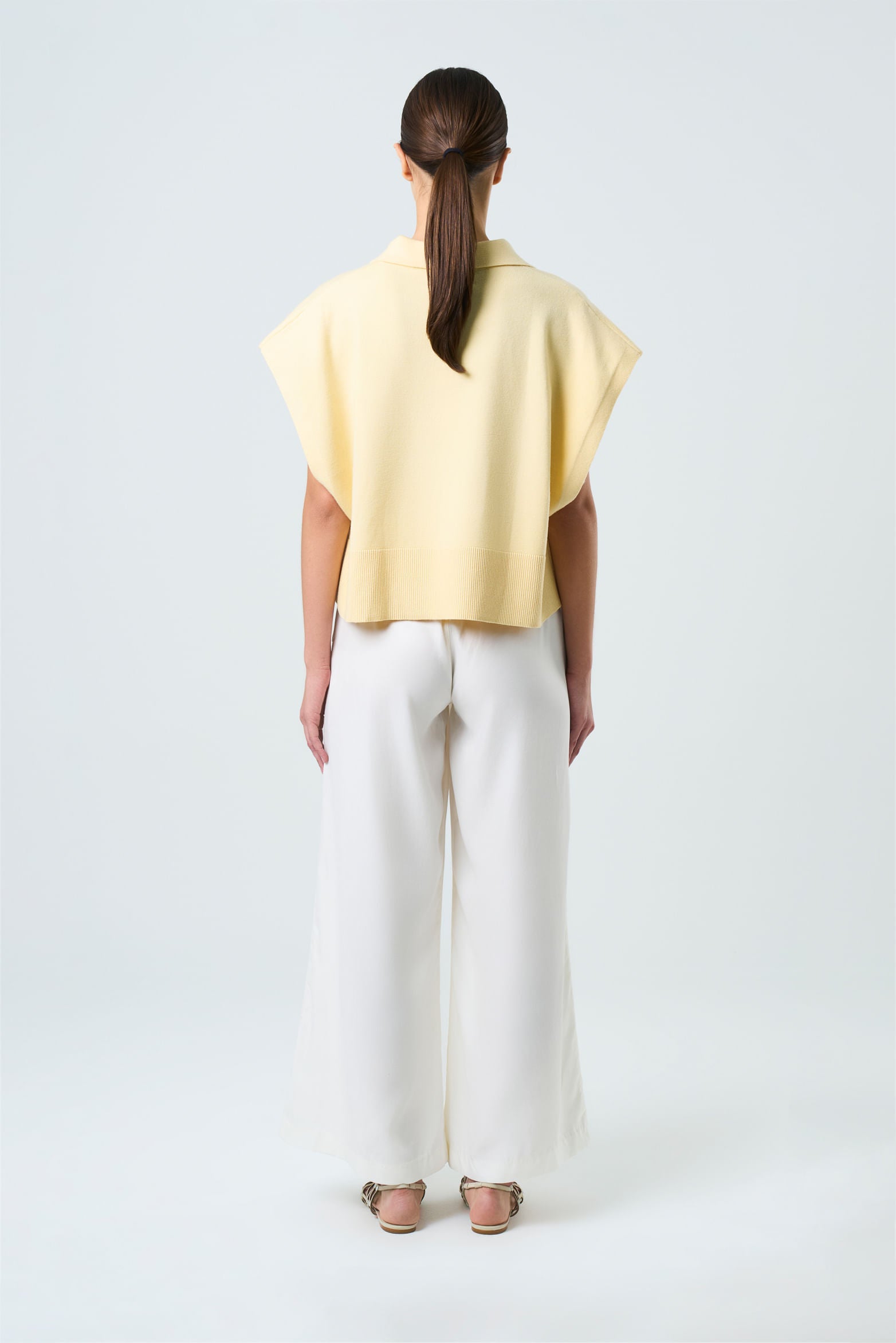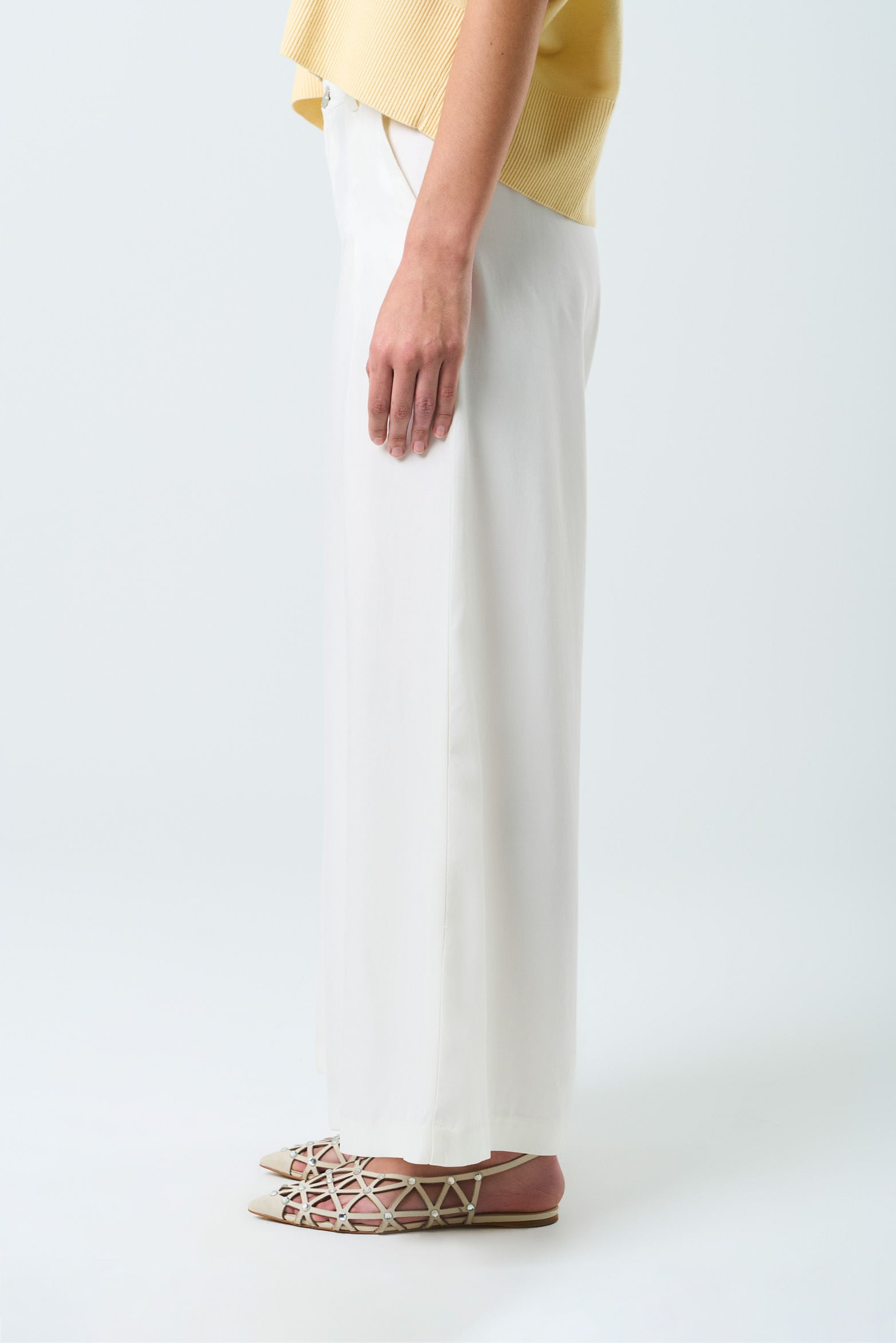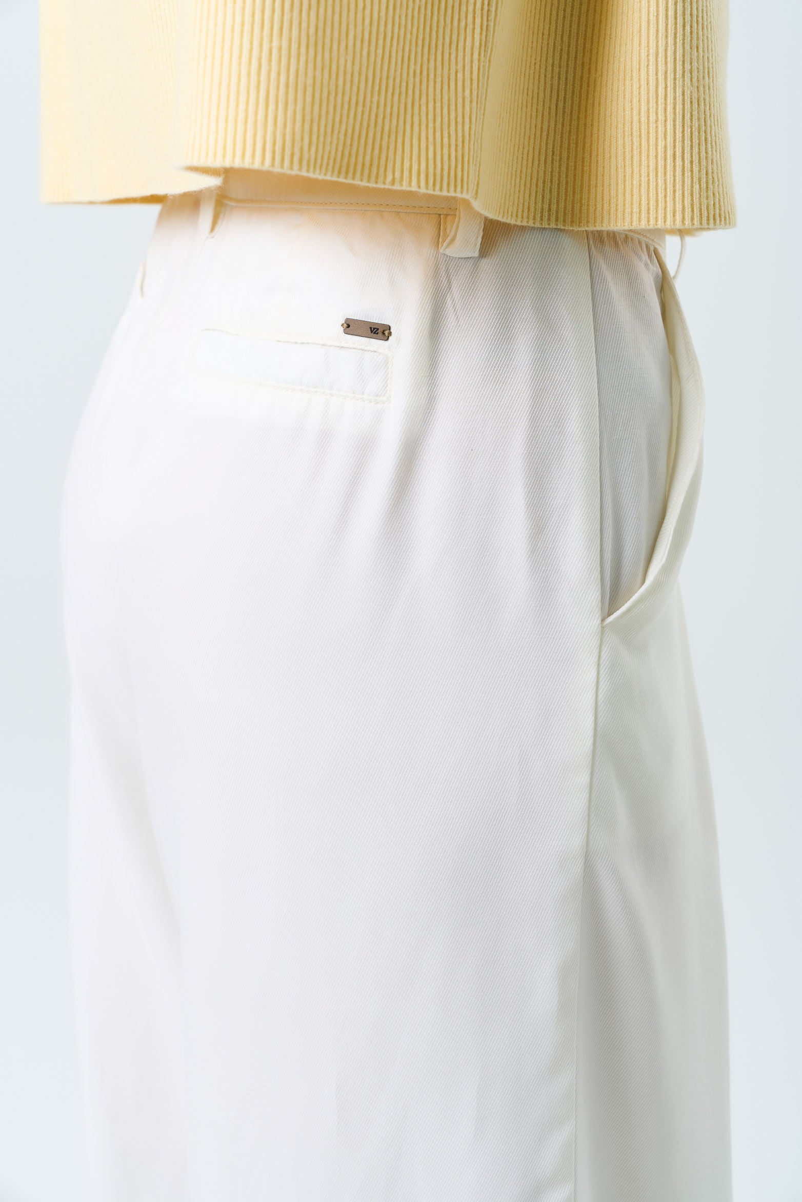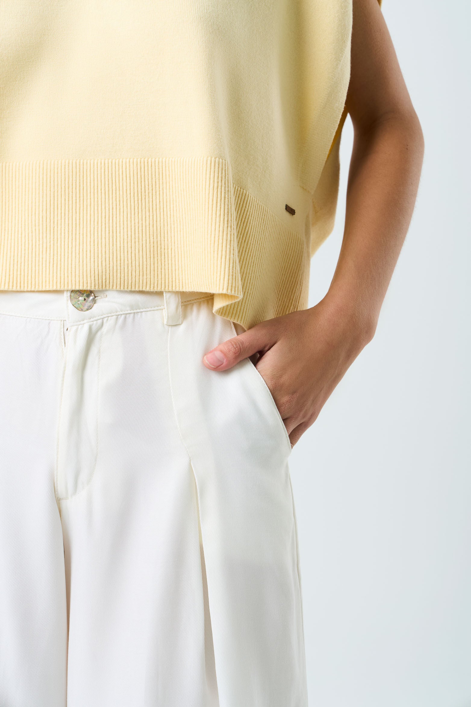 Our palazzo pants represent the Vélez essence in a sophisticated design, blending traditional craftsmanship with trends of elegance and minimalism. Its relaxed fit provides superior comfort, highlighted by the pleated waistband that adds volume. The boot cut adds a touch of dynamism and style, while the welt pockets at the hips provide elegance. With its high waist and floor-length cut, these pants combine simplicity and sophistication into a piece perfect for any women's wardrobe. Perfect for pairing with platform sandals, revealing the personality and elegance of luxury artisanal leather pieces.