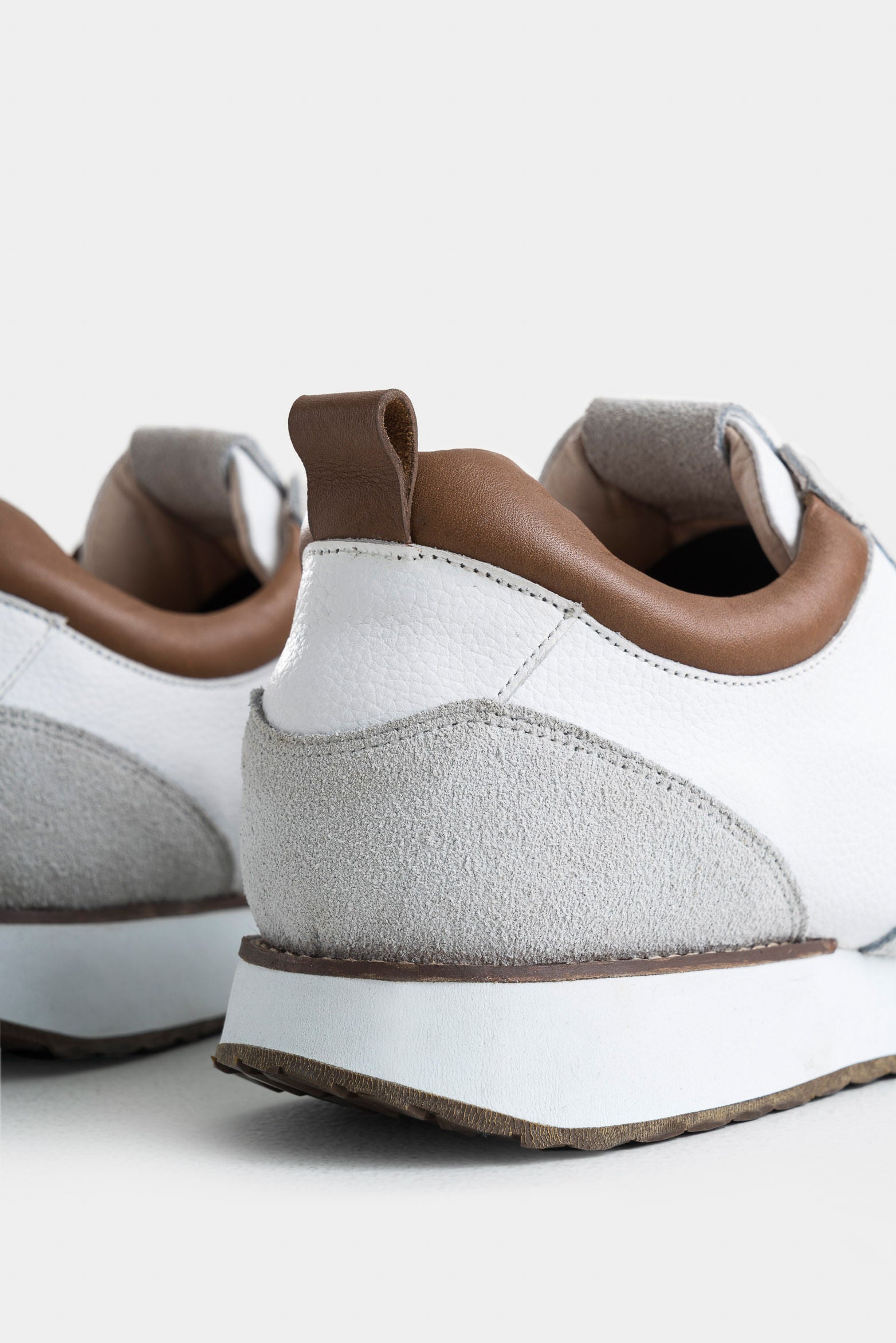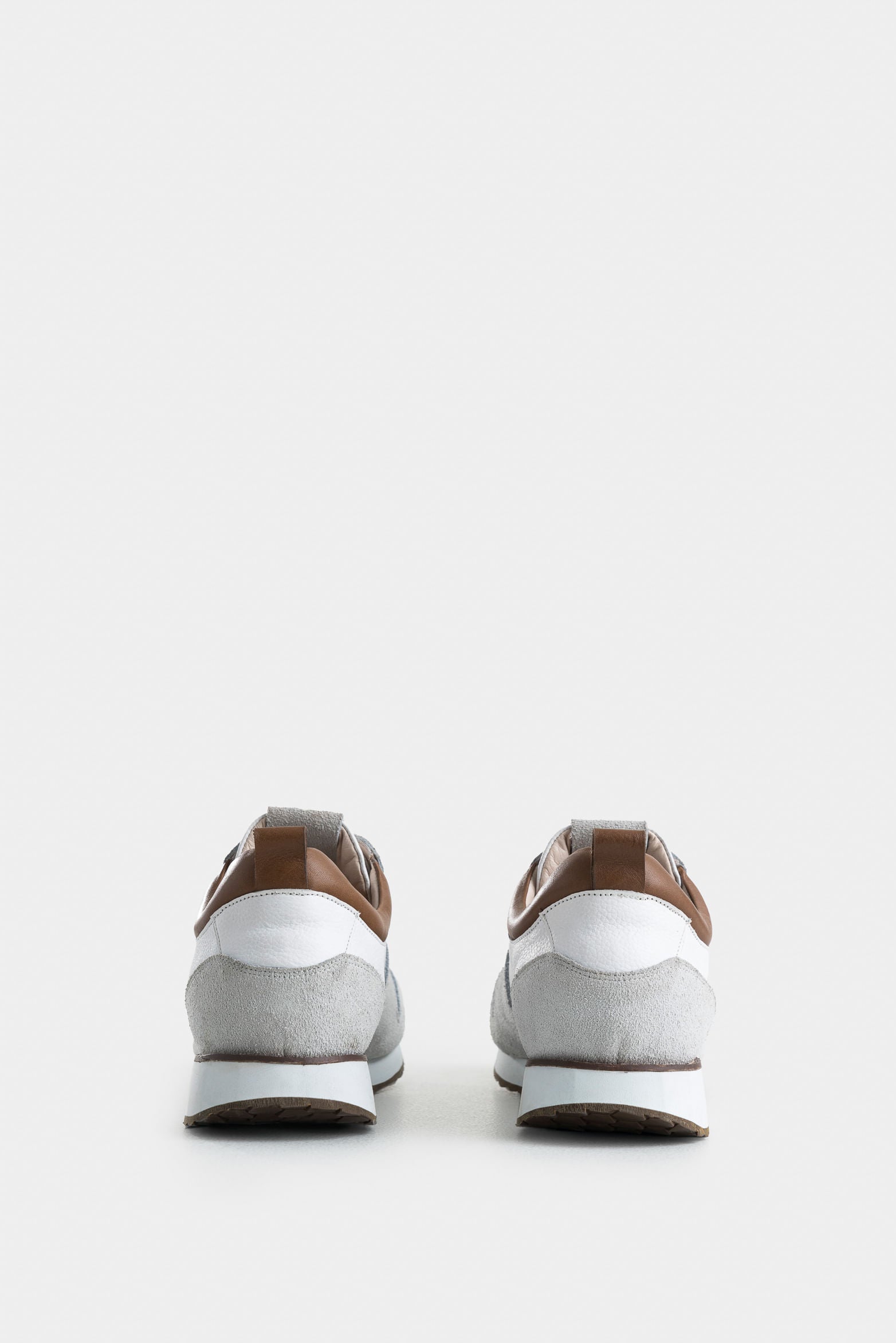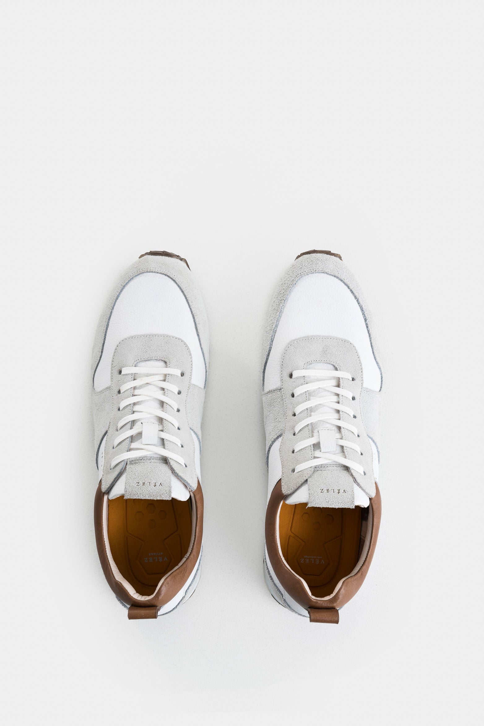 Our Coprin tennis shoes stand out for their comfort level, thanks to a sporty silhouette filled with sophistication and texture from the combination of smooth and suede leather. Contrast details and an ultralight sole alongside a luxurious anatomical, washable insole guarantee comfort and distinction. Additionally, sustainable elements like recycled cotton flat laces and a recycled rubber particle insole highlight Vélez's dedication to detail and minimizing environmental impact.
