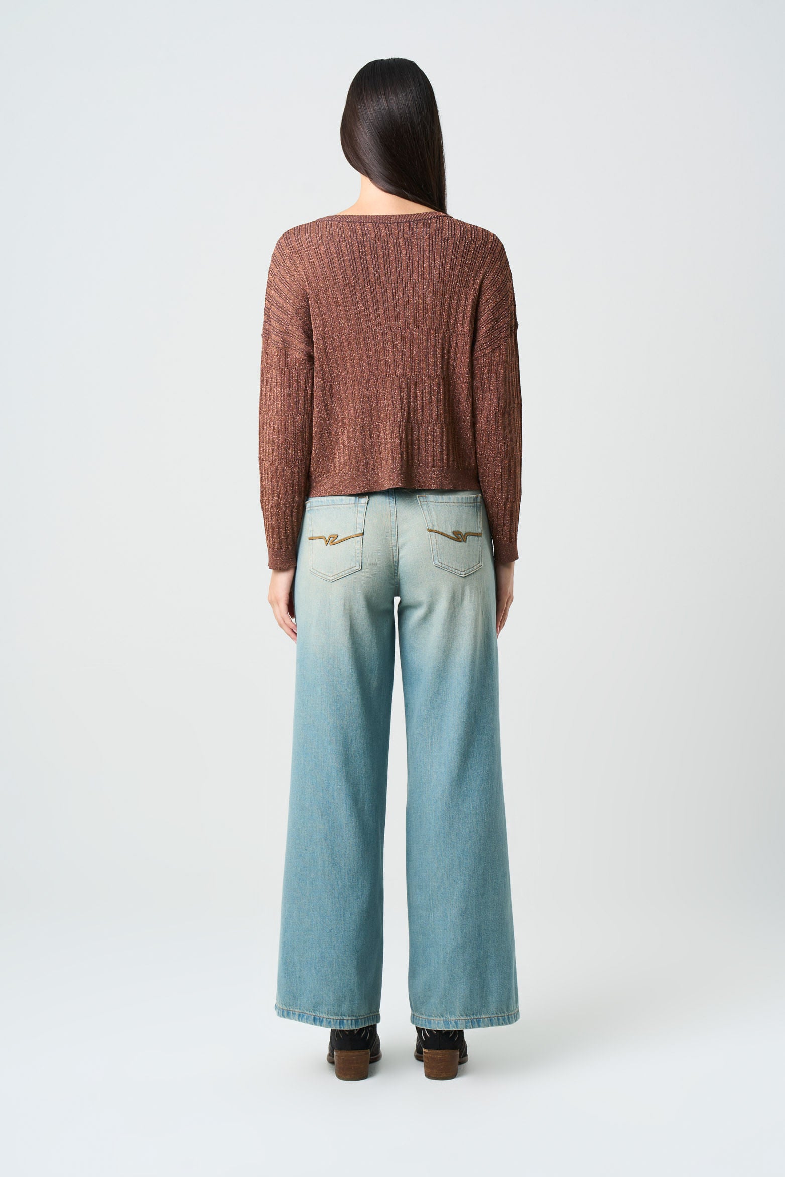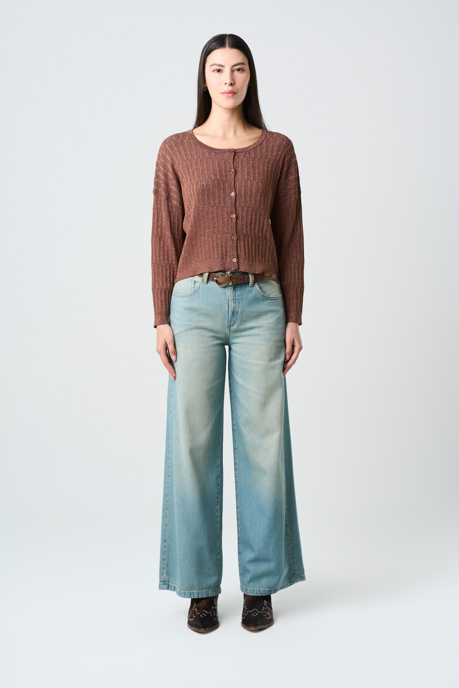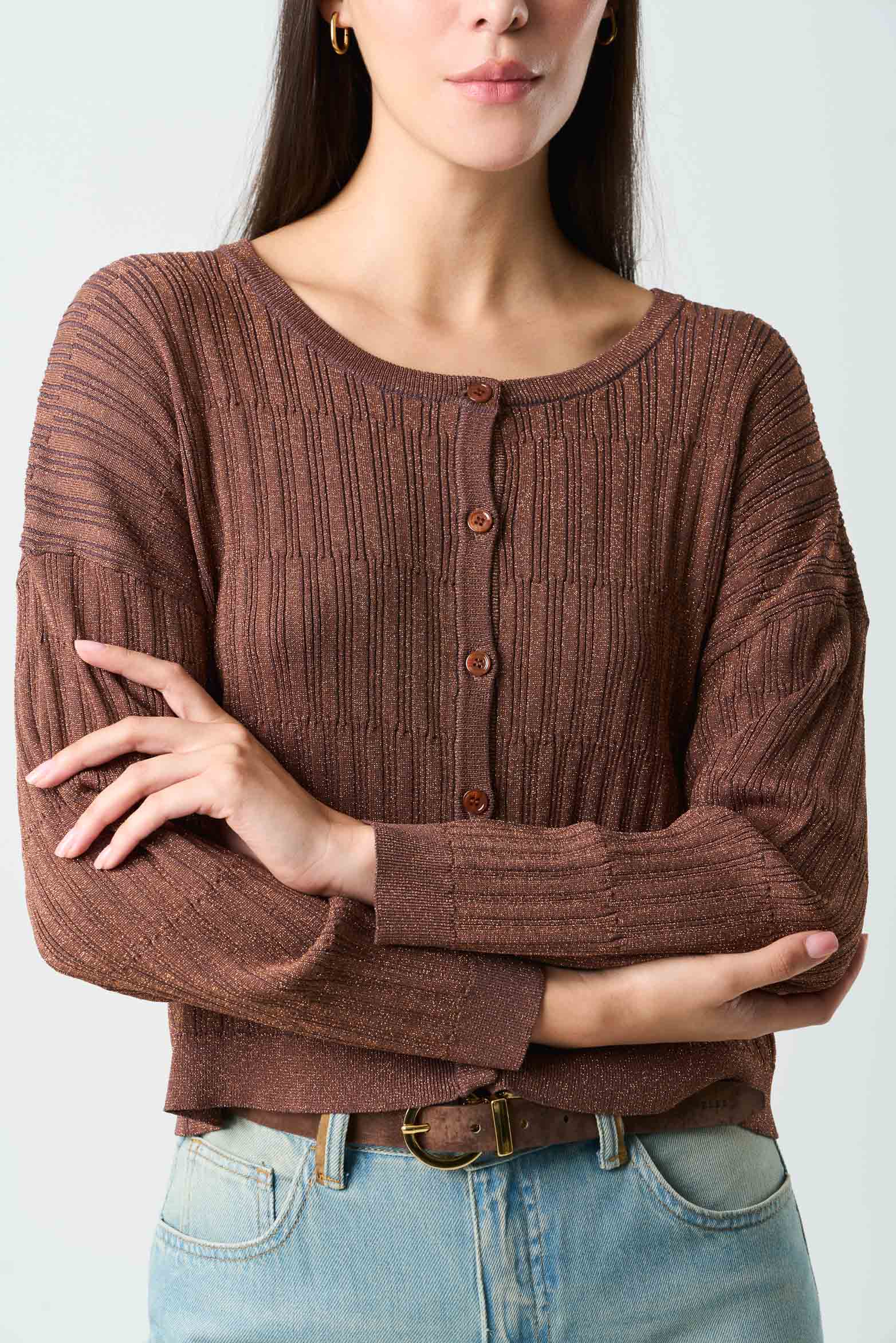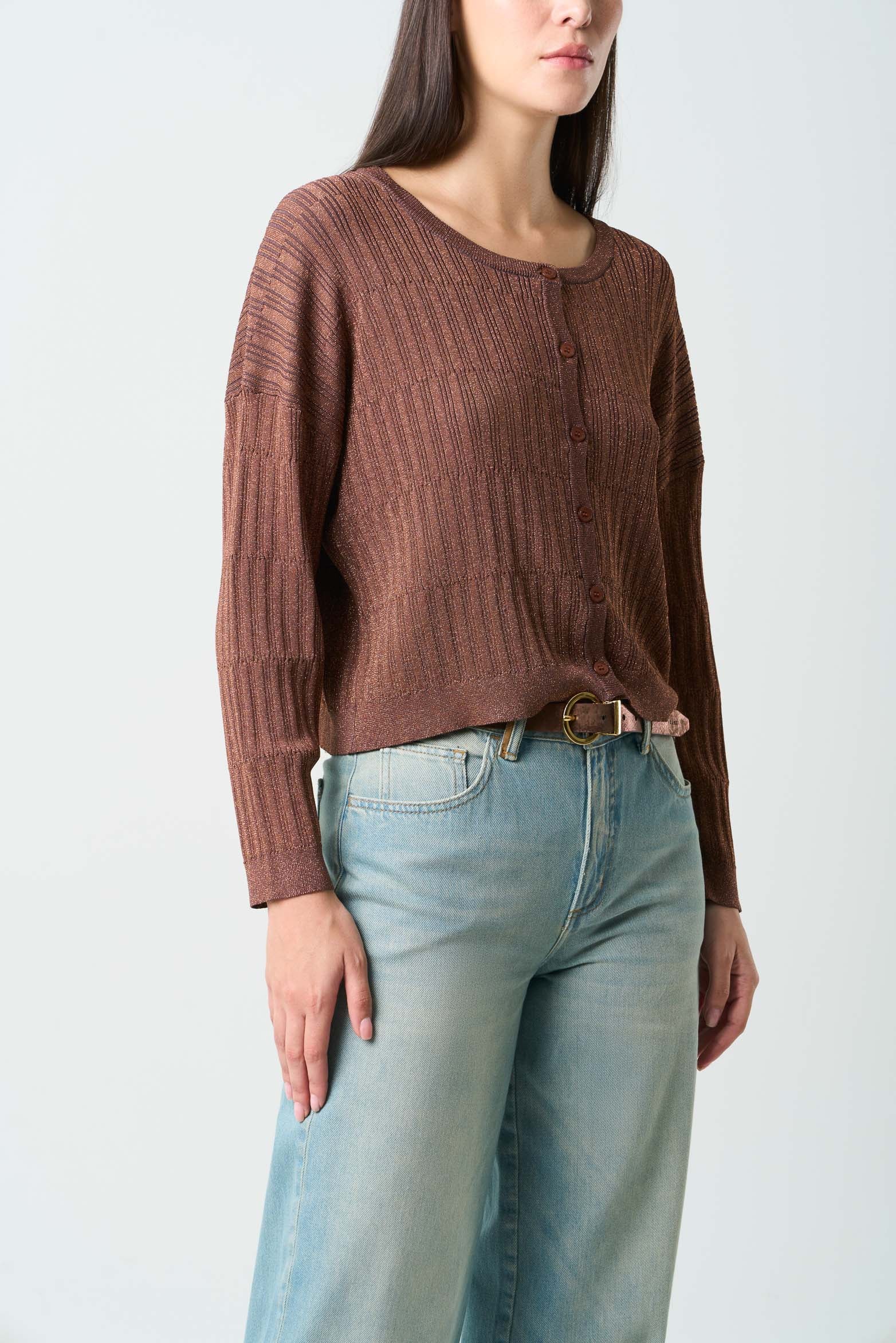 A design that brings light to every detail. This knit cardigan, made from bronze lurex threads, blends a shimmering texture with a semi-fitted silhouette, perfectly balancing delicacy and contemporary flair. Featuring a round neckline, tone-on-tone button placket, and ribbed finishes, this piece is elevated with its refined details. The soft fabric ensures ideal comfort. Pair it with barrel jeans for a casual yet sophisticated look.