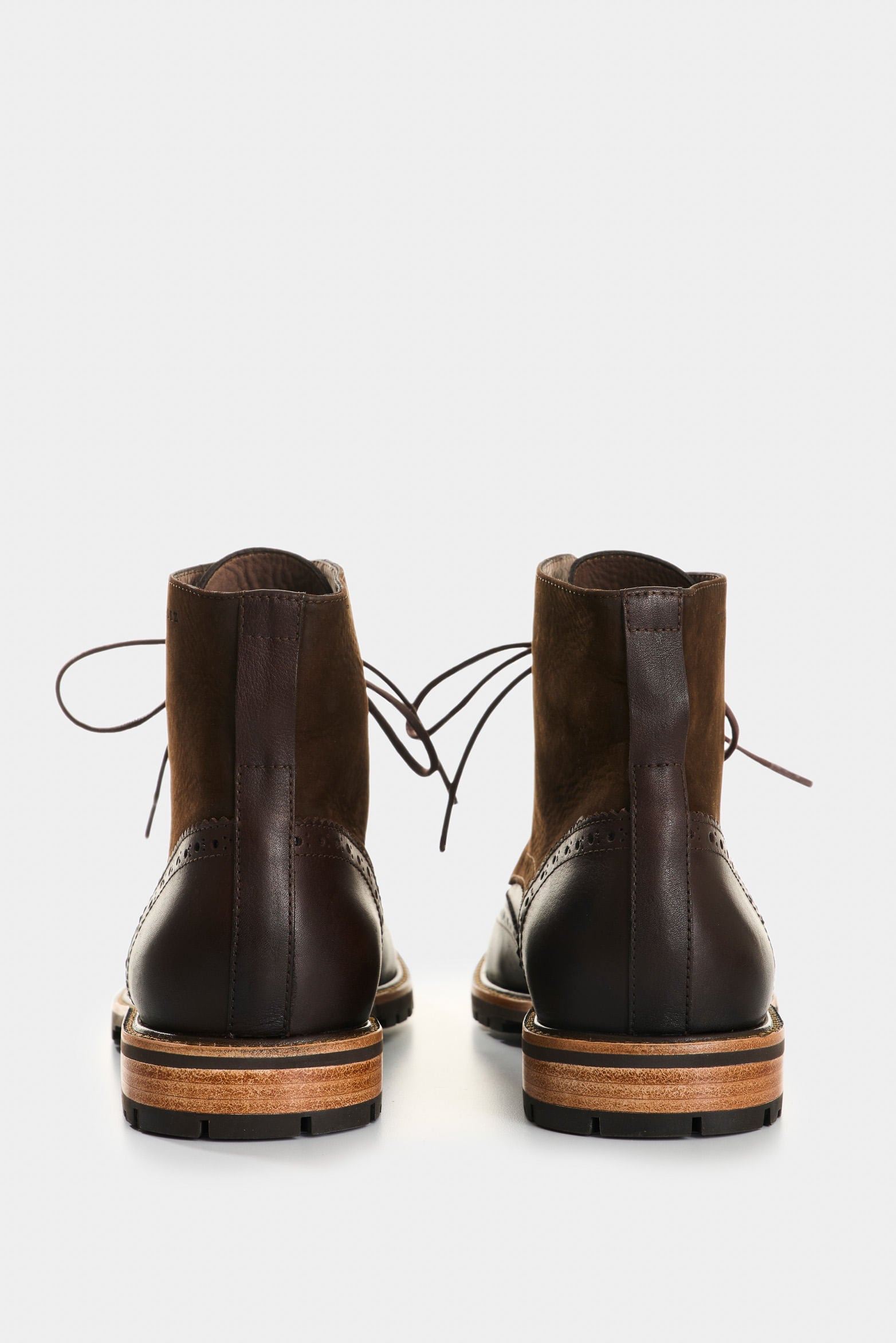 Inspired by artisanal tradition, these boots combine contrasting leather textures that add character and sophistication. The perforated kongo-style toe details and chiripiado side design evoke a retro aesthetic with a modern touch. The rubber sole with leather welt ensures comfort and durability, making them a versatile choice to elevate both formal and casual outfits with timeless elegance.