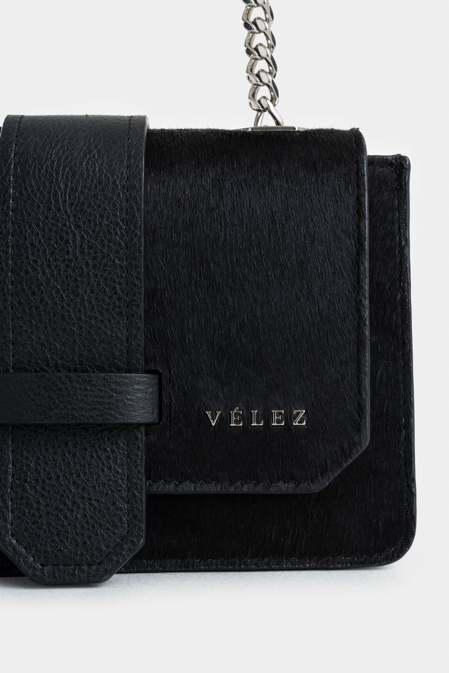 Merging style and functionality, our Garniel hands-free bag made from leather with hair-on is a piece that breaks the mold of any outfit, embodying Vélez's innovation processes. Its interior includes a zippered pocket and a handy cell phone pocket to keep your items organized and secure. The side gussets and flap with an easy and secure closure make this bag ideal for accompanying you in all types of events and occasions, thanks to its versatility and satisfaction.