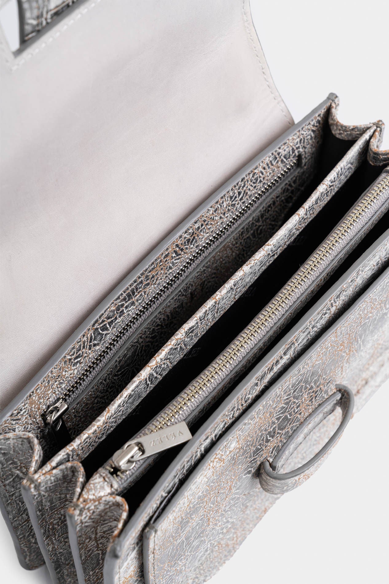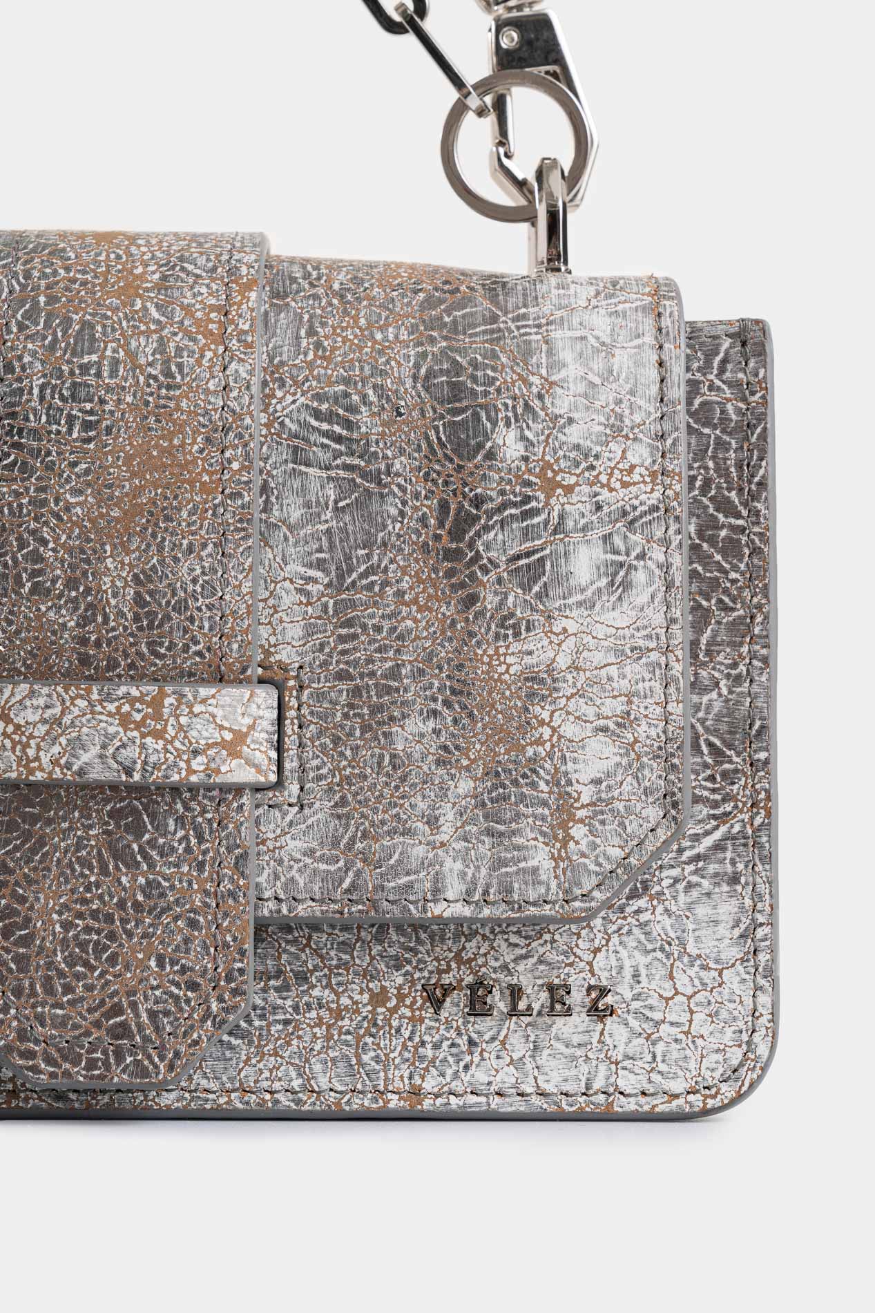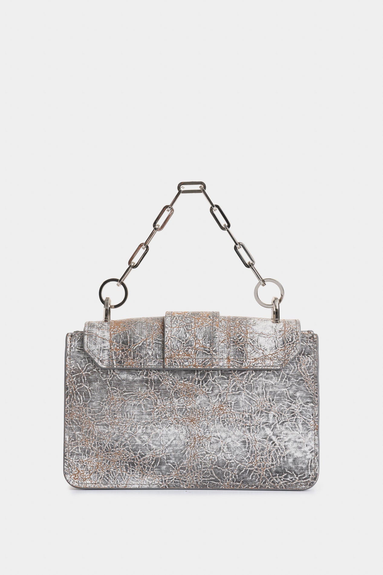 Featuring a structured design and crackled texture that enhances luxury with sophisticated shine, this accessory is perfect for eclectic styling and futuristic minimalism. Its adjustable leather strap and chunky chain handle bring versatility and artisanal charm. With details like internal and hidden pockets and a flap closure with a fastener, it’s the essential accessory to express your individuality.