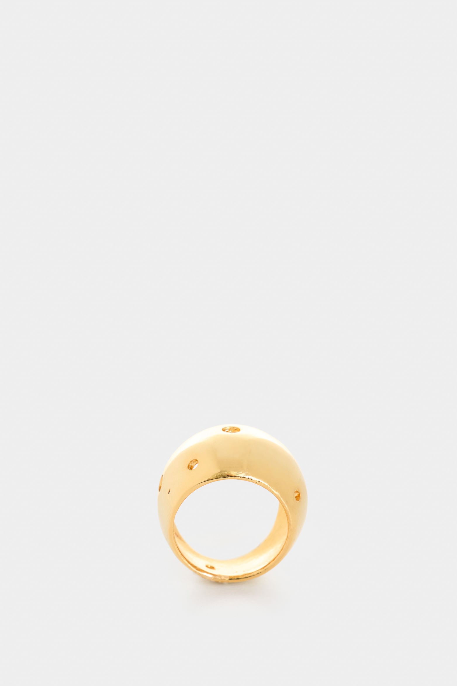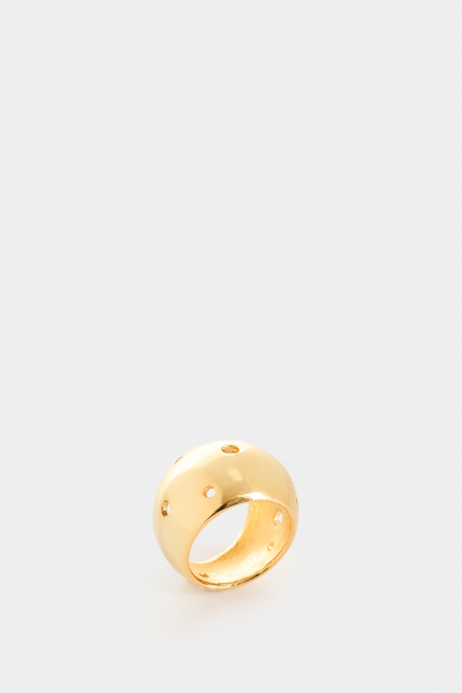 This 24K gold-plated metallic ring showcases artisanal craftsmanship that highlights its organic shape and spherical volume. Decorative cutouts flow harmoniously throughout the piece, while its polished texture and finish evoke natural inspiration. A design that expresses authenticity with a contemporary touch.