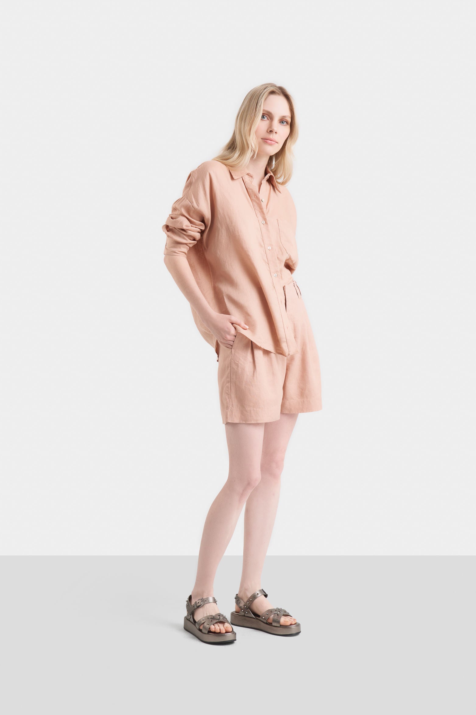 Essential for your wardrobe, these high-waisted linen shorts redefine casual sophistication. Crafted from linen, they stand out with their natural texture and minimalist appearance. These shorts feature a structured fit that flatters mid-thigh and are distinguished by a leather detail with millaré on the waistband, showcasing our artisanal expertise. Ideal for day-to-day wear, pair these versatile shorts with loafers for formal outfits or sneakers for a more relaxed look.