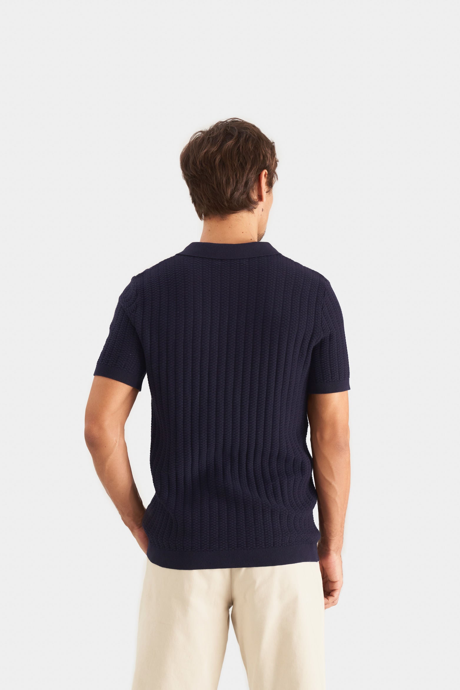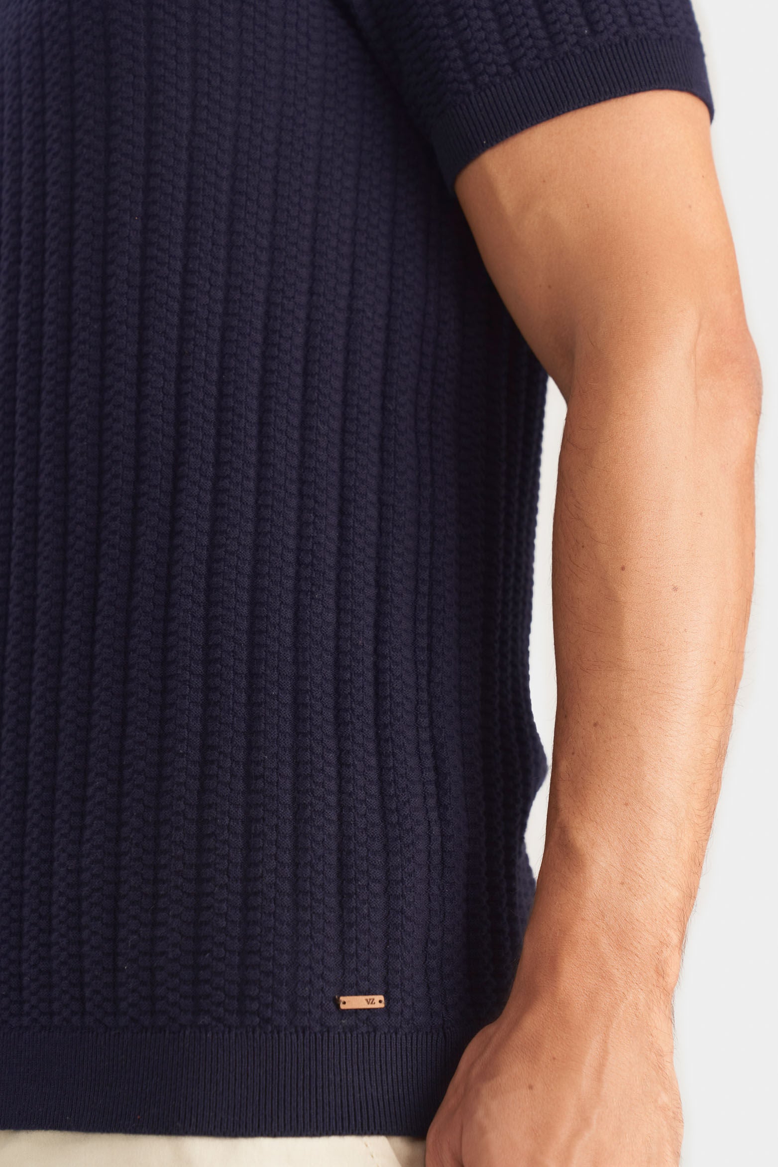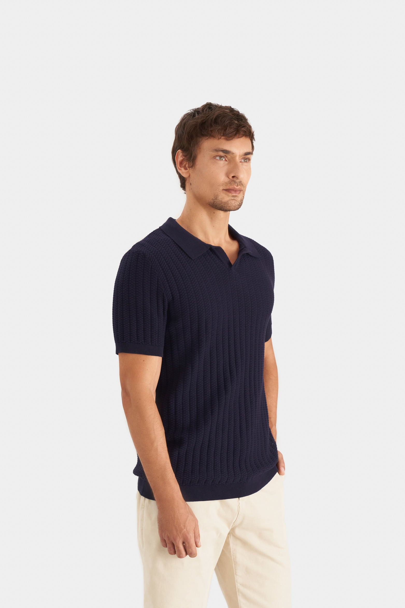 Get a versatile and comfortable piece with our short-sleeve knitted polo. With its semi-fitted silhouette and textured base, it is a versatile piece for any occasion. Additionally, its V-neck adds a sophisticated and modern touch. Pair it with jeans for casual everyday looks or chinos for a more formal look.
