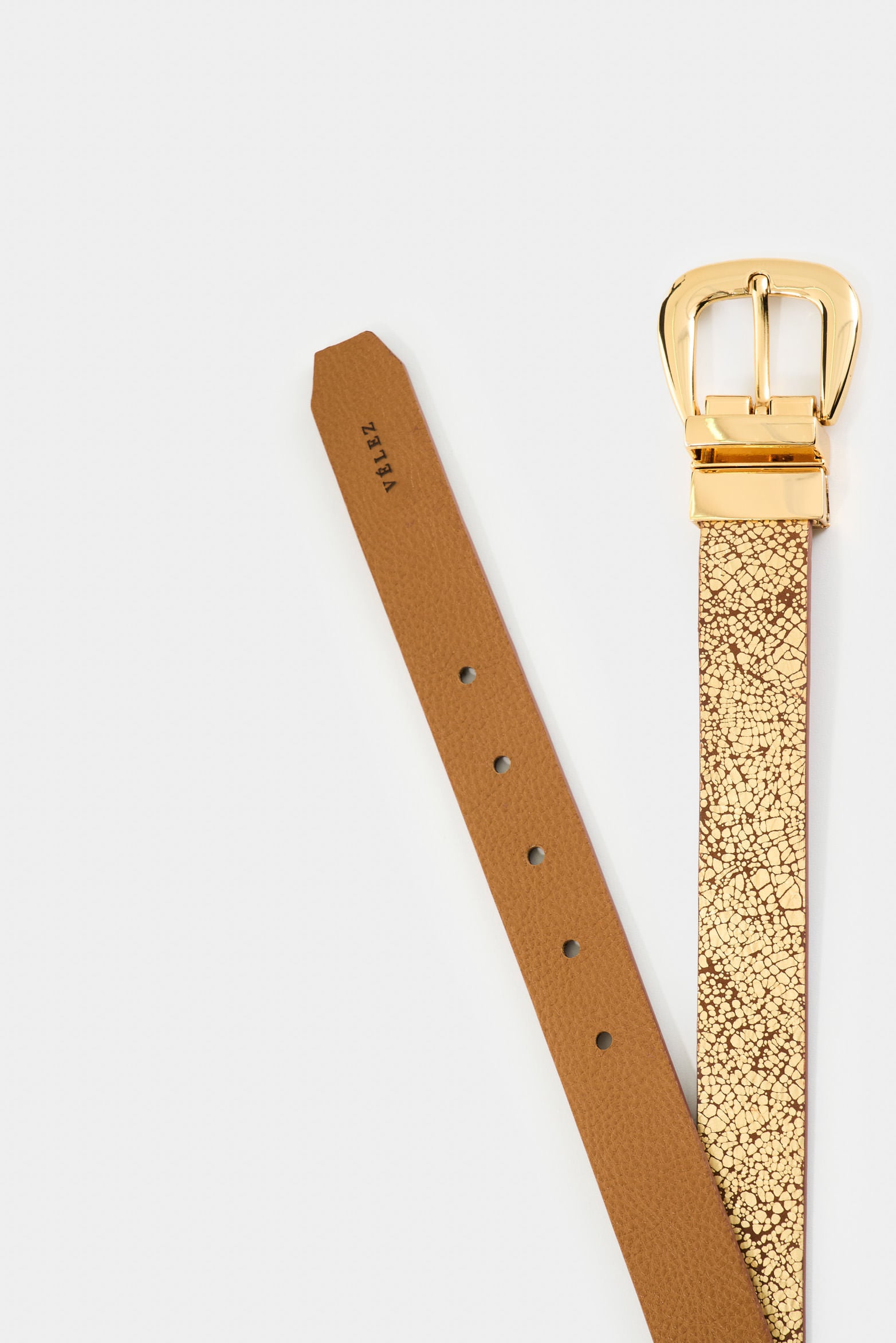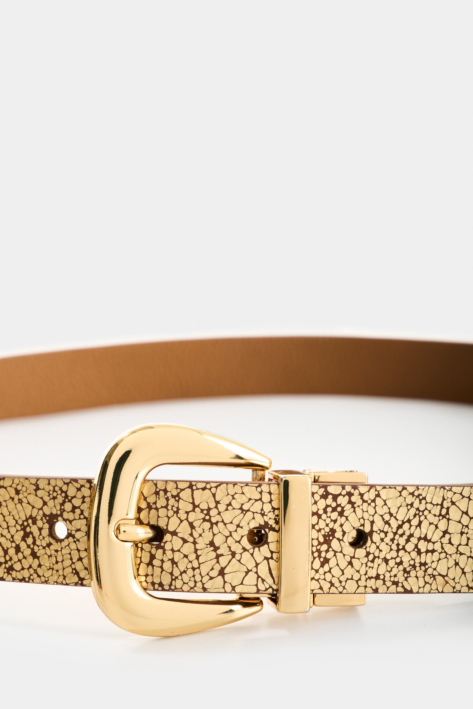 Blending classic and modern in a reversible silhouette, the Iskay belt adapts with character. Metallic folia leather with a distressed look on one side and natural grain on the other offer contrast, texture, and versatility. A polished metal buckle and refined finishes reveal impeccable craftsmanship—designed for both everyday rhythm and statement moments.