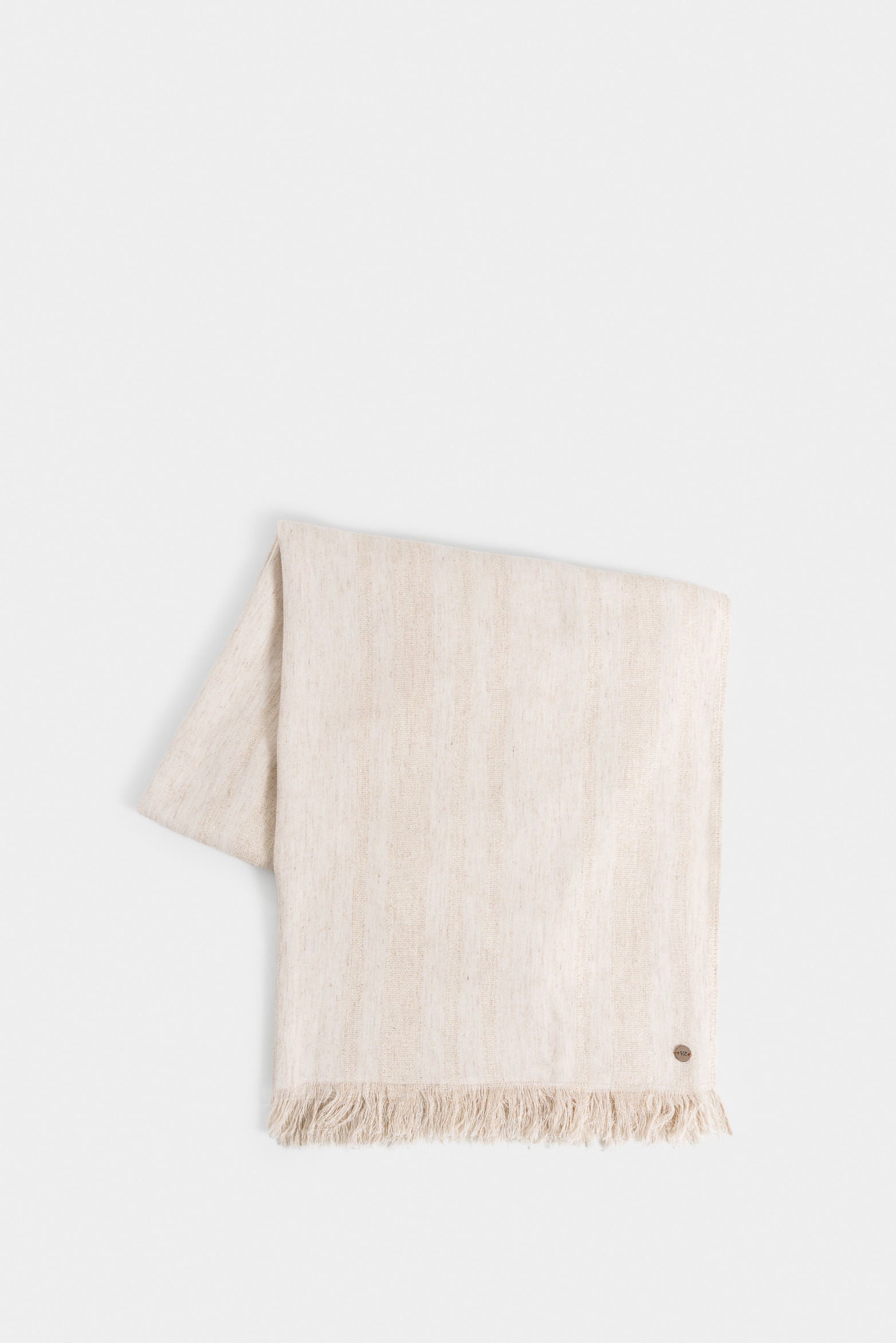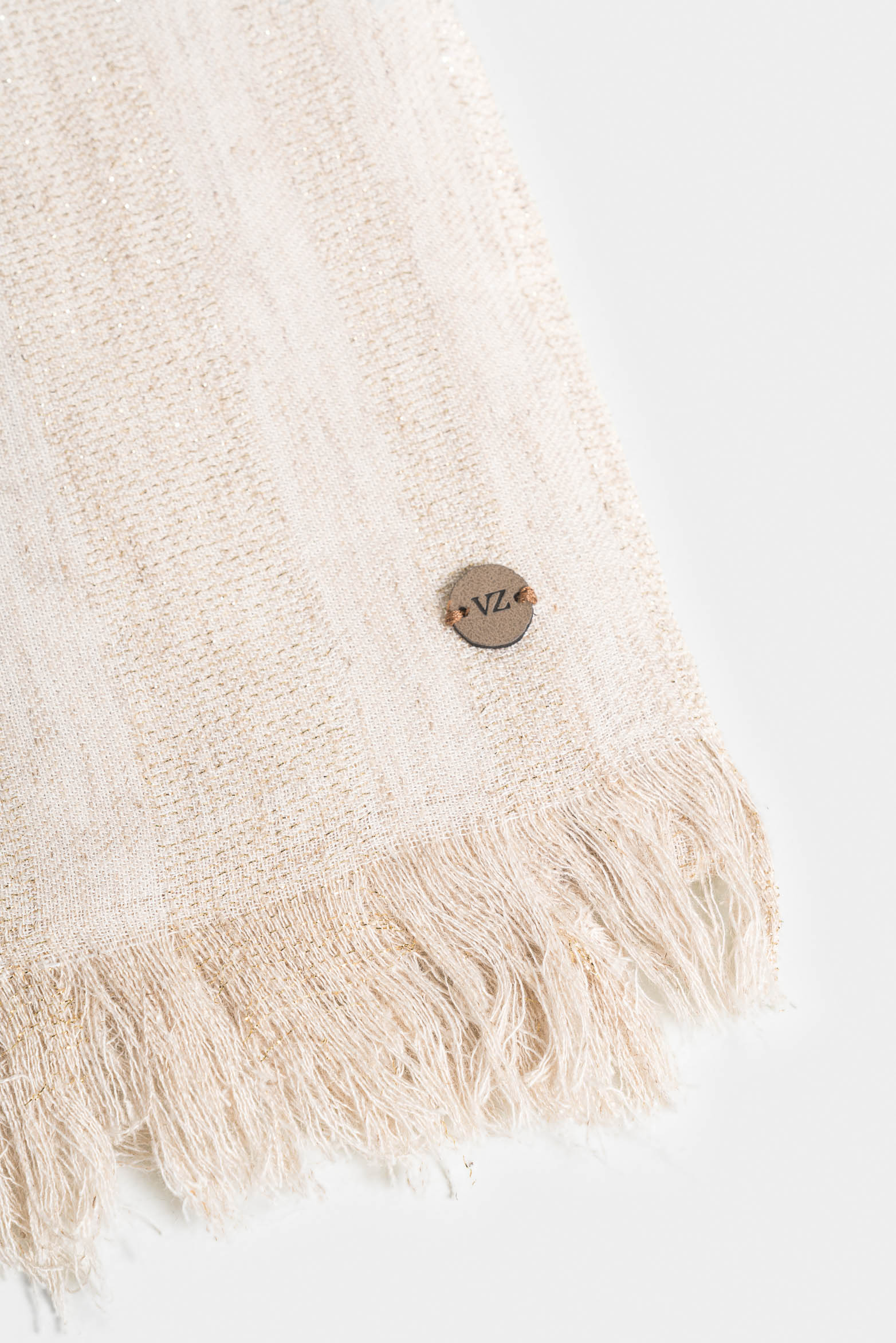 This long pashmina, crafted in a plain weave with shiny lurex threads and frayed edges with tassels, is a fashion statement that fuses functionality with polished aesthetic elements. This design provides a stylish choice for cold weather elegance, offering the perfect accessory to highlight your outfits with a refined touch.