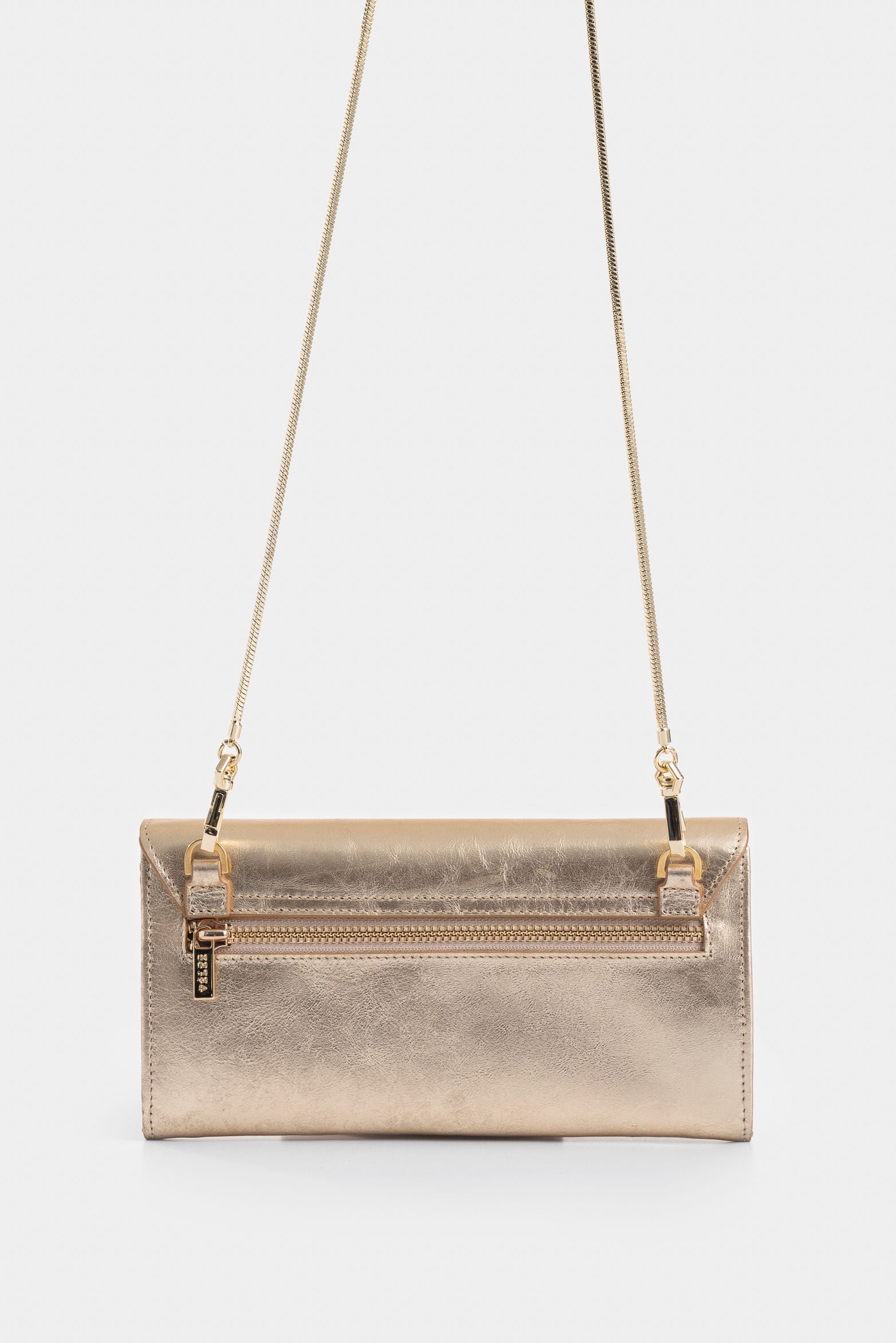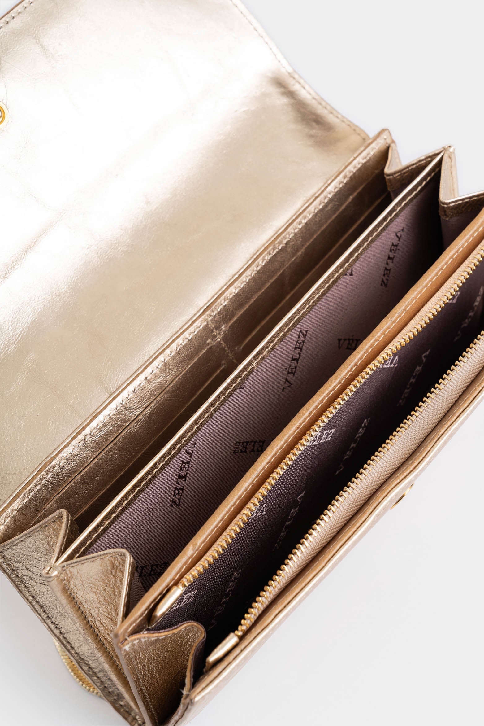 A complement that, with its shine and finish, elevates your total look and gives you the avant-garde touch you seek. Our checkbook holder stands out for its meticulous craftsmanship, as well as the softness and durability of its white gold leather, with neutral tones that harmonize perfectly with various color palettes. Equipped with a flap, snap closure, and RFID protection for your data, this piece invites you to dive into an artisanal luxury experience.