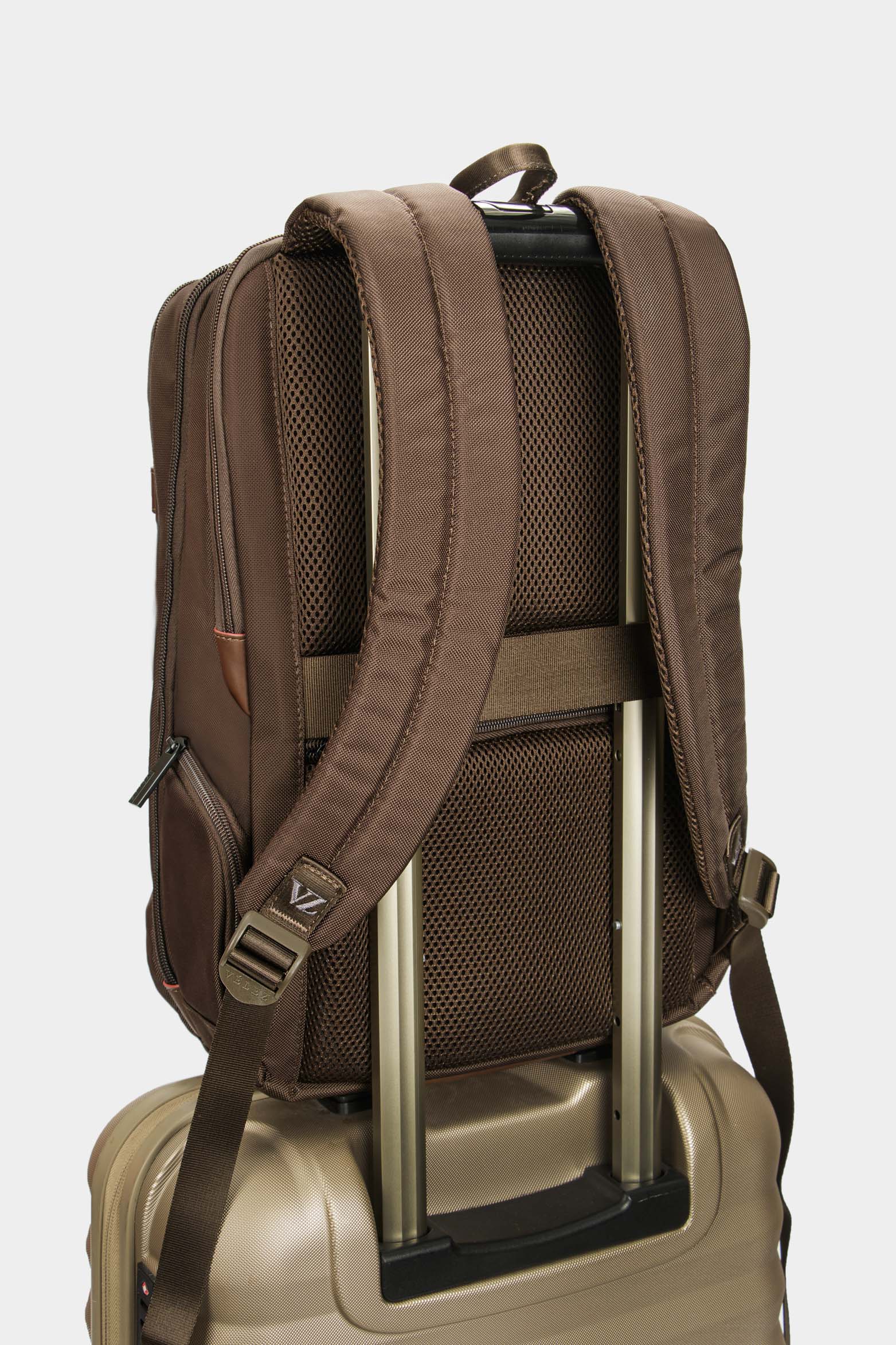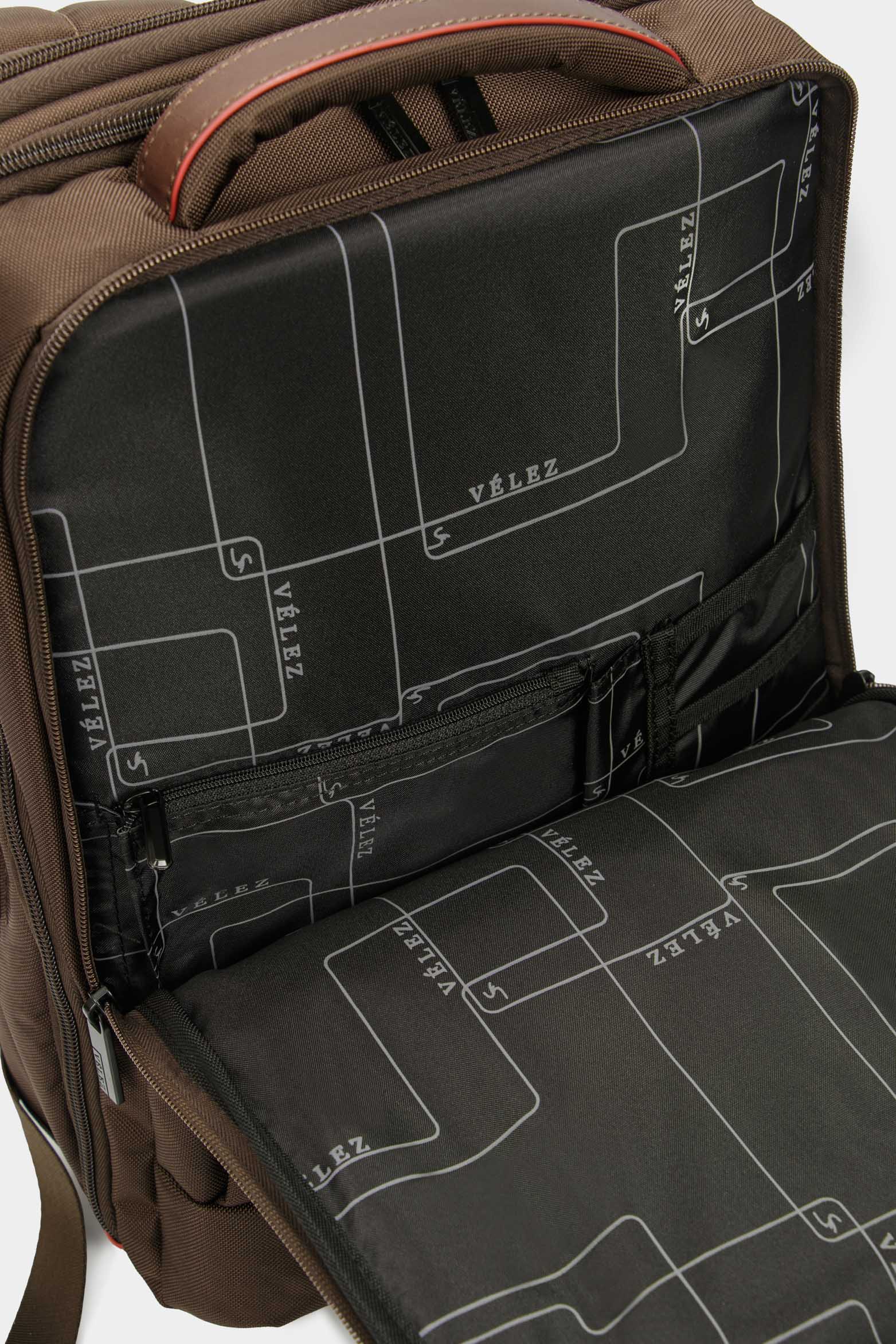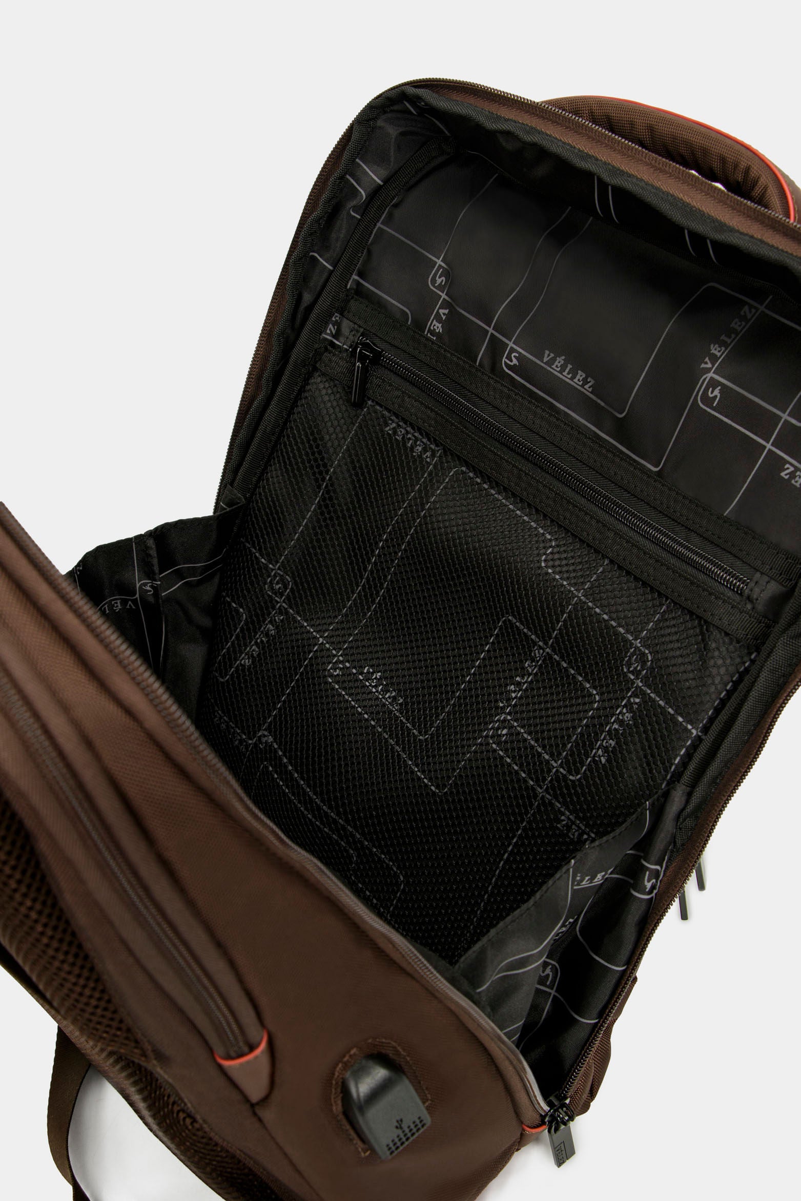 Men’s Kler nylon backpack with a minimalist travel design featuring ergonomic, padded, adjustable and anatomical straps; back trolley strap for attaching to a suitcase; 14” interior PC and tablet compartment; port with USB connection (battery not included); concealed back pocket; quick-access side pocket; three main compartments; color contrast linings and handle with leather insert; product features the Vélez signature quality seal. Ideal for everyday wear.