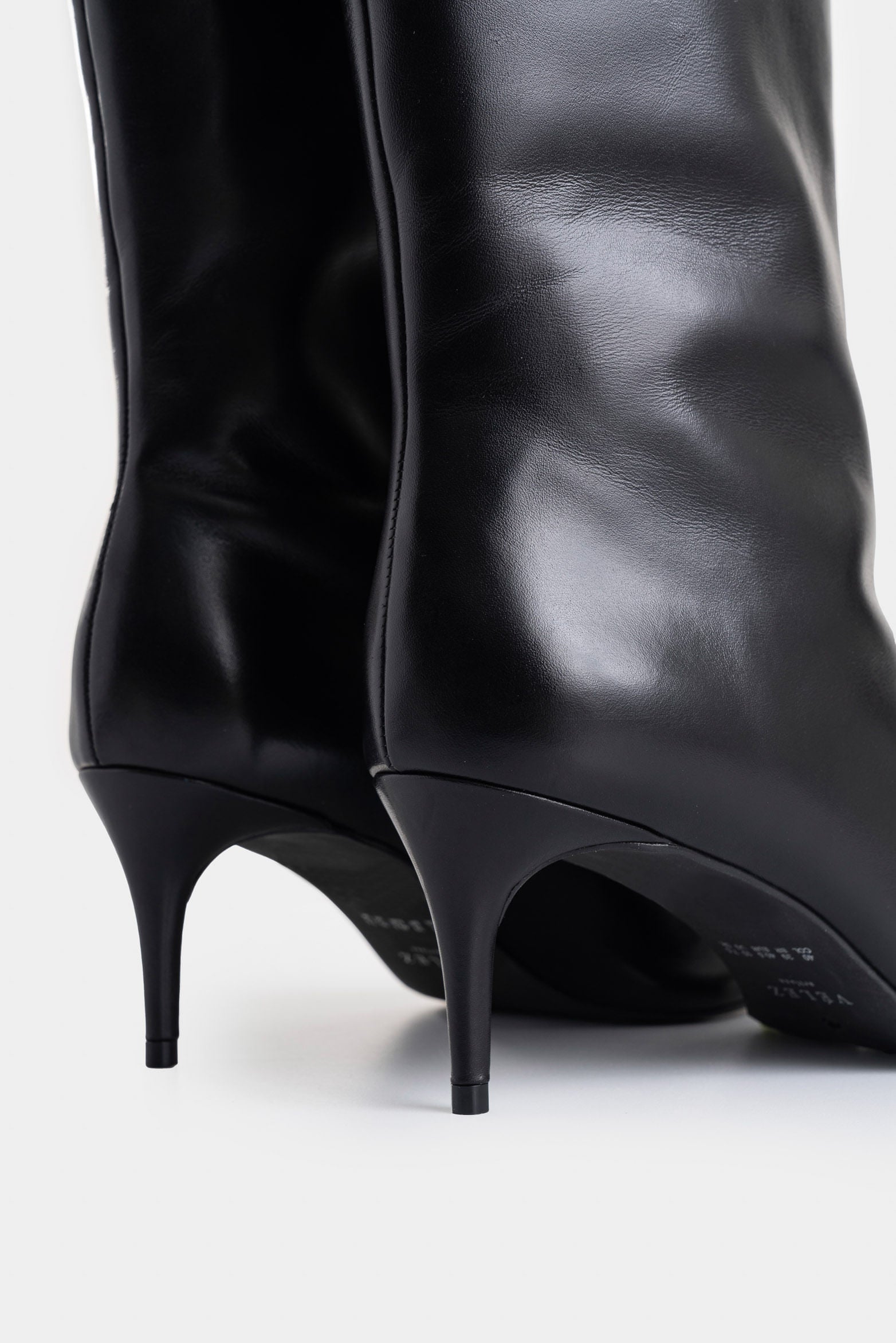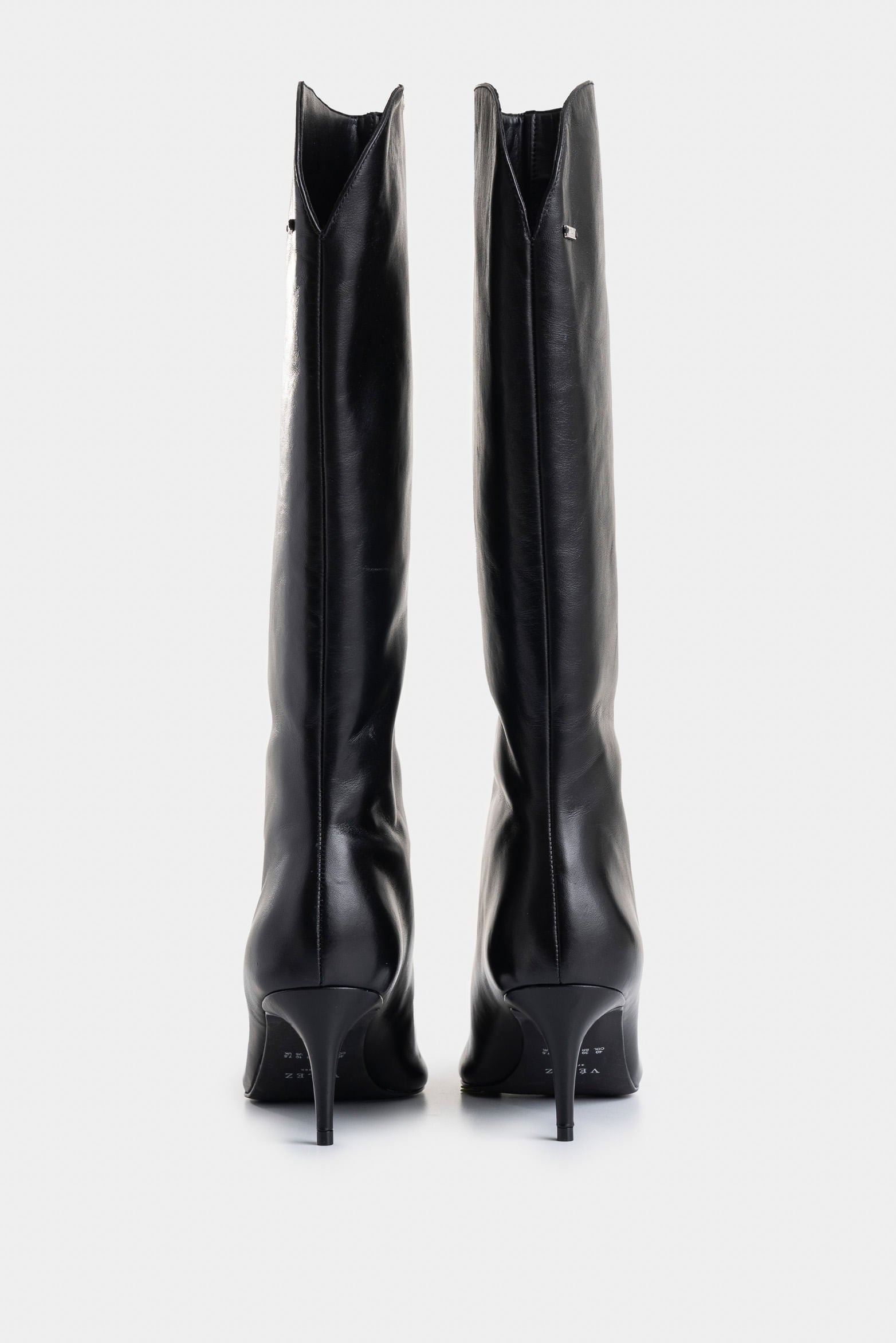 A bold and highly sophisticated silhouette defines these high-shaft boots, crafted with artisanal techniques that captivate. Handmade from soft leather with a subtle shine, they feature a leather-wrapped stiletto heel and an elegant pointed silhouette, creating a clean and refined look. Versatile and elevated, they are perfect for formal occasions as well as pairing with jeans, trousers, or any type of dress, adding an authentic touch to any outfit.