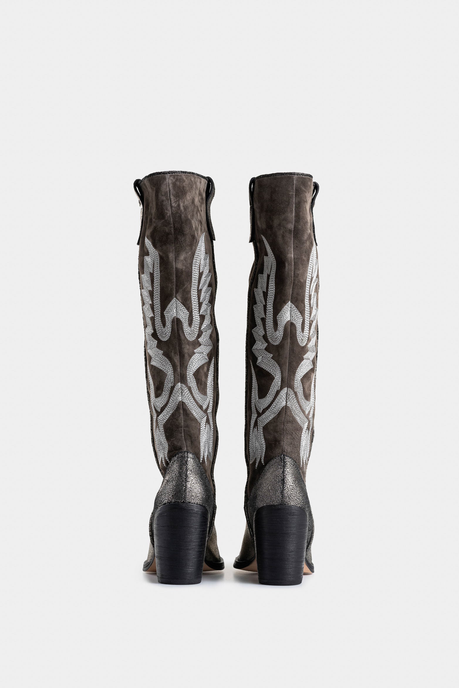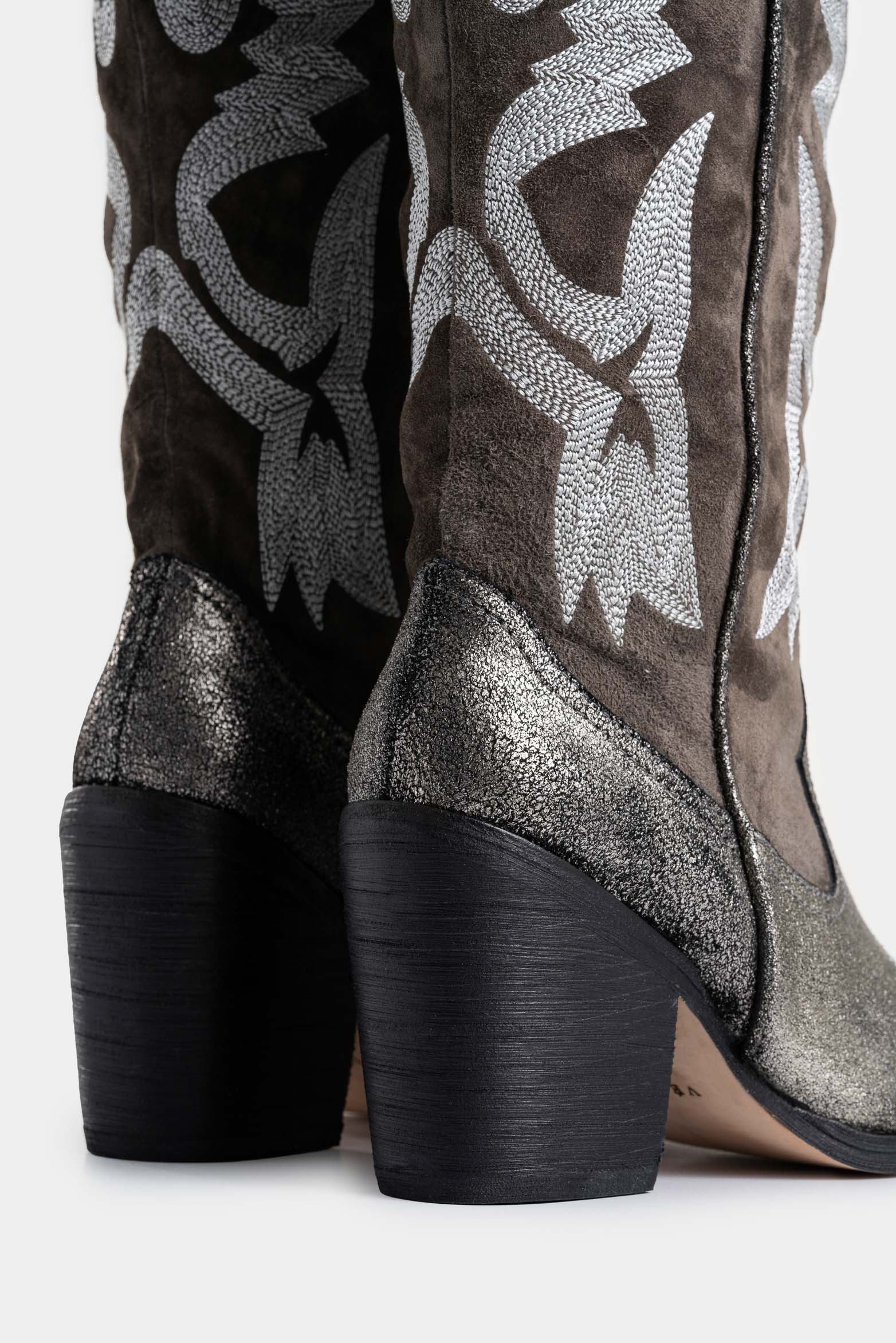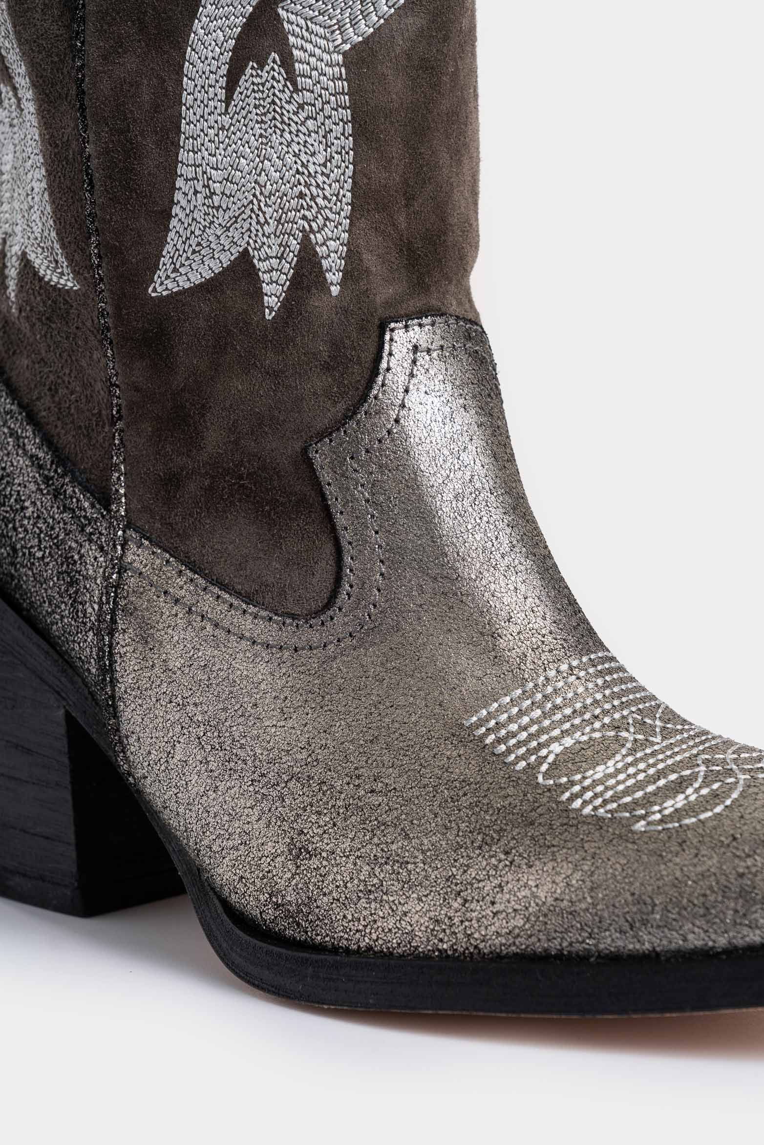 With a legacy of artisanal techniques and a luxurious texture, these western boots reinvent the essence of western style. Crafted from suede and cracked foil leather, their classic tones are reimagined with decorative stitching on the shaft, adding a contemporary twist. Perfect for enhancing short dresses or jeans, these boots elevate any look with their timeless charm and carefully crafted details.