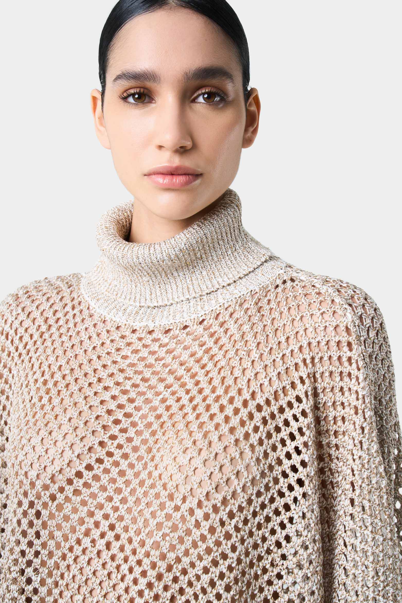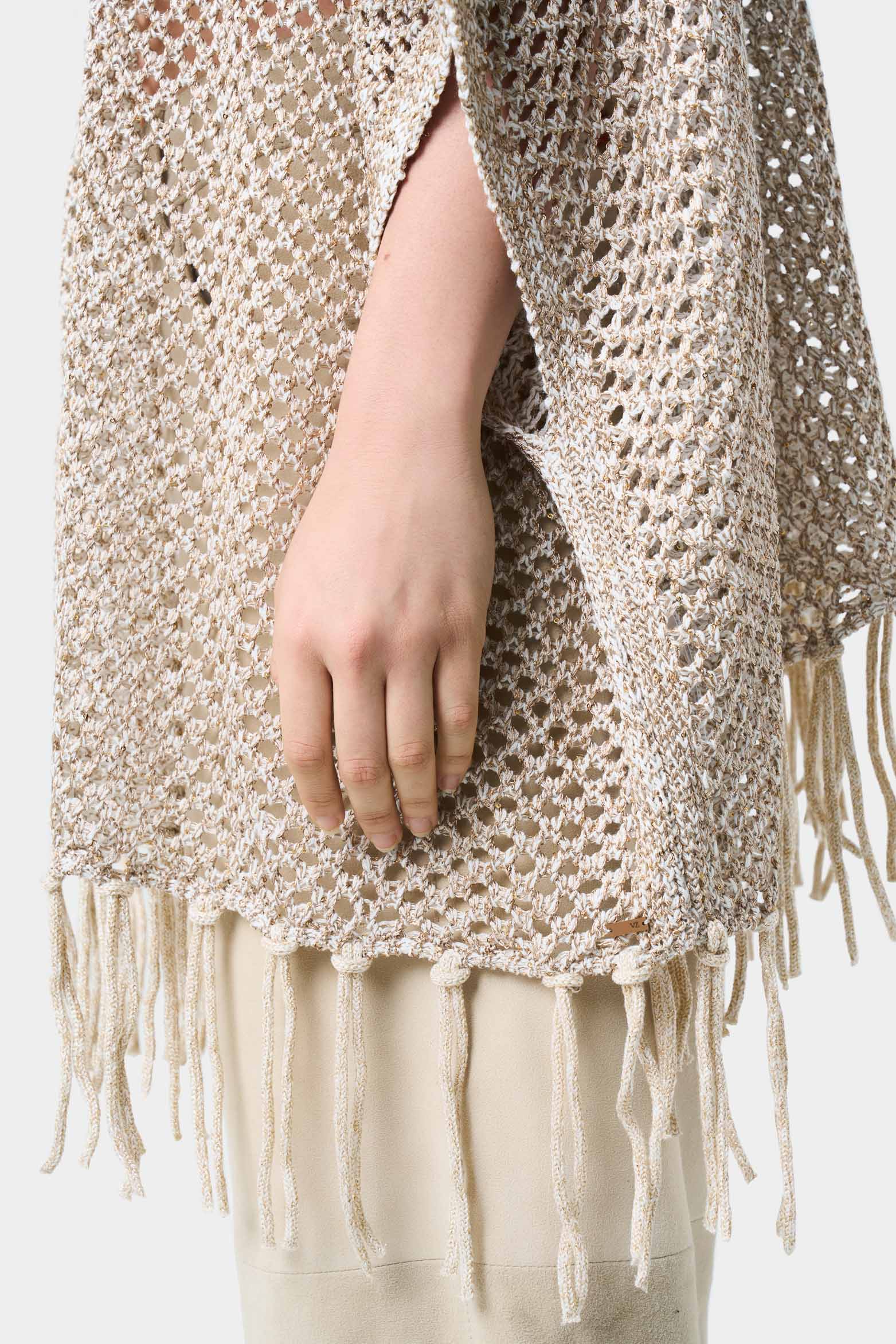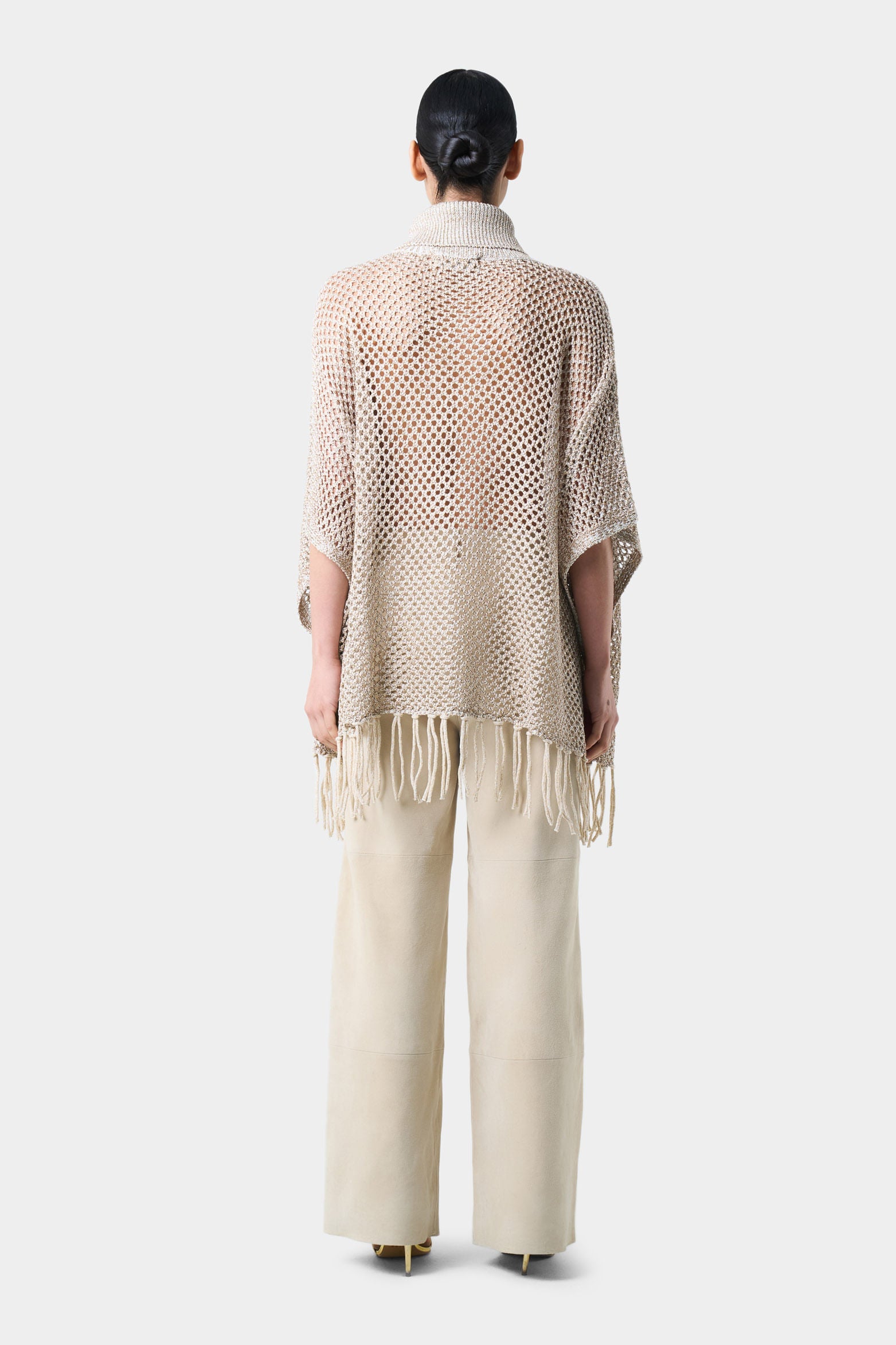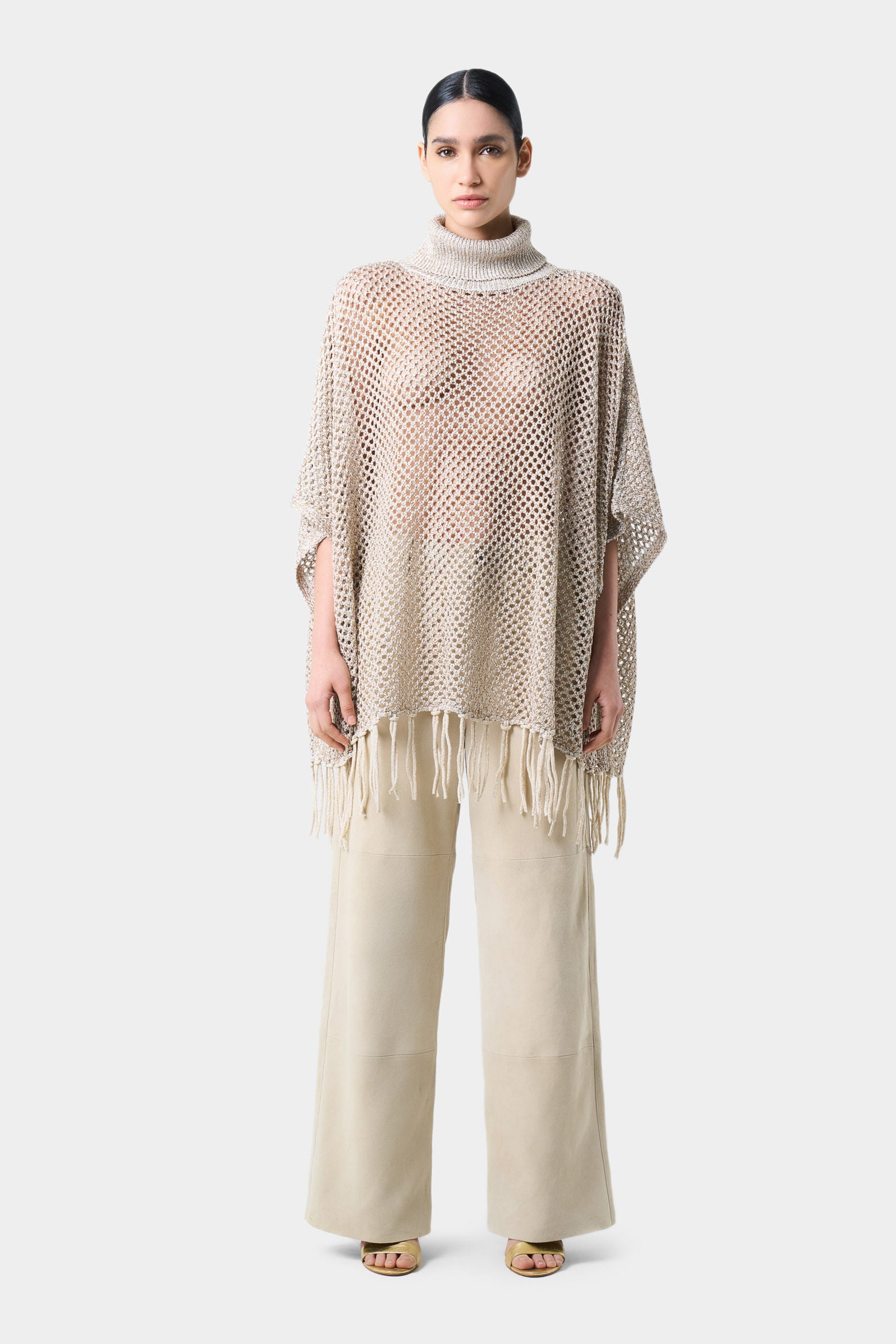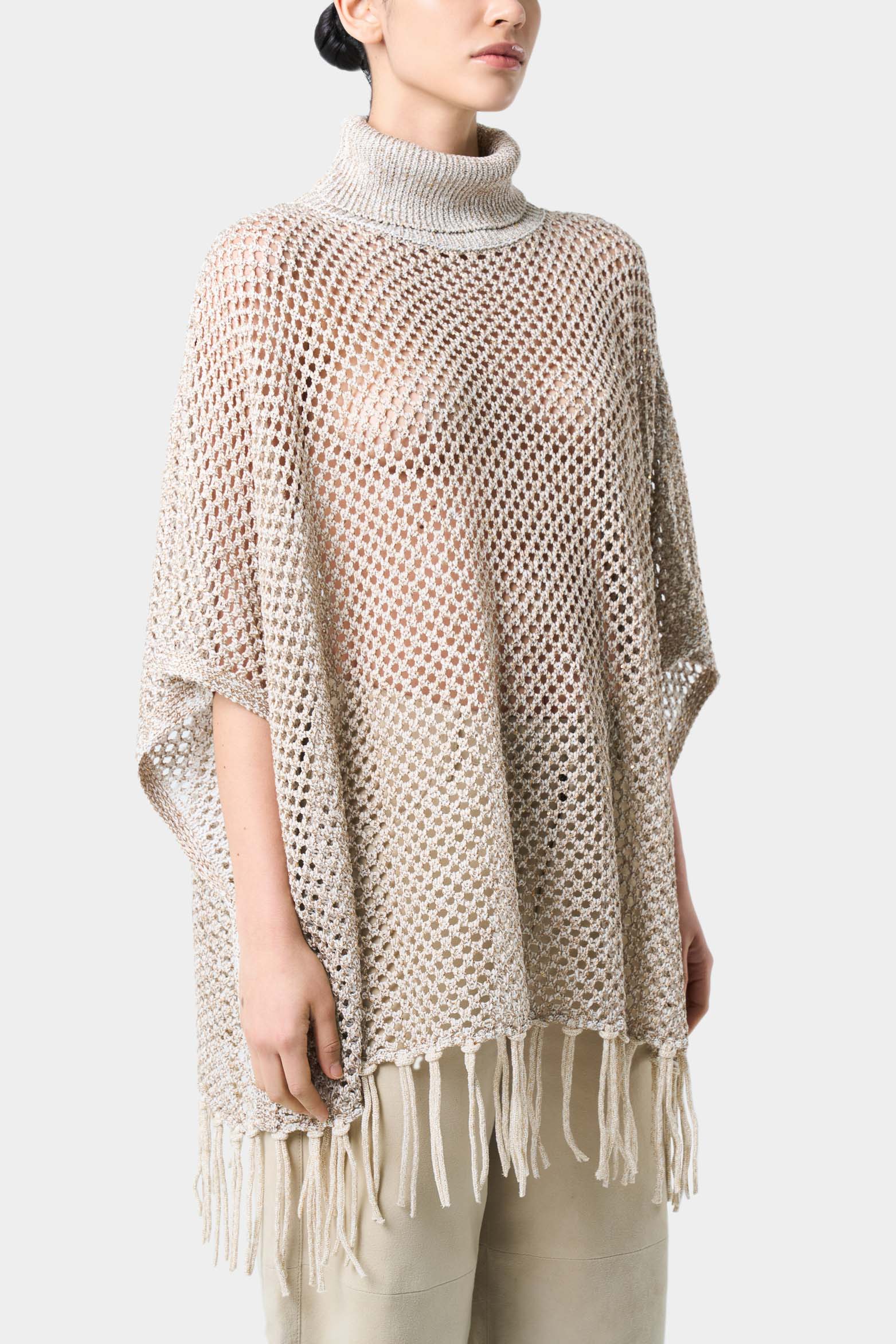 Revive the essence of Colombian culture with a cutting-edge update for winter styling. This straight-knit poncho with sequins elevates your looks, complementing any outfit with a chic touch of shine that enhances the silhouette. The fringes at the hems and its square silhouette add movement and luxurious texture. With a loose fit and turtleneck, this poncho is the perfect piece to transform your outfit into a statement of sophistication.