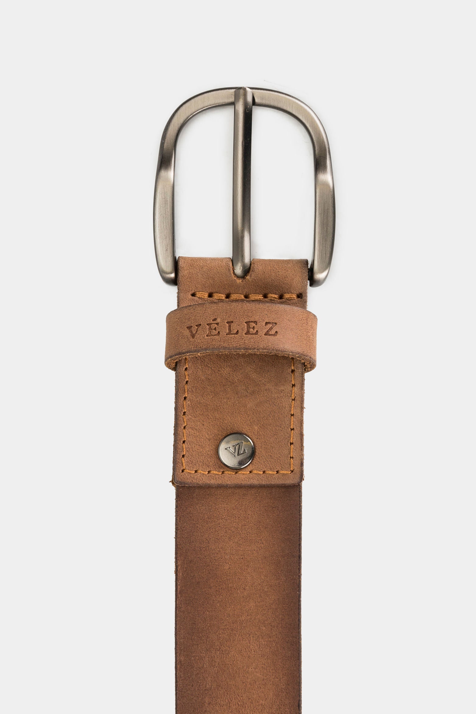 A timeless classic, this smooth leather belt will add a dynamic touch to your casual looks. Featuring a contoured aged effect in a darker tone, rounded buckle with prong and hexagonal tip, this vintage-inspired piece emanates the Vélez handcrafted essence highlighted in the details. This belt is a versatile accessory for everyday looks. Plus, it can be cut to measure at our stores.
