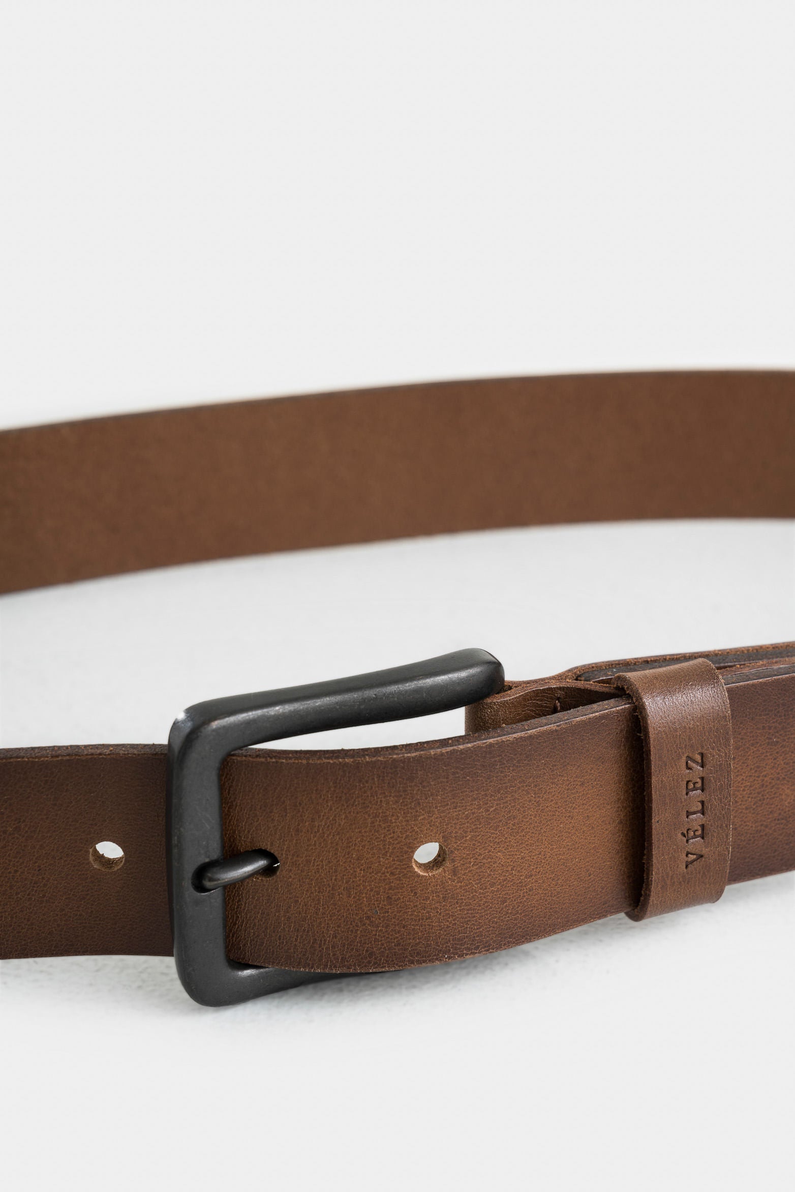 Our Unifaz belt, meticulously handcrafted, embodies the essence of artisanal art and care in every detail. Its black nickel metallic buckle, along with its versatile and multifunctional cross design, makes it a versatile piece for any occasion. The weathered leather with its pronounced grain is finished with an aerograph technique, giving it depth and dimension, while the trapezoidal tip adds simplicity to its silhouette. This belt can be custom-fitted at any Vélez store, providing a tailored touch to your look.