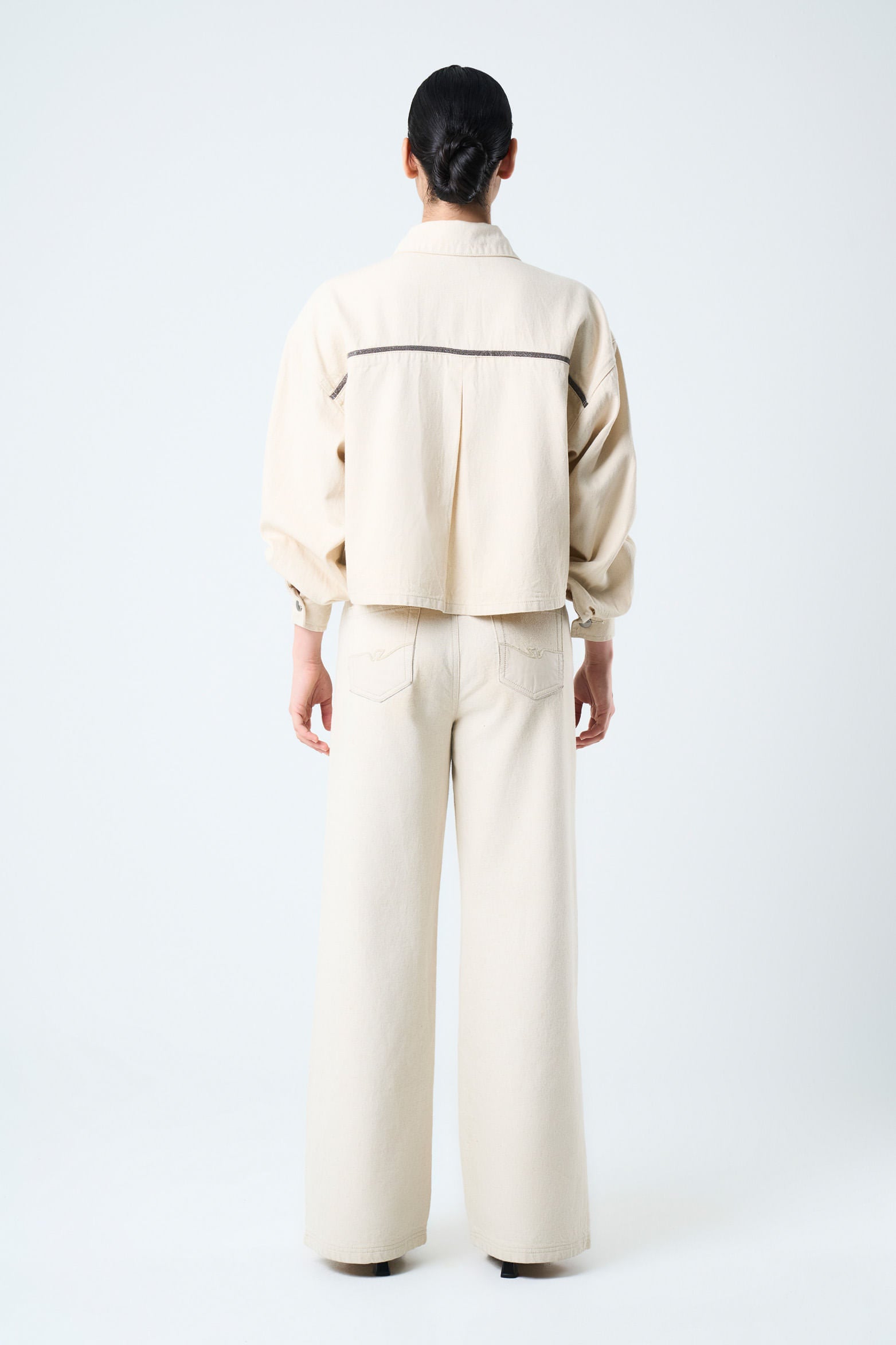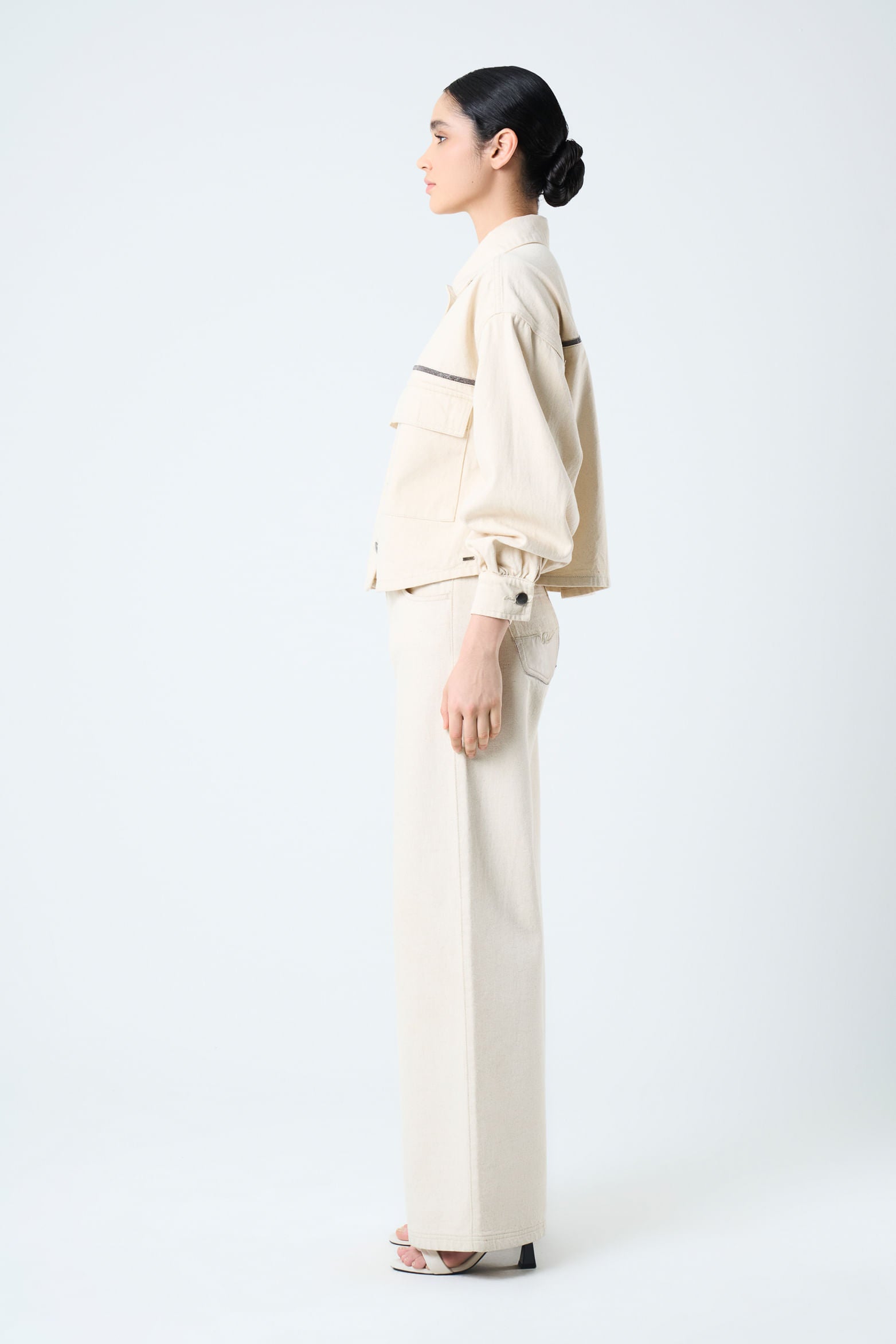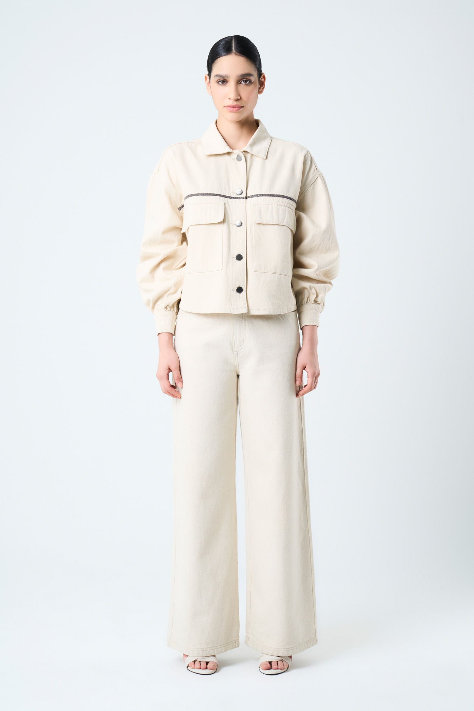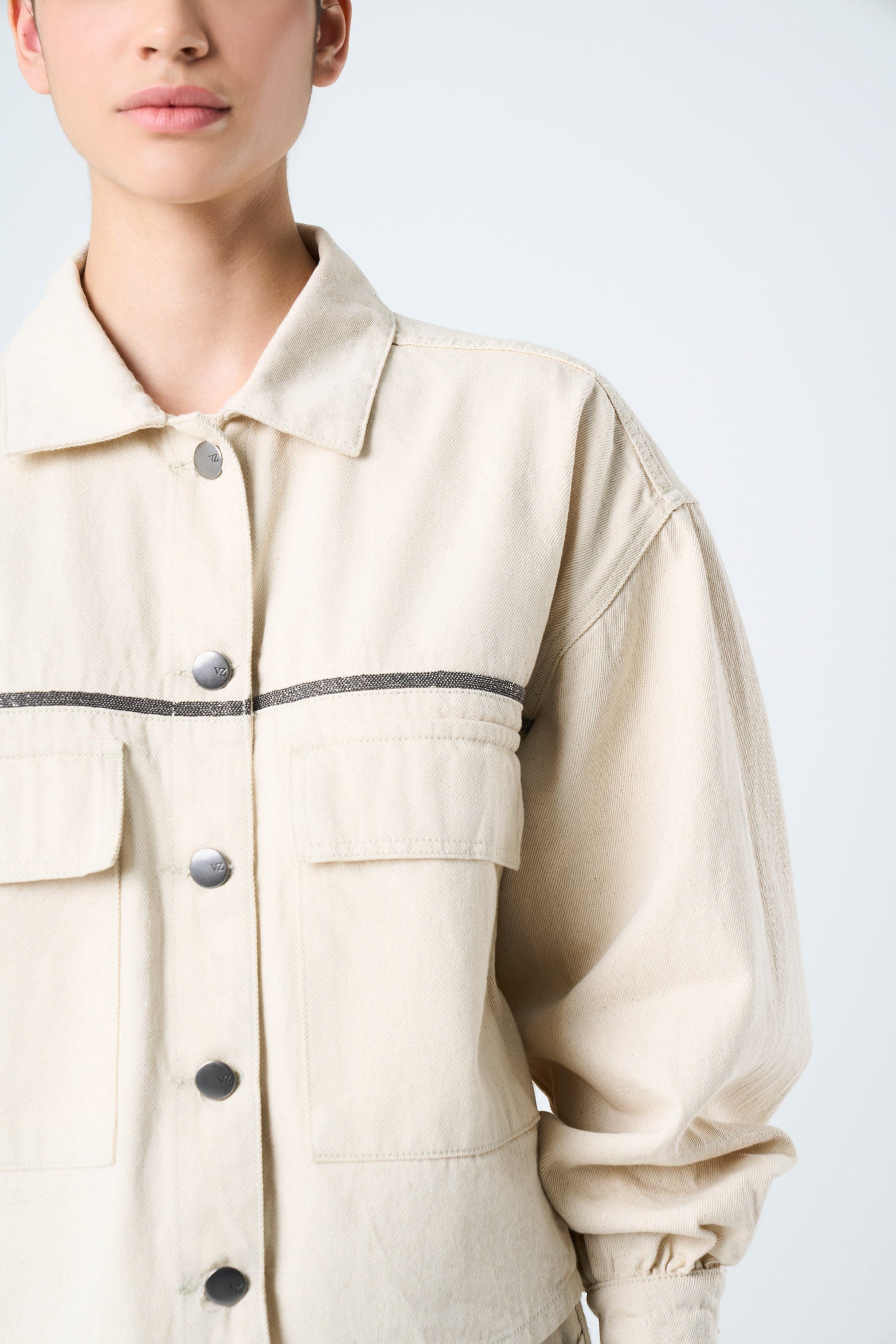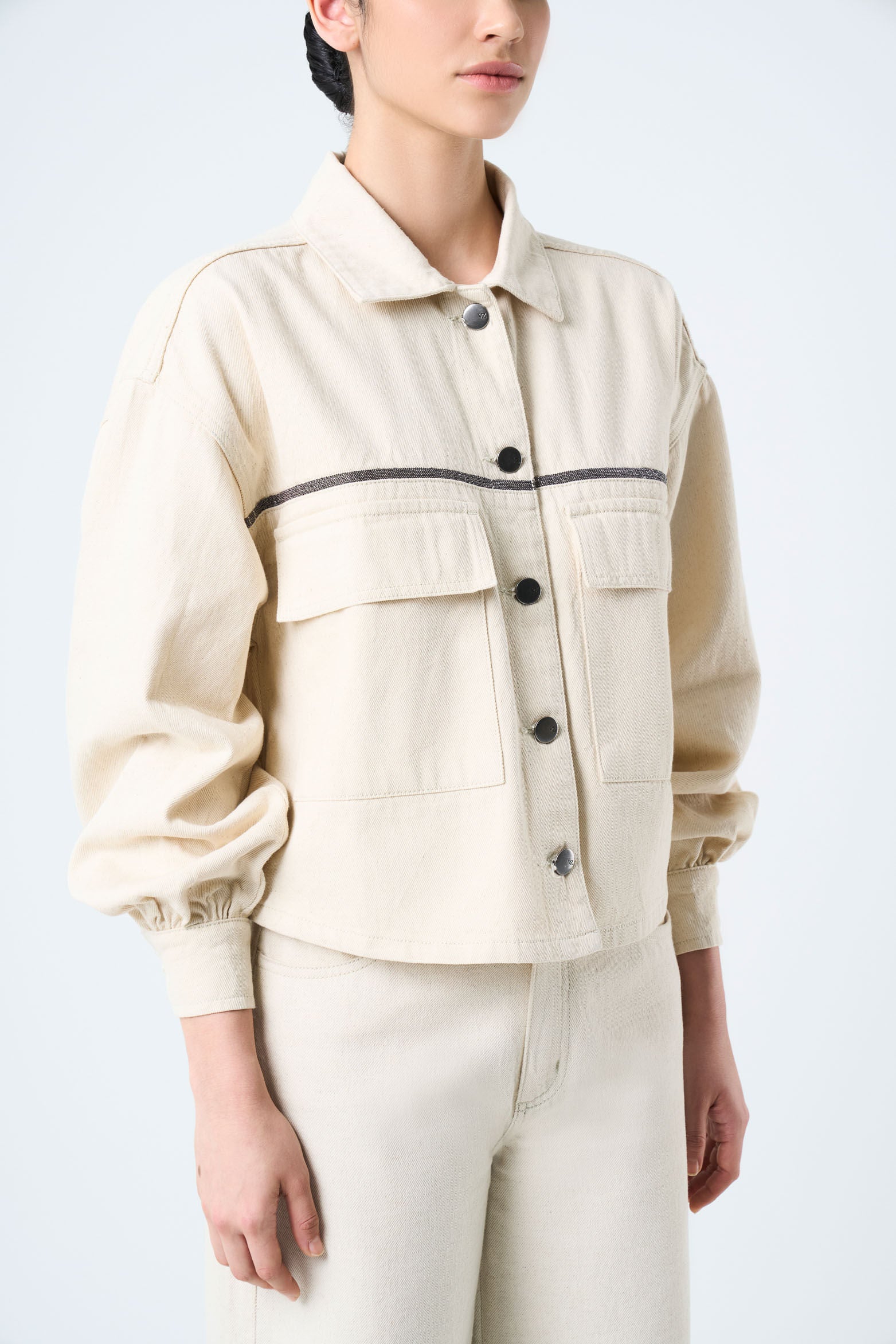 Details that tell stories and designs that transform an outfit into an identity. This bull denim jacket, with a roomy fit and oversized silhouette, captures the essence of timelessness and a love for luxury craftsmanship. The beaded millaré on the yokes and the snap buttons add character, while the shirt collar and flap patch pockets offer functionality. Handcrafted, each piece reflects exceptional texture and sophistication.