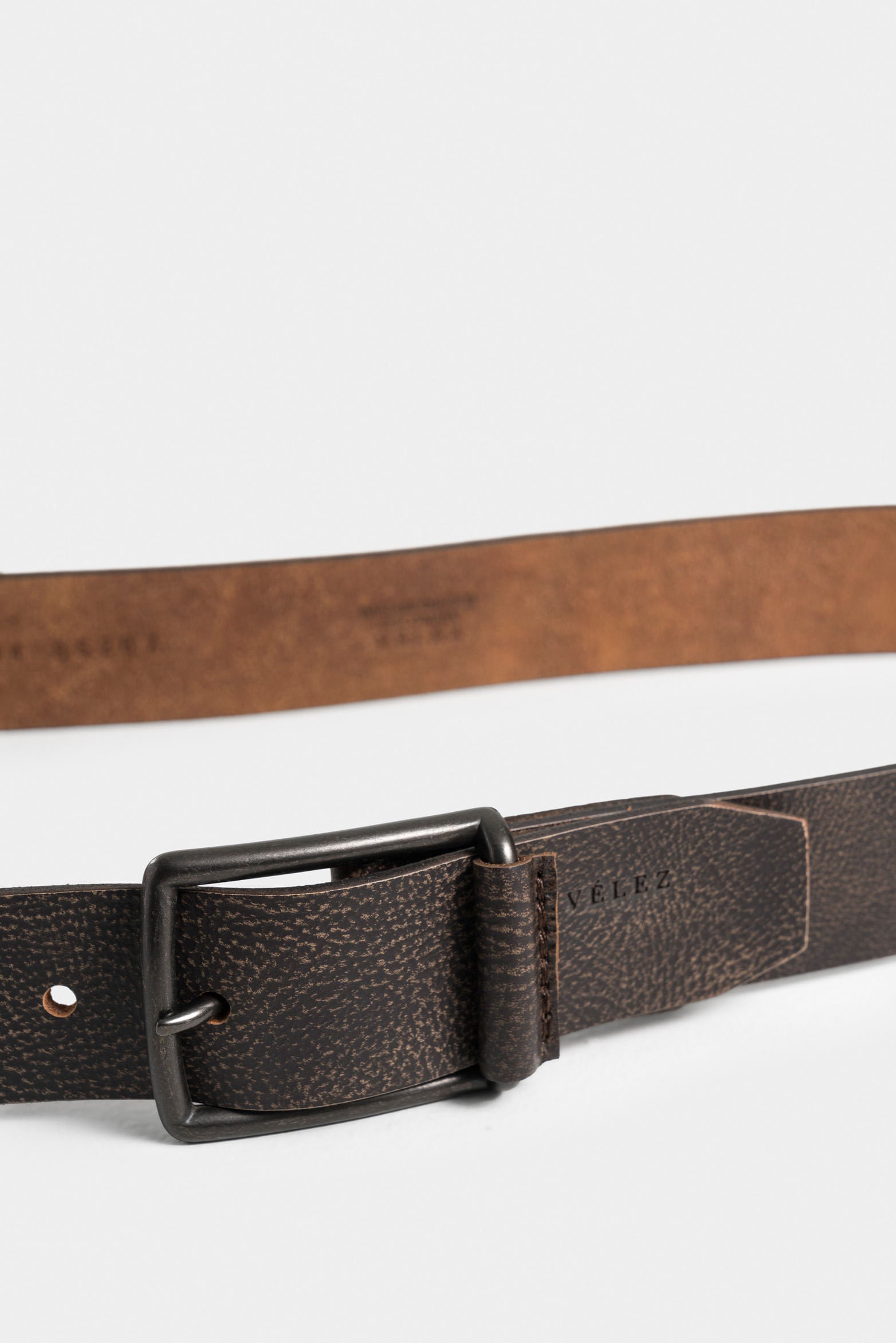 Give your wardrobe a vanguard edge with our Onega unifaz Vélez belt for men, an essential accessory that captures a minimalist style. Its sophisticated leather-covered square buckle, along with heat-stamped trapezoidal tip, lends a distinctive and sophisticated air. The hand-finished aging effect on the leather highlights its authenticity, making each piece unique. With the possibility of personalized adjustment in Vélez stores, the perfect fit is guaranteed. This leather belt is the perfect complement to elevate any look from casual to formal, offering an unmatched dose of elegance.