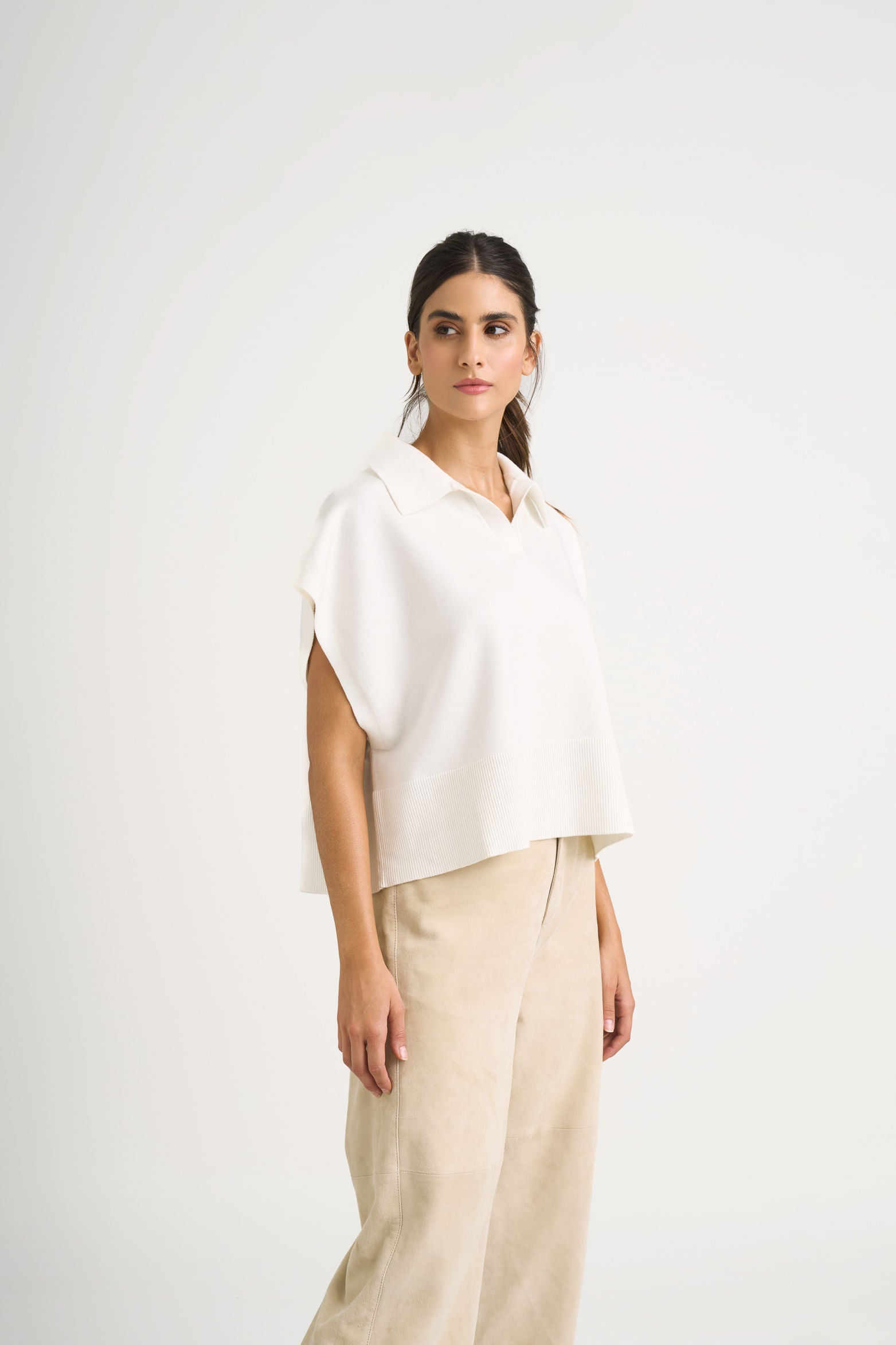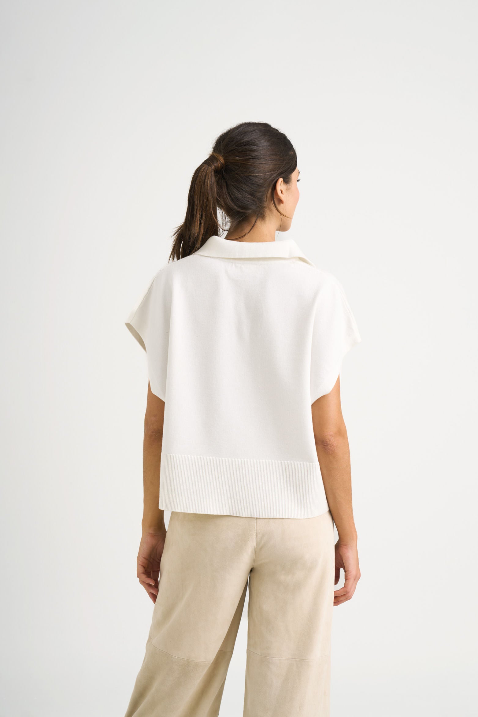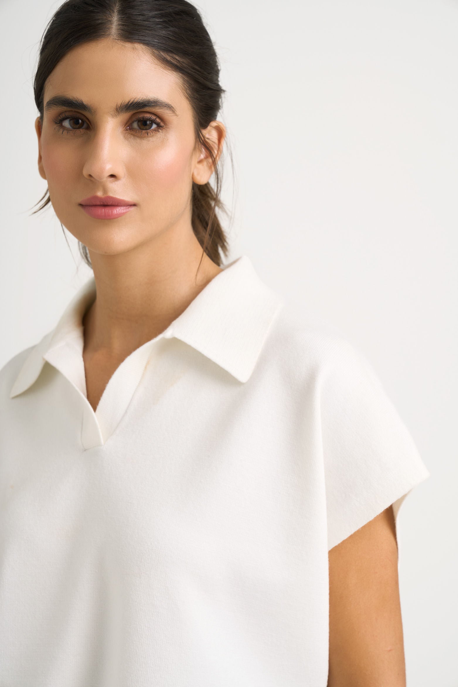 In a modern landscape where classic styles are reinvented for timeless, comfortable outfits, our boxy-fit polo shirt is born, evoking the nostalgia of eighties designs. Its polo collar with placket infuses sophistication, while its oversized fit and integrated sleeves offer a perfect balance of comfort and style. This versatile piece adapts to any look, from a vintage vibe with flare jeans to a more formal style with high-waisted leather pants. A must-have for any contemporary woman's wardrobe.